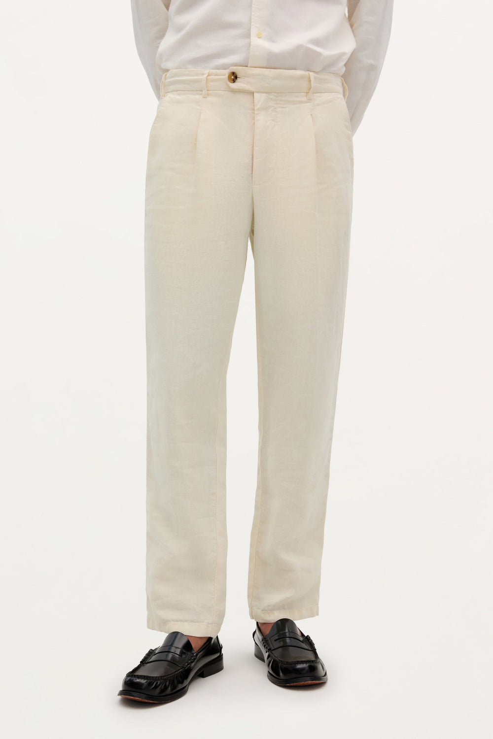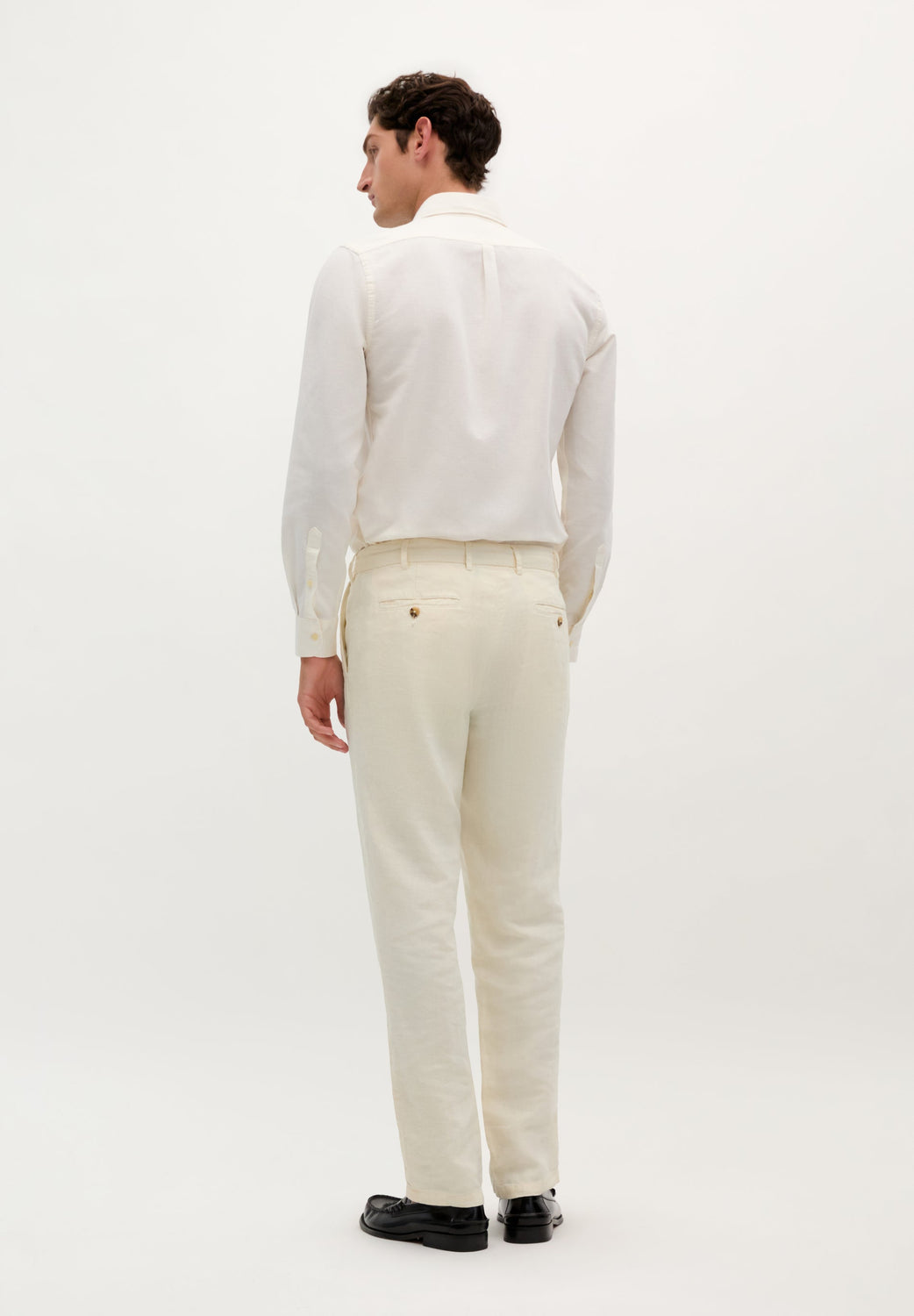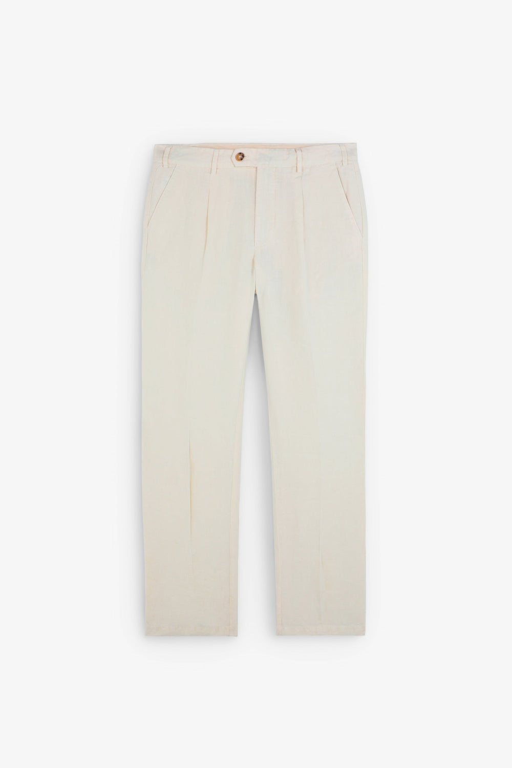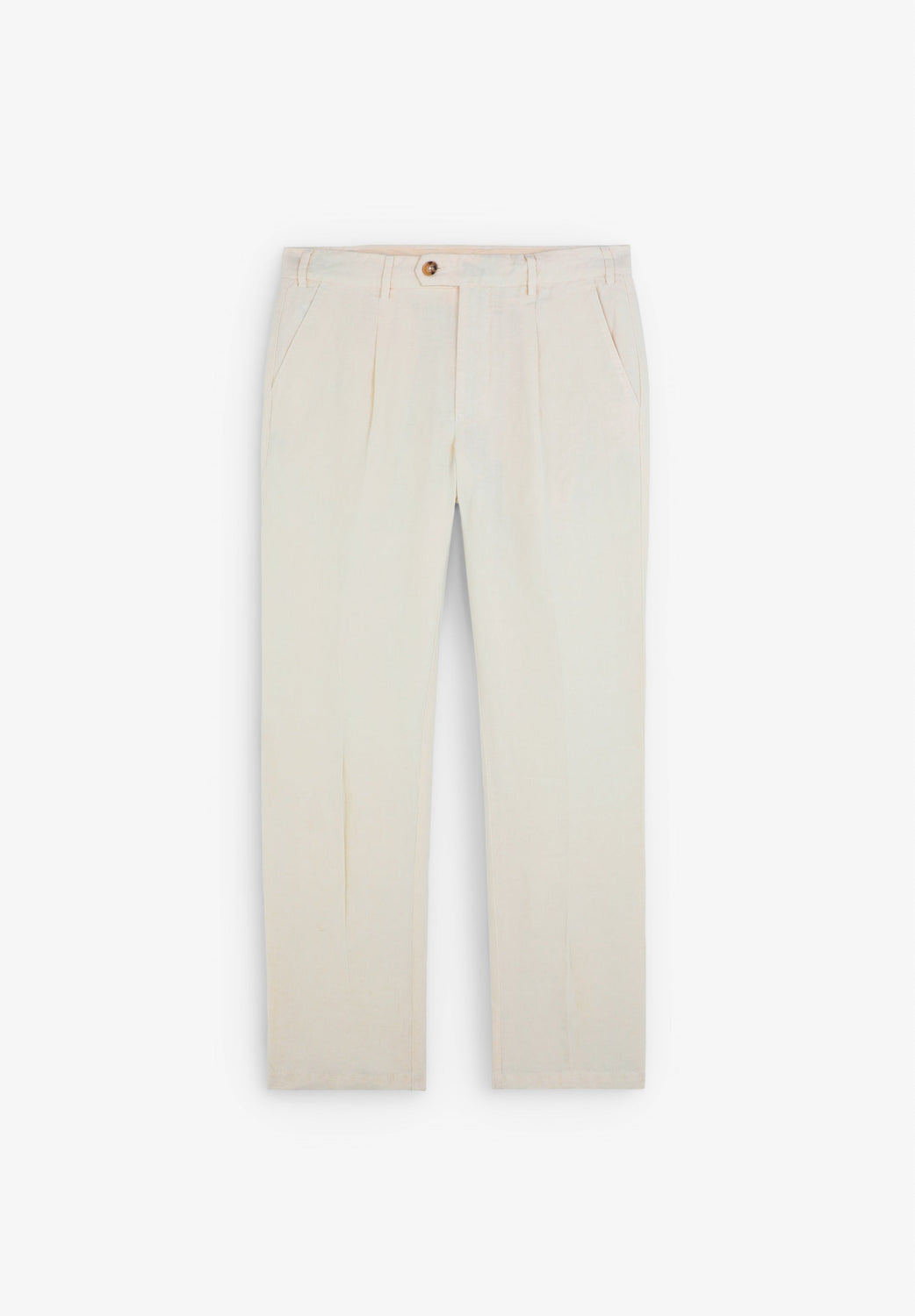 Trousers made of 100% linen fabric. Regular fit with darts, button and zip fastening with side pockets. Belt loops detail.
