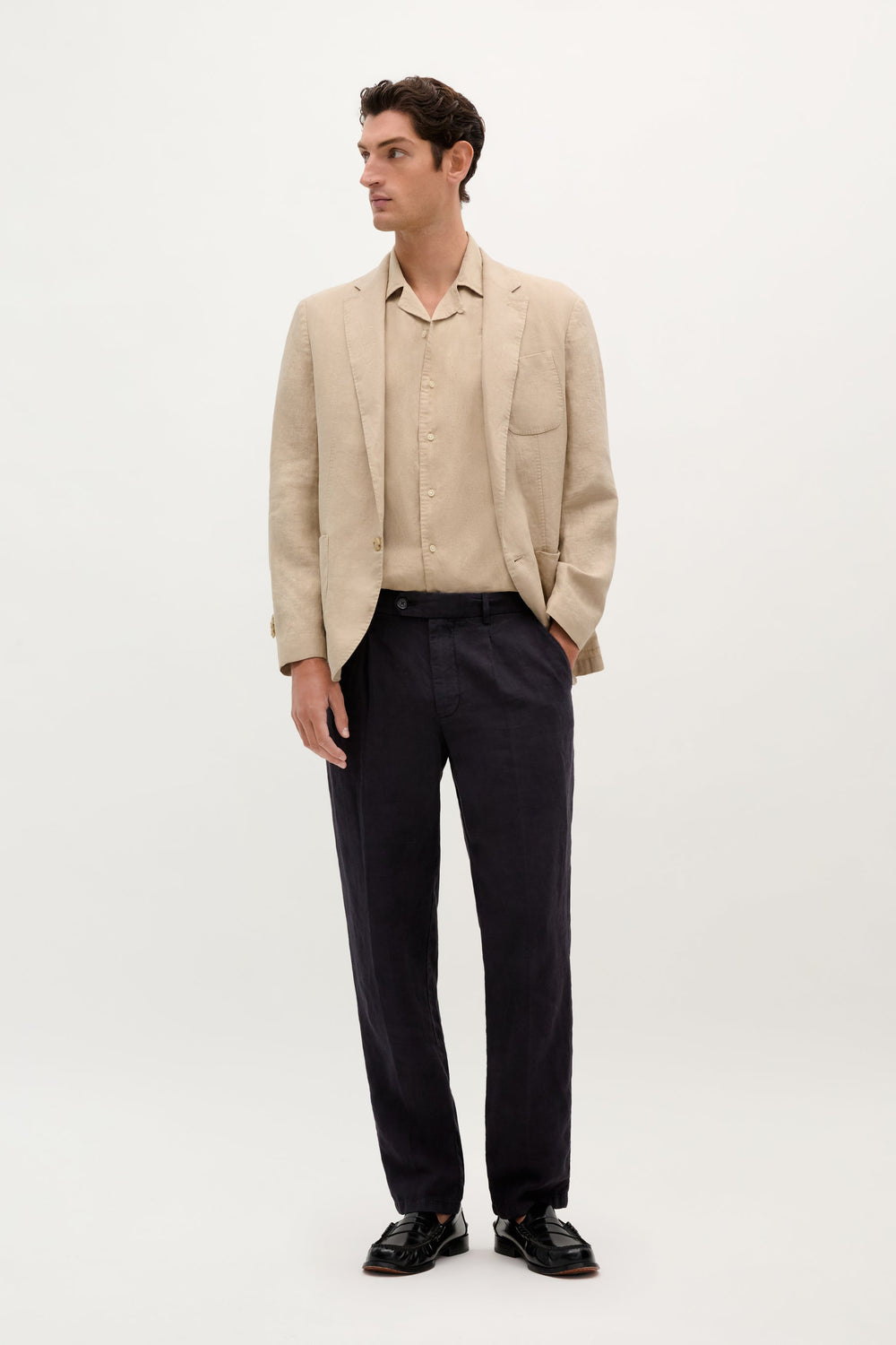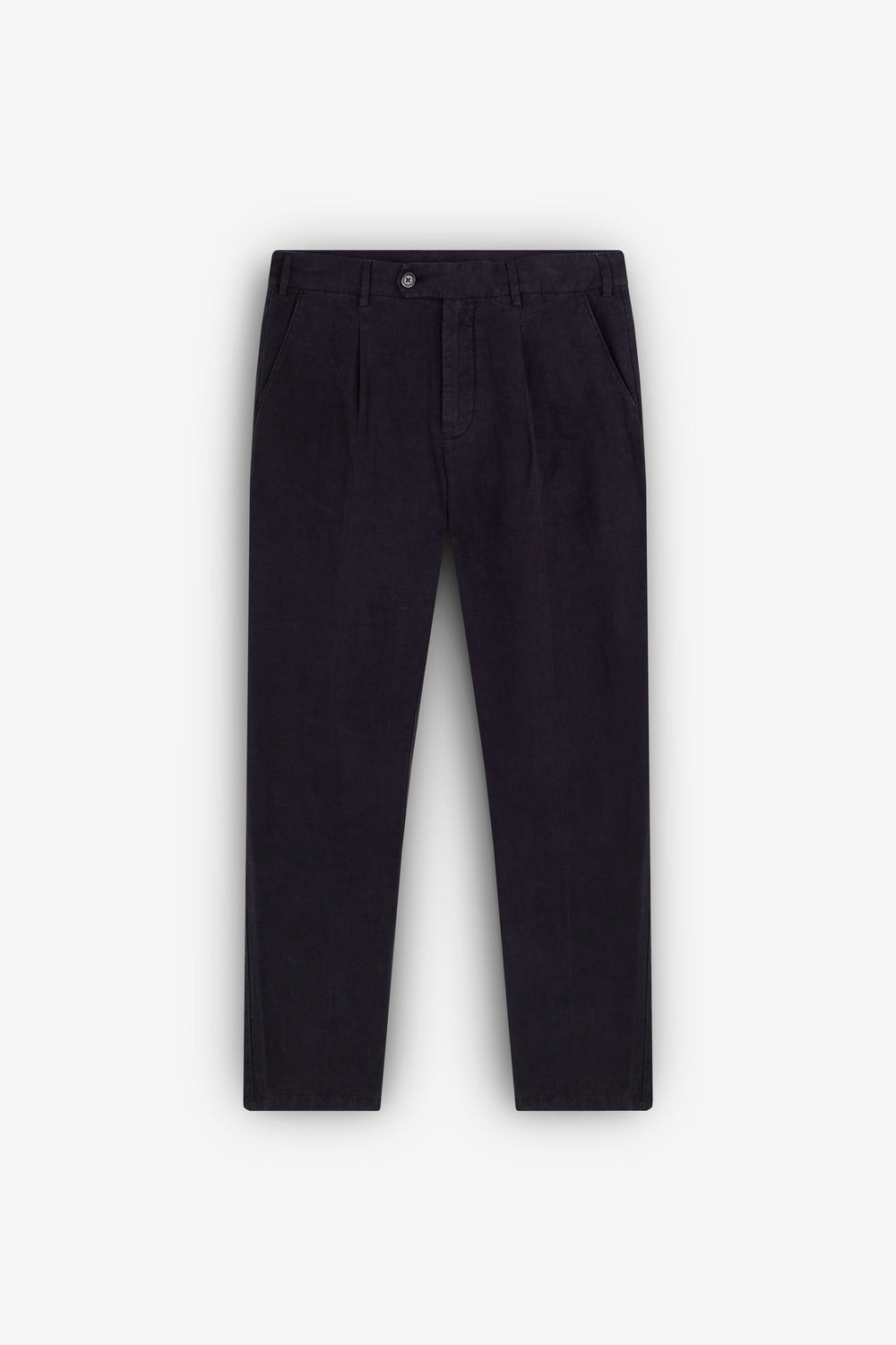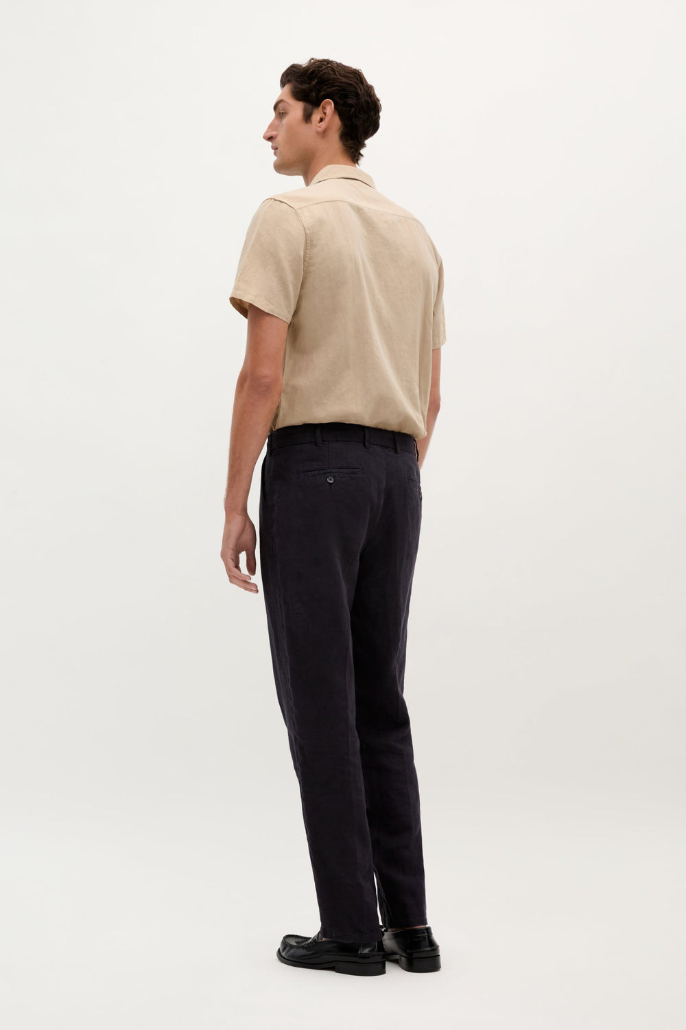 Trousers made of 100% linen fabric. Regular fit with darts, button and zip fastening with side pockets. Belt loops detail.
