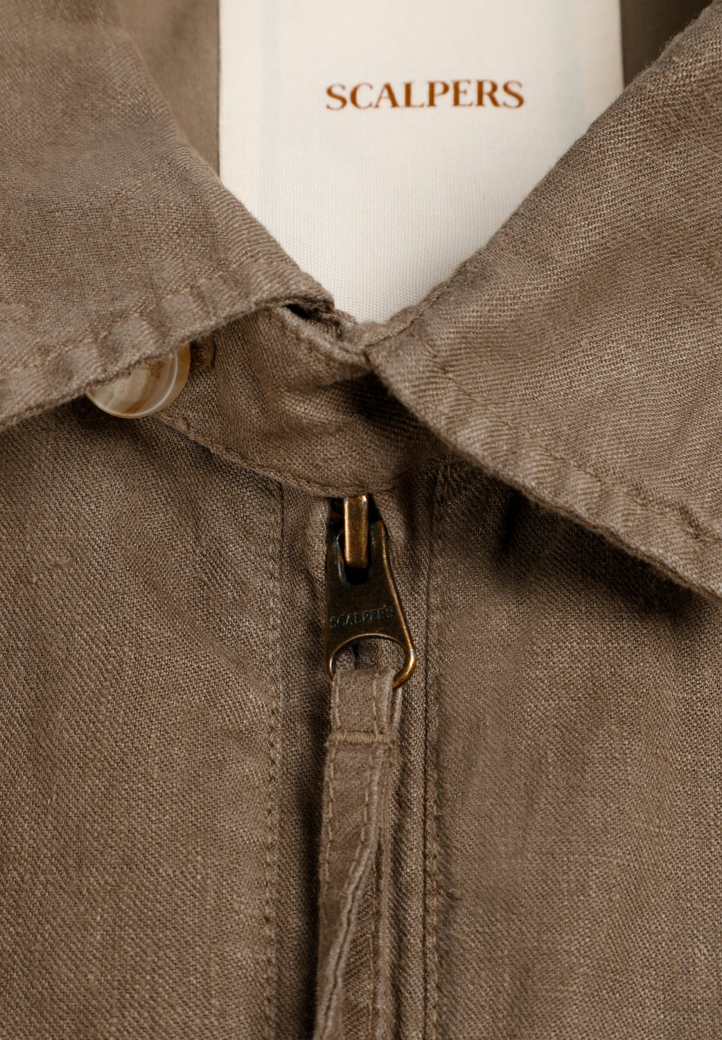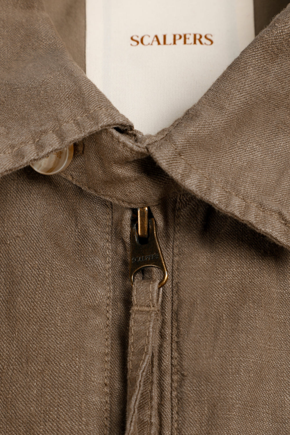 Jacket made of 100% linen. Shirt collar. Long sleeves. Adjustable double buttoned cuffs. Double slider zip fastening. Pockets on the front. Regular fit.