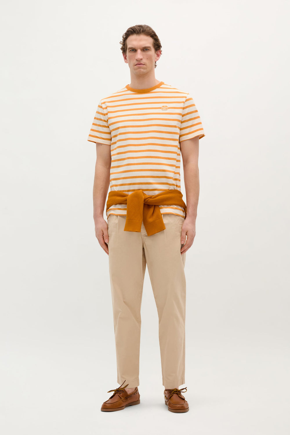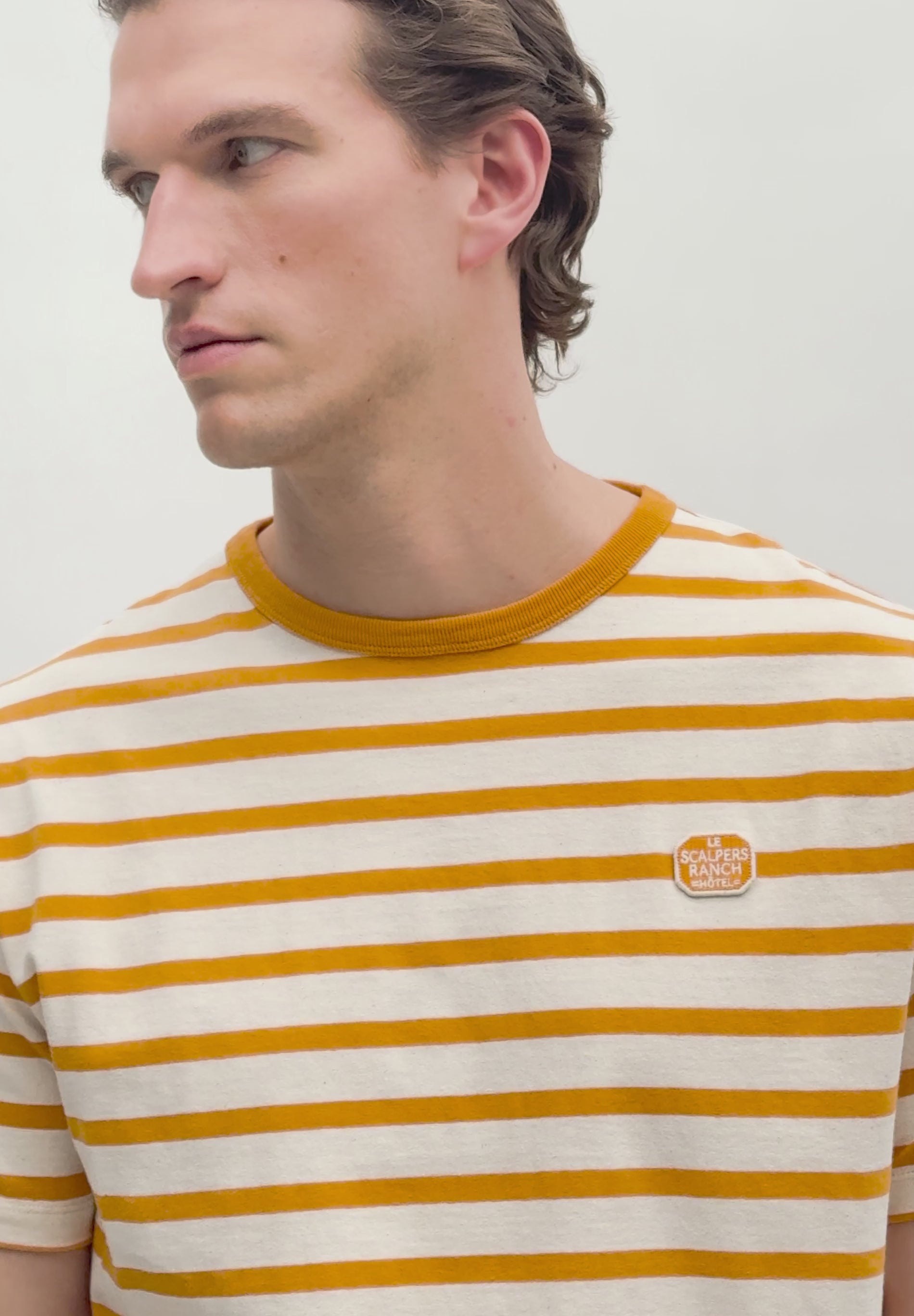 Striped T-shirt in rustic fabric. Made of 100% cotton. Regular fit. Round neck. Short sleeves. Chest patch with logo.
