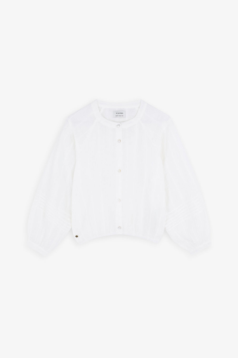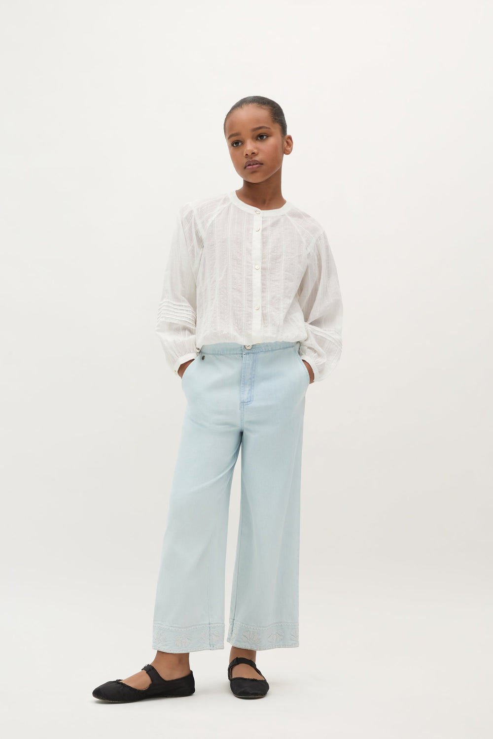 Cotton shirt with stand-up collar. Elasticated detail on hem and cuffs. Embroidered details on sleeves. Front button fastening.