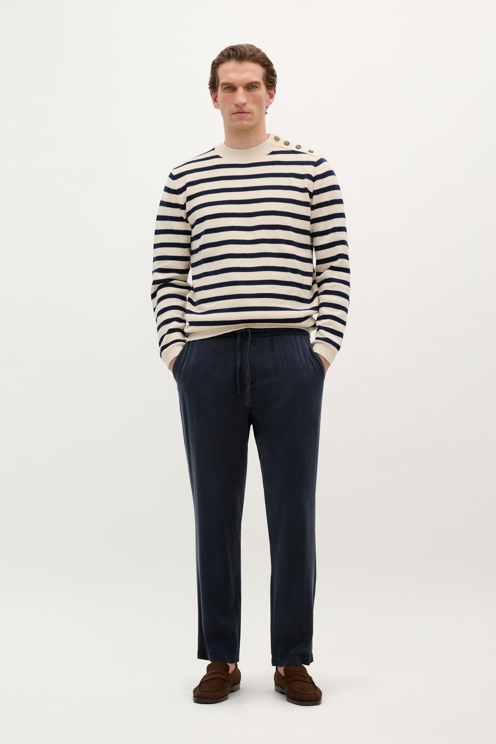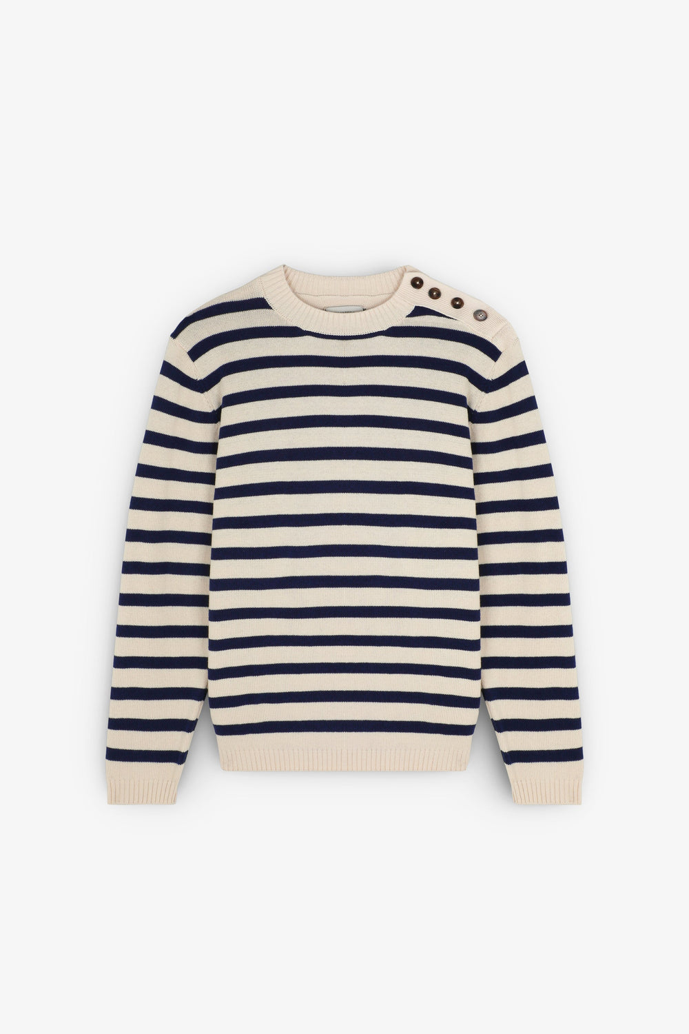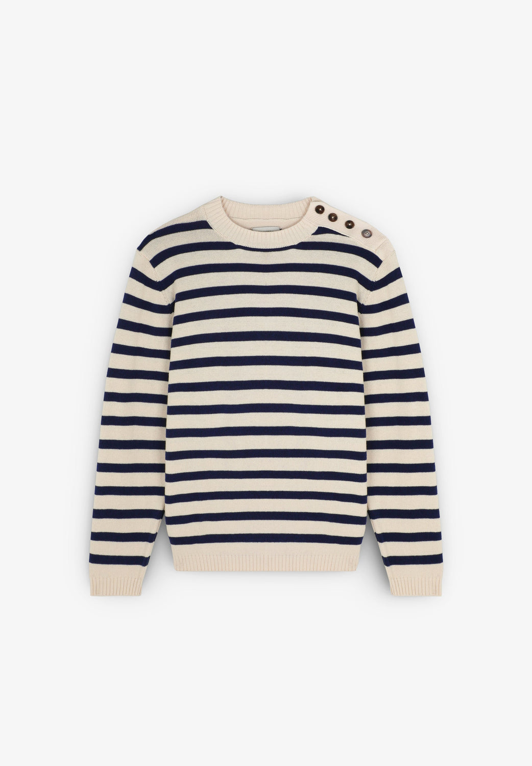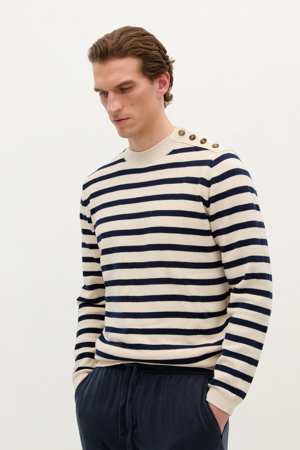 Knit sweater. Made of a cotton blend. Round neck in contrast ribbed trim. Regular fit. Button detail on the shoulder. Long sleeves with contrast ribbed cuffs.