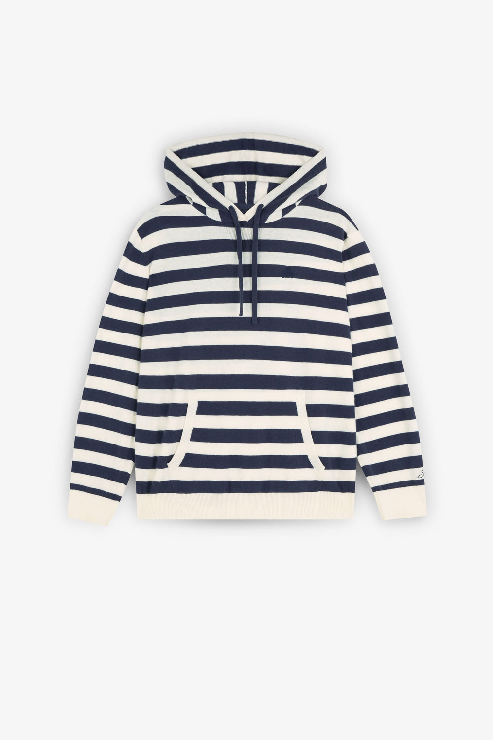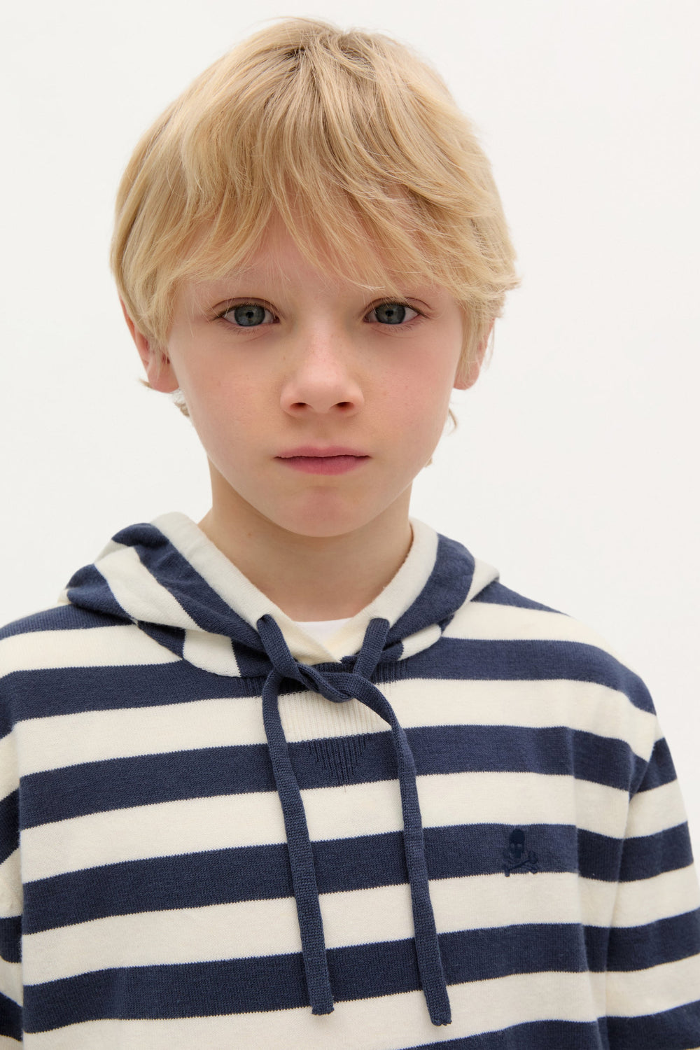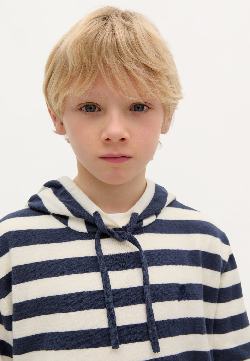 Striped sweater with hood and contrast details. Made of 100% BCI cotton. Regular fit. Collar with adjustable hood. Long sleeves with contrast cuffs. Pouch pocket. Contrast embroidered skull detail.