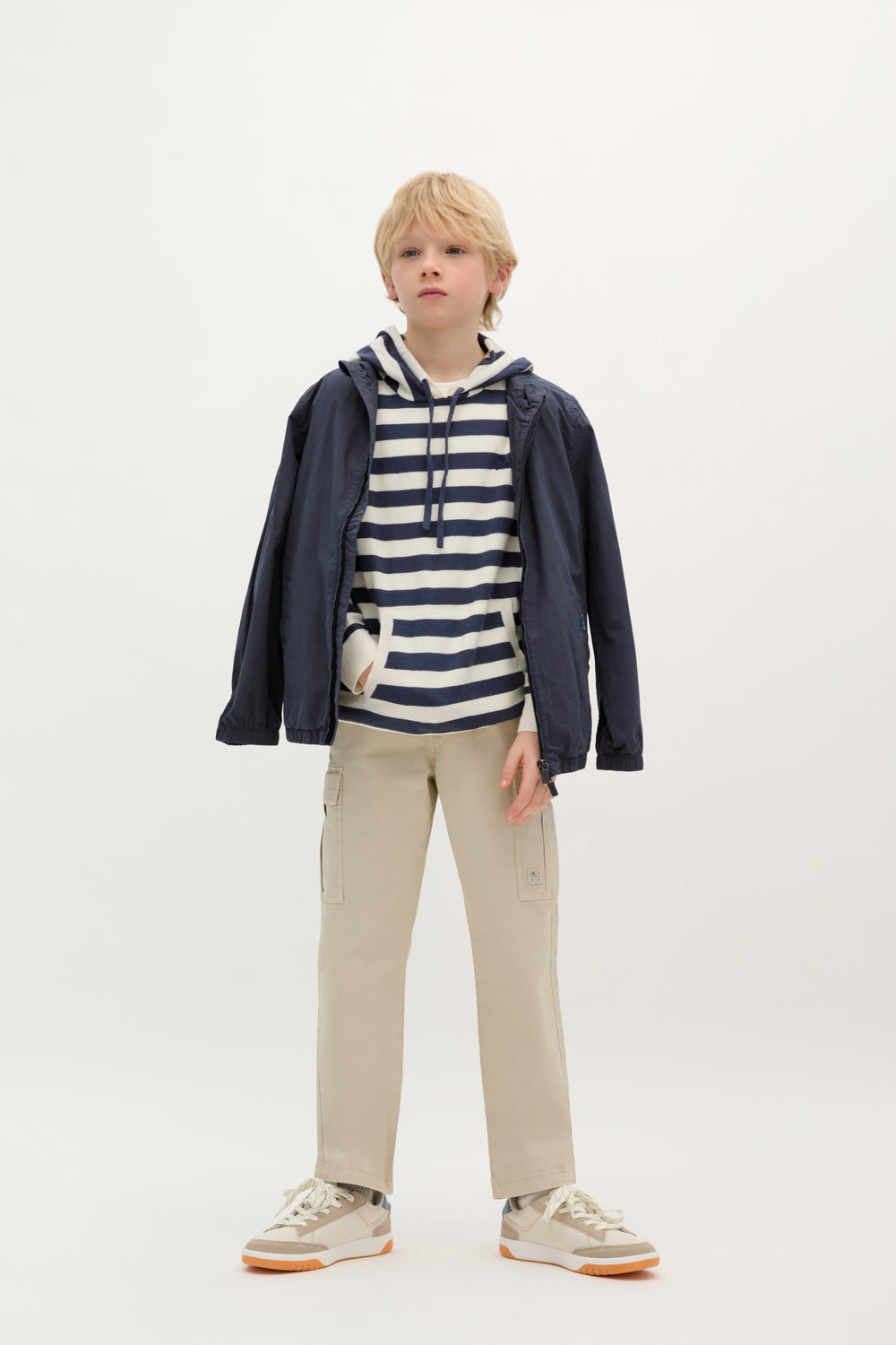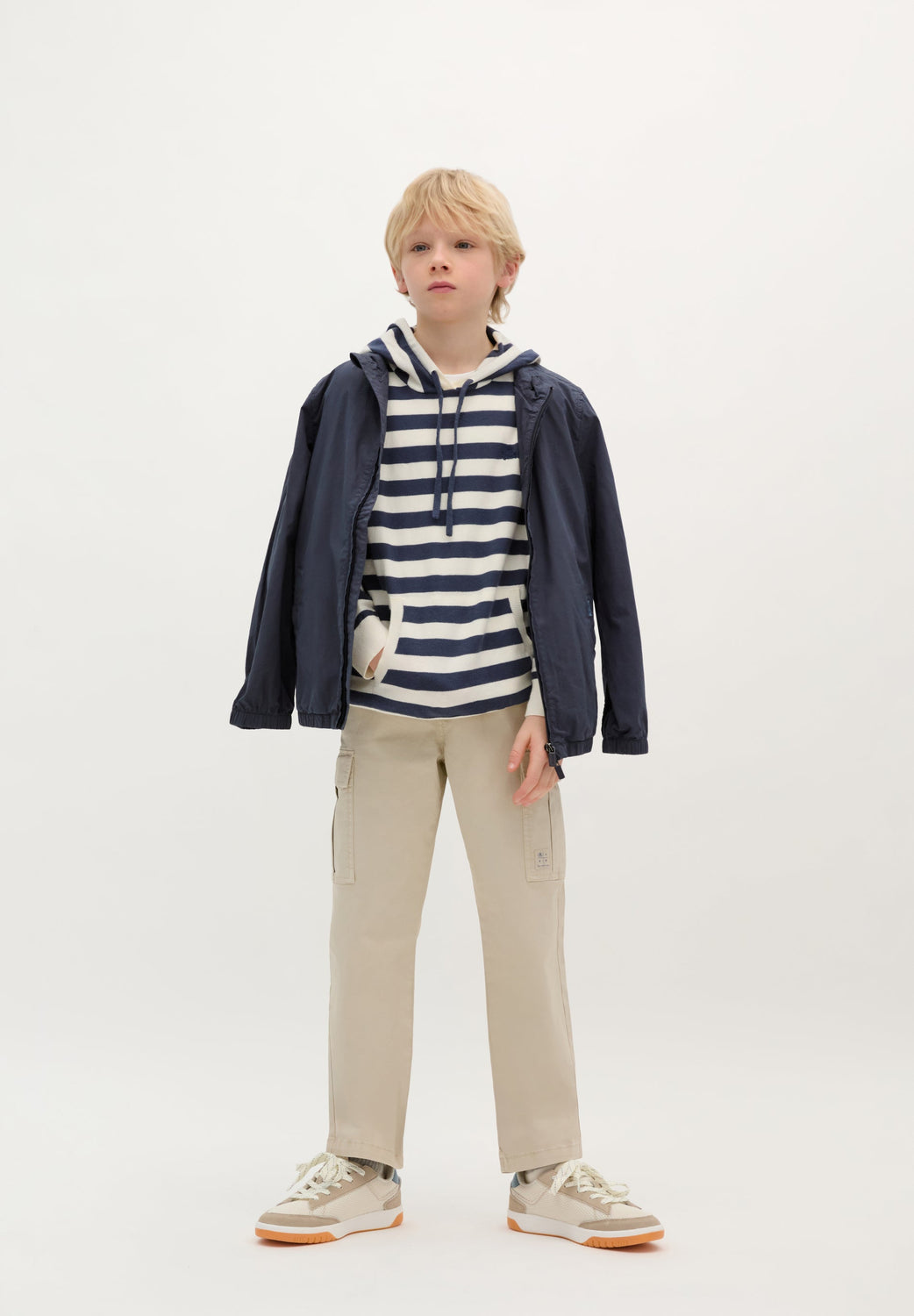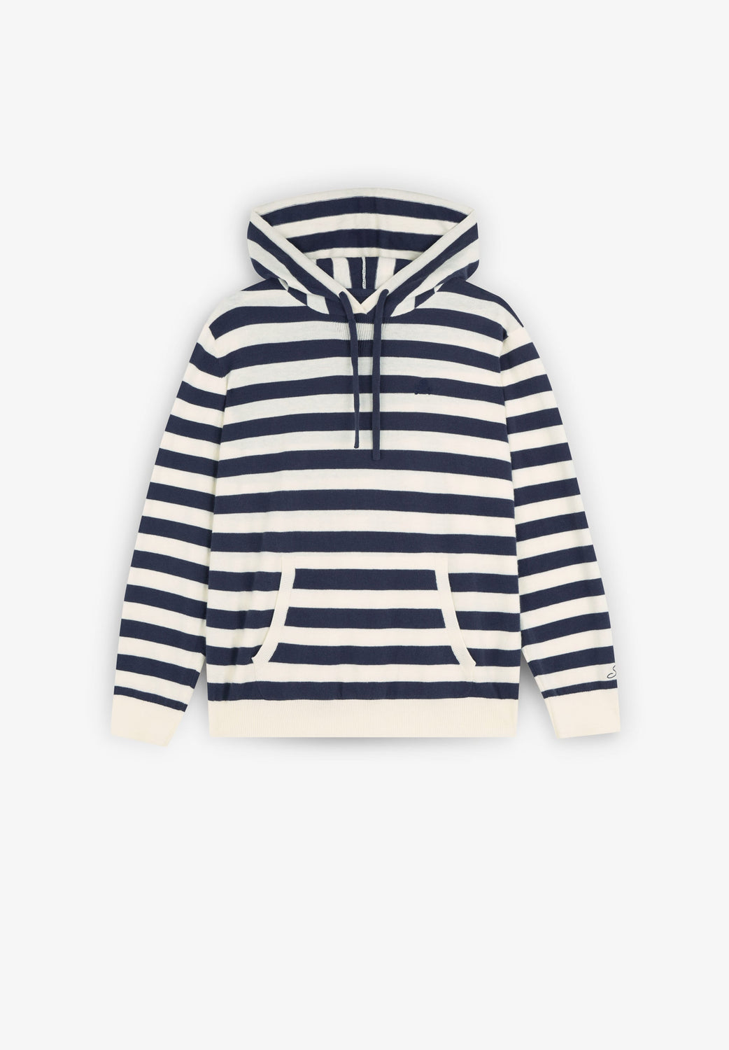 Striped sweater with hood and contrast details. Made of 100% BCI cotton. Regular fit. Collar with adjustable hood. Long sleeves with contrast cuffs. Pouch pocket. Contrast embroidered skull detail.