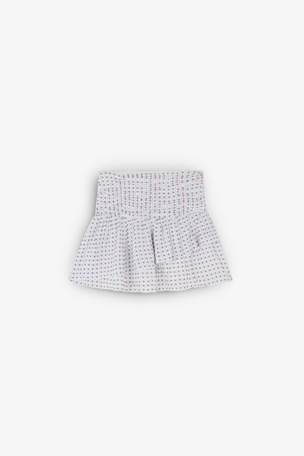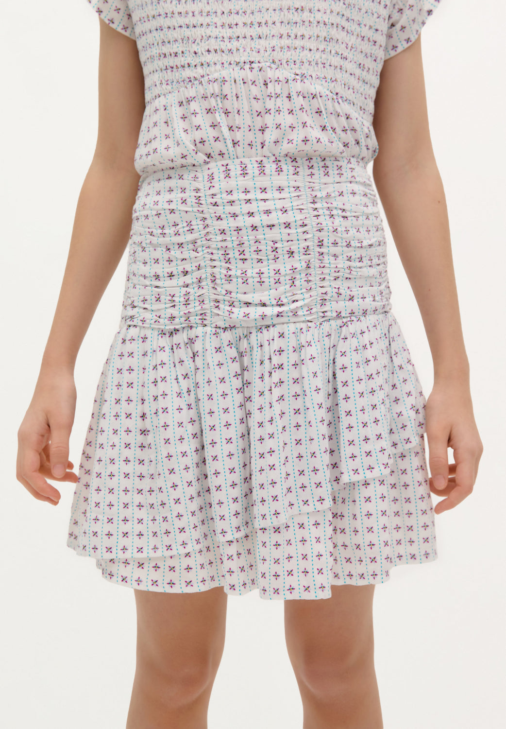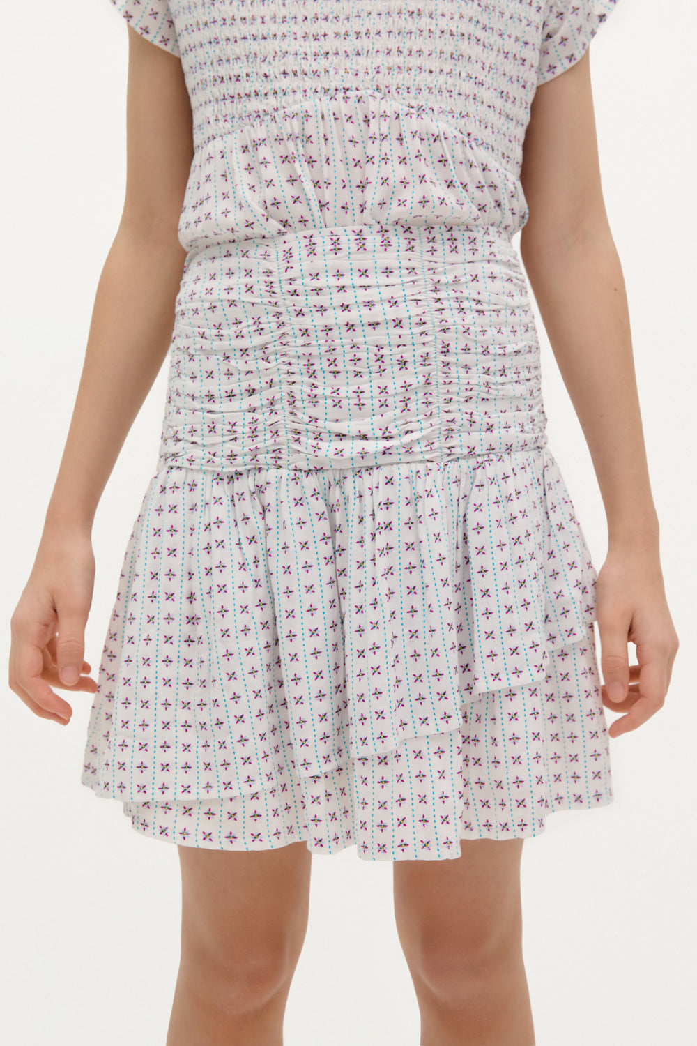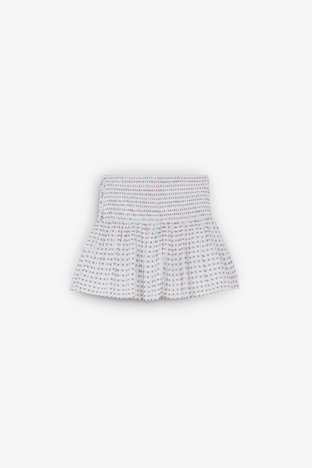 Pleated asymmetric elasticated skirt with smocked detailing at the waist.