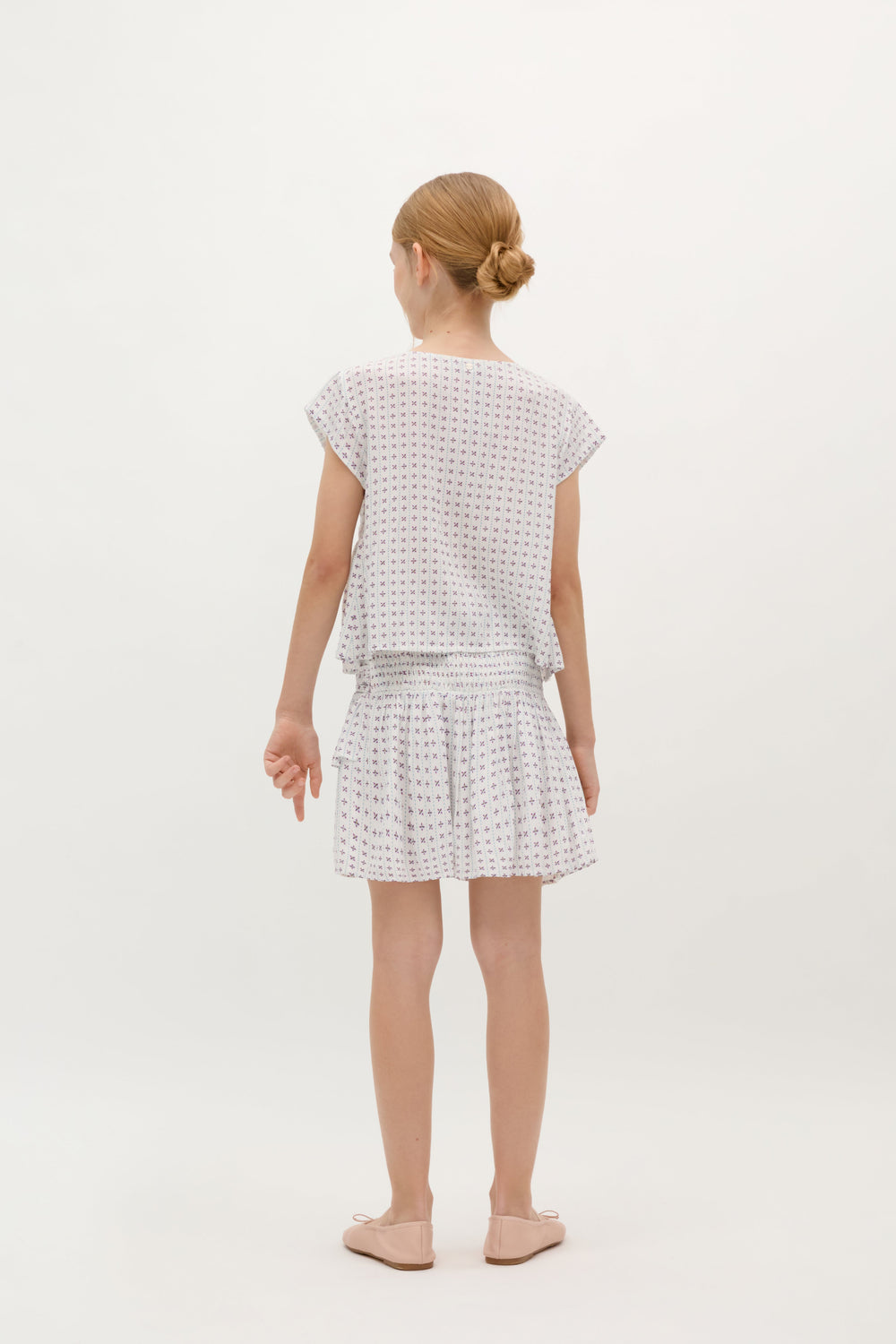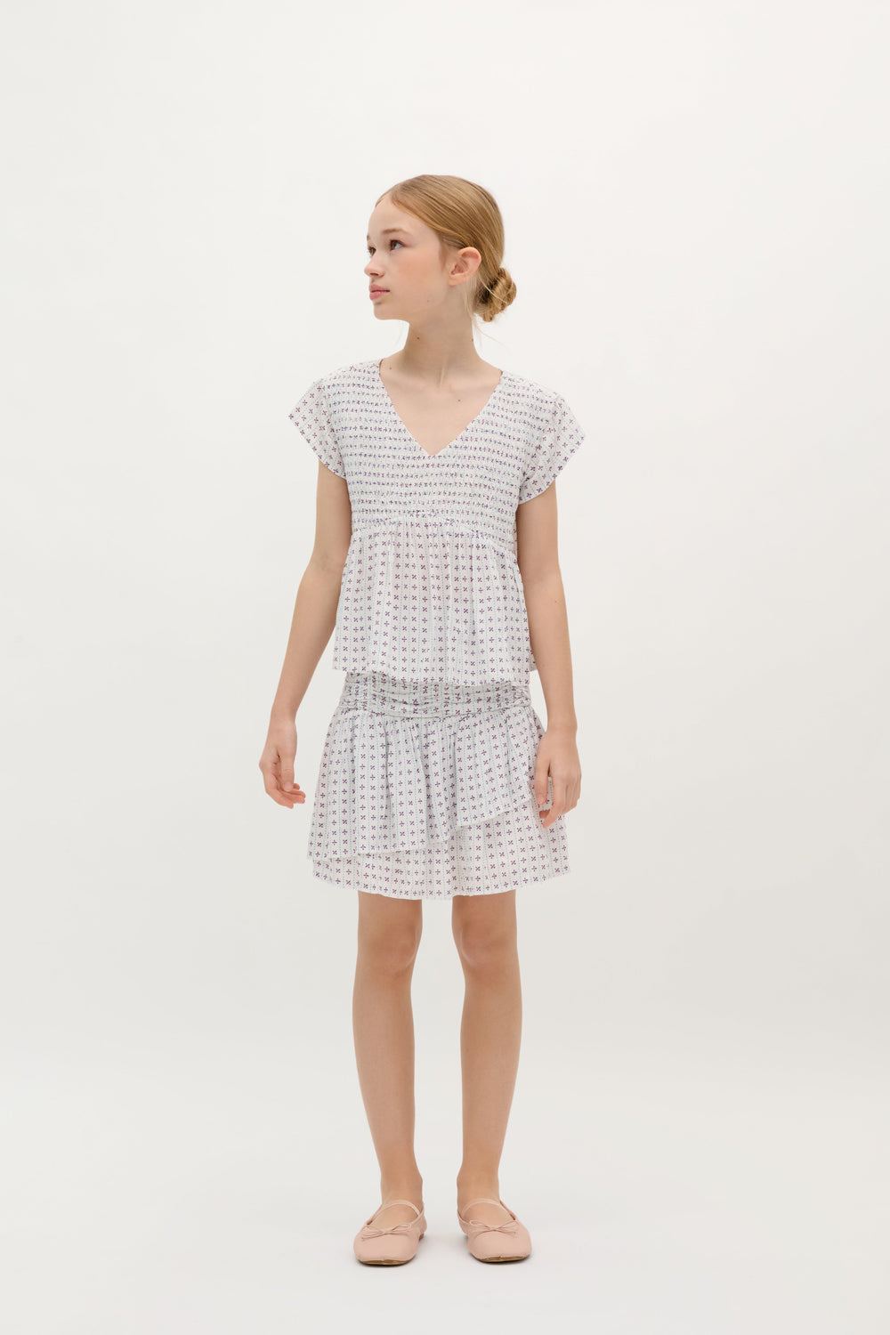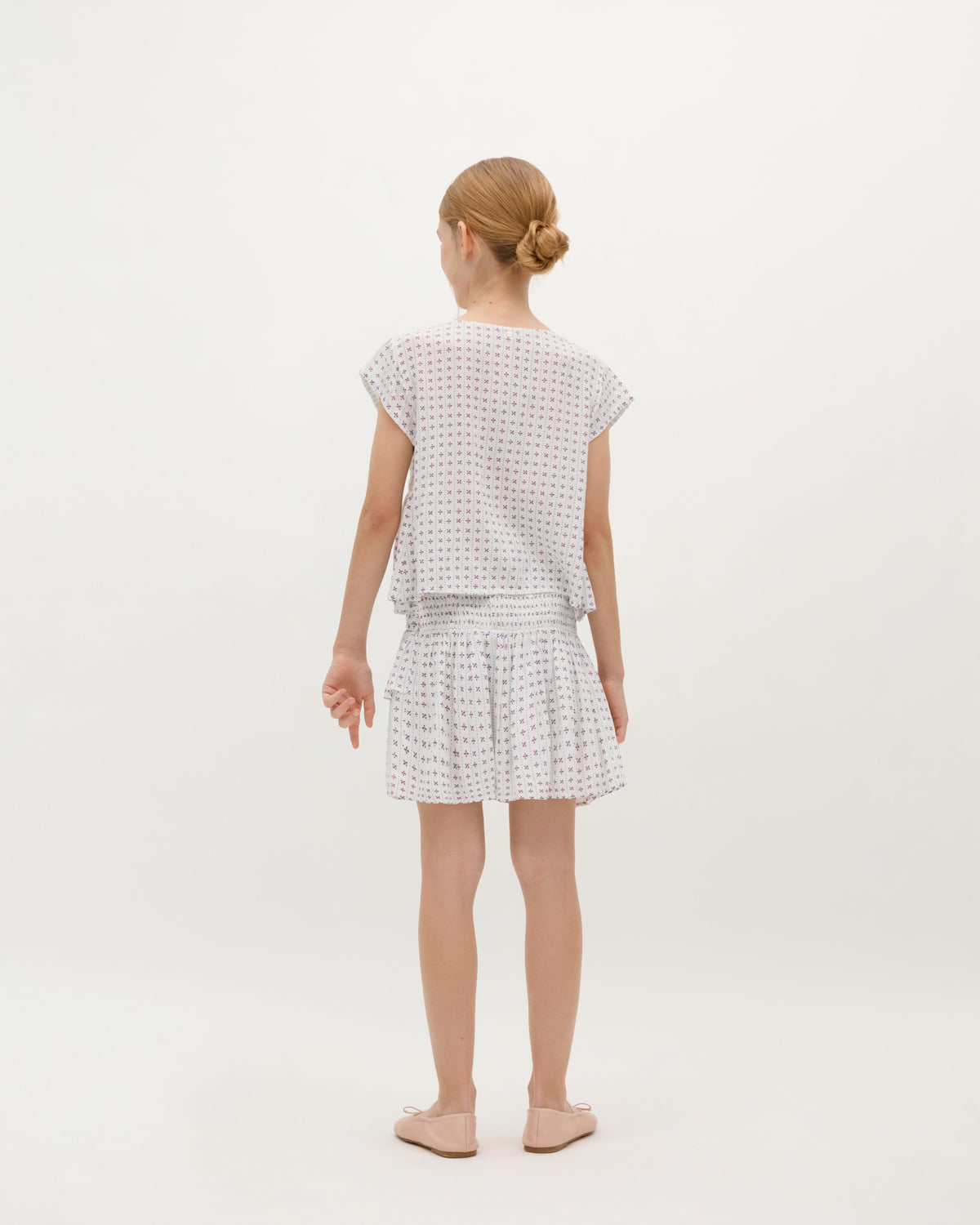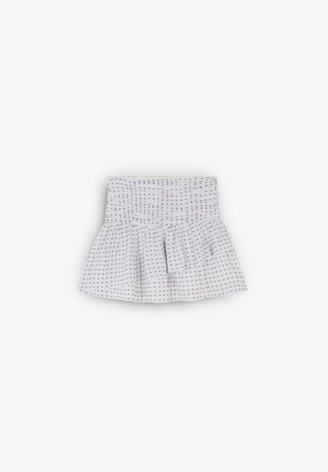 Pleated asymmetric elasticated skirt with smocked detailing at the waist.