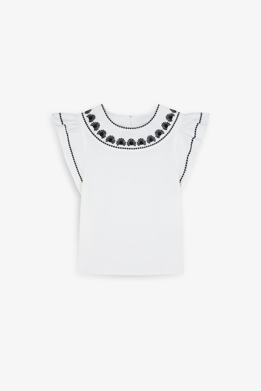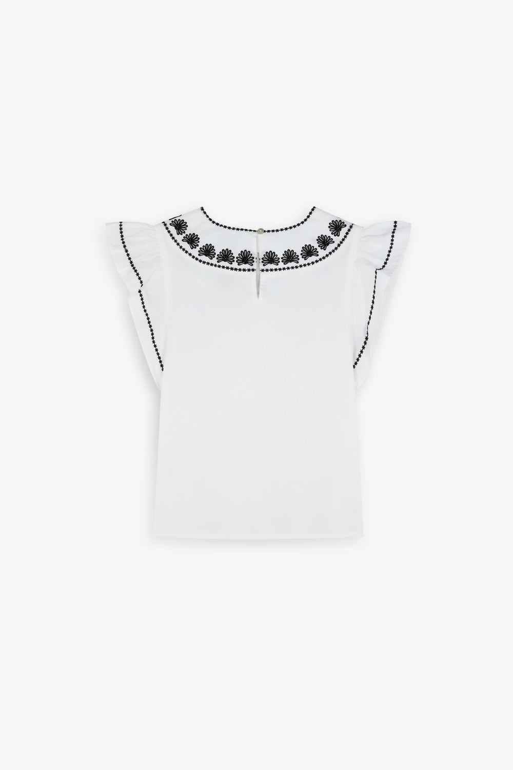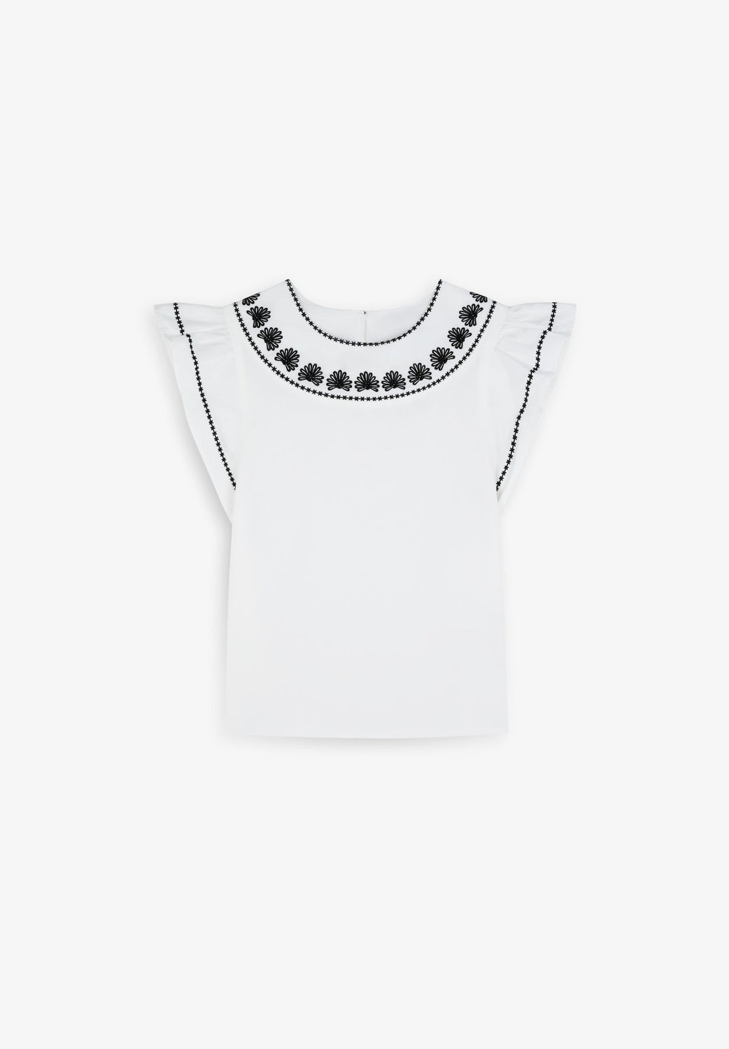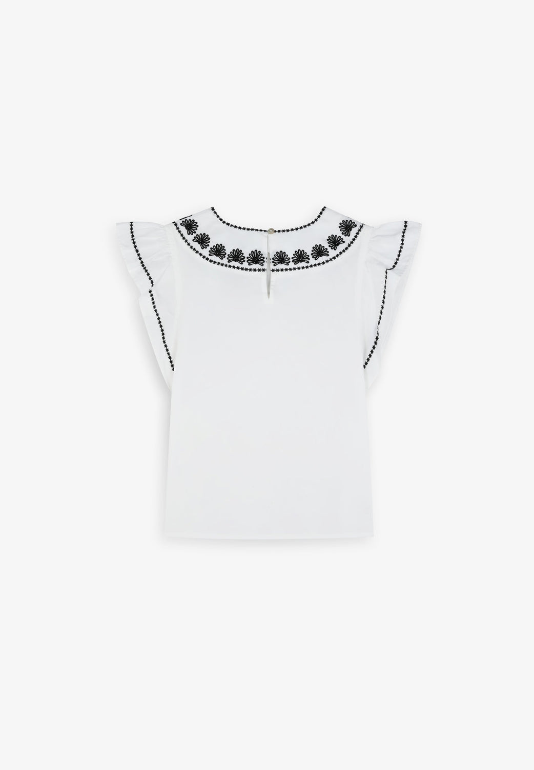 Blouse made of 100% cotton with round neck and short sleeves. Teardrop-shaped fastening at the back. Ruffled appliqué on shoulders.