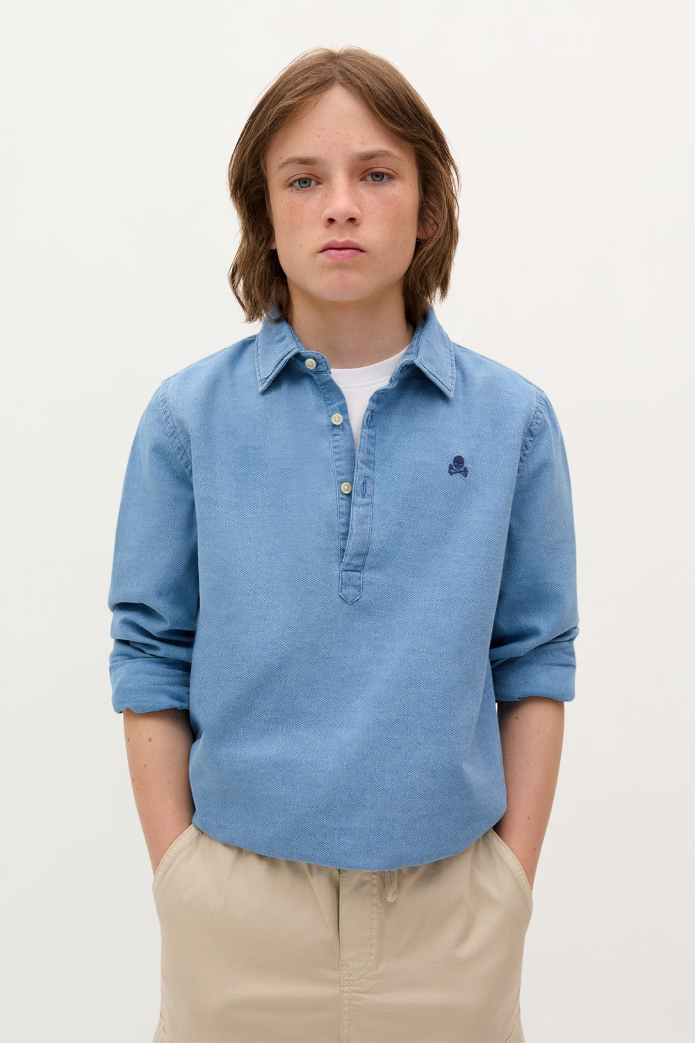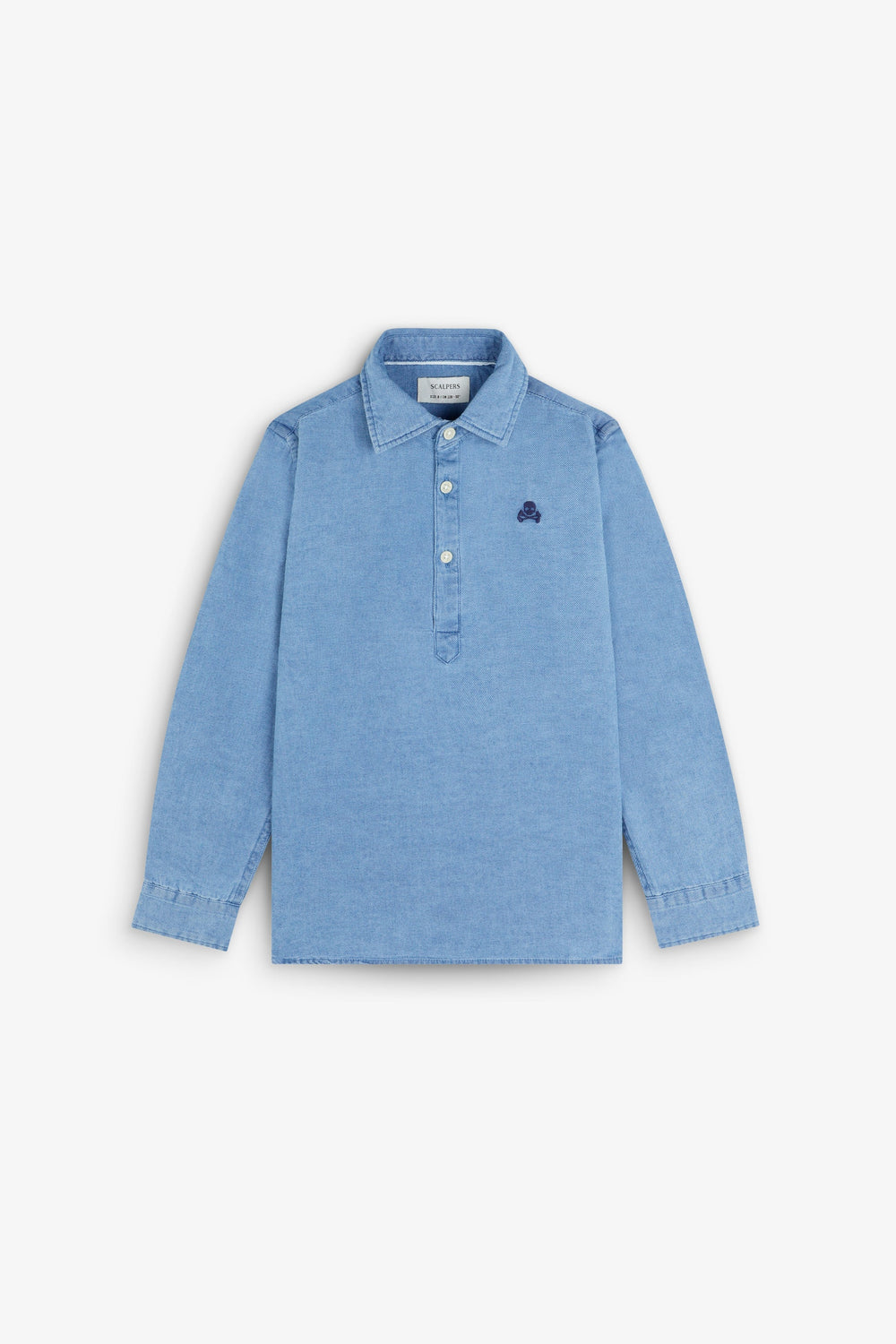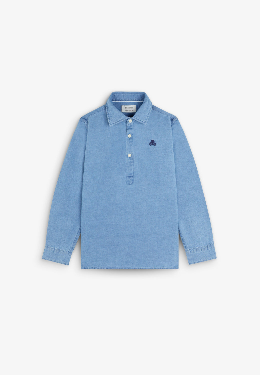 Denim shirt made of 100% organic cotton. Regular fit, polo neck and long sleeves with cuffs. Button fastening and embroidered skull logo on chest.