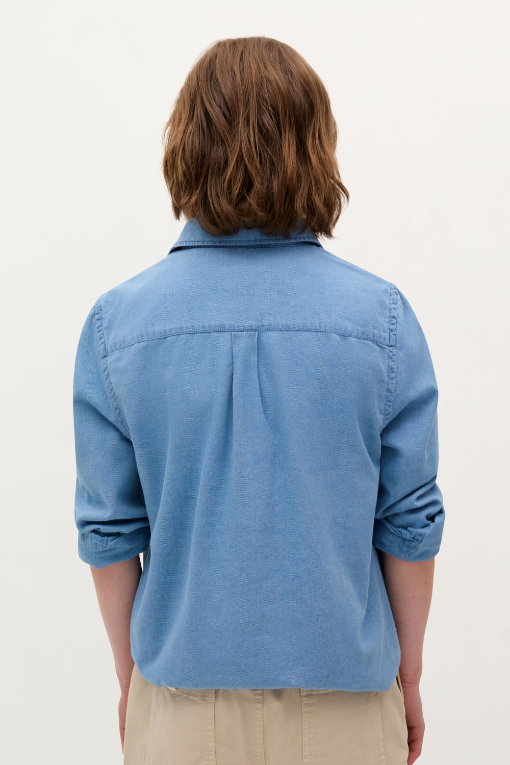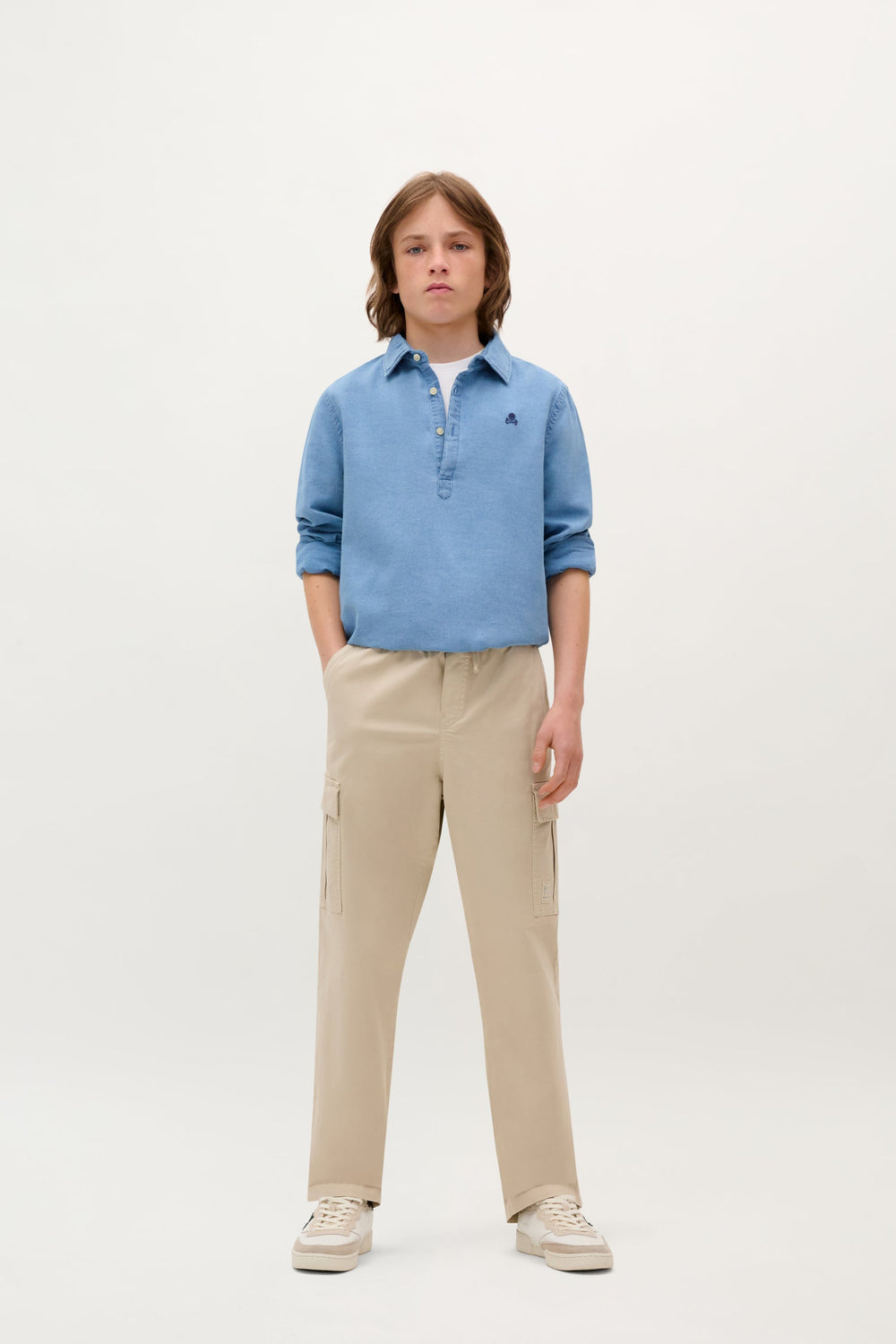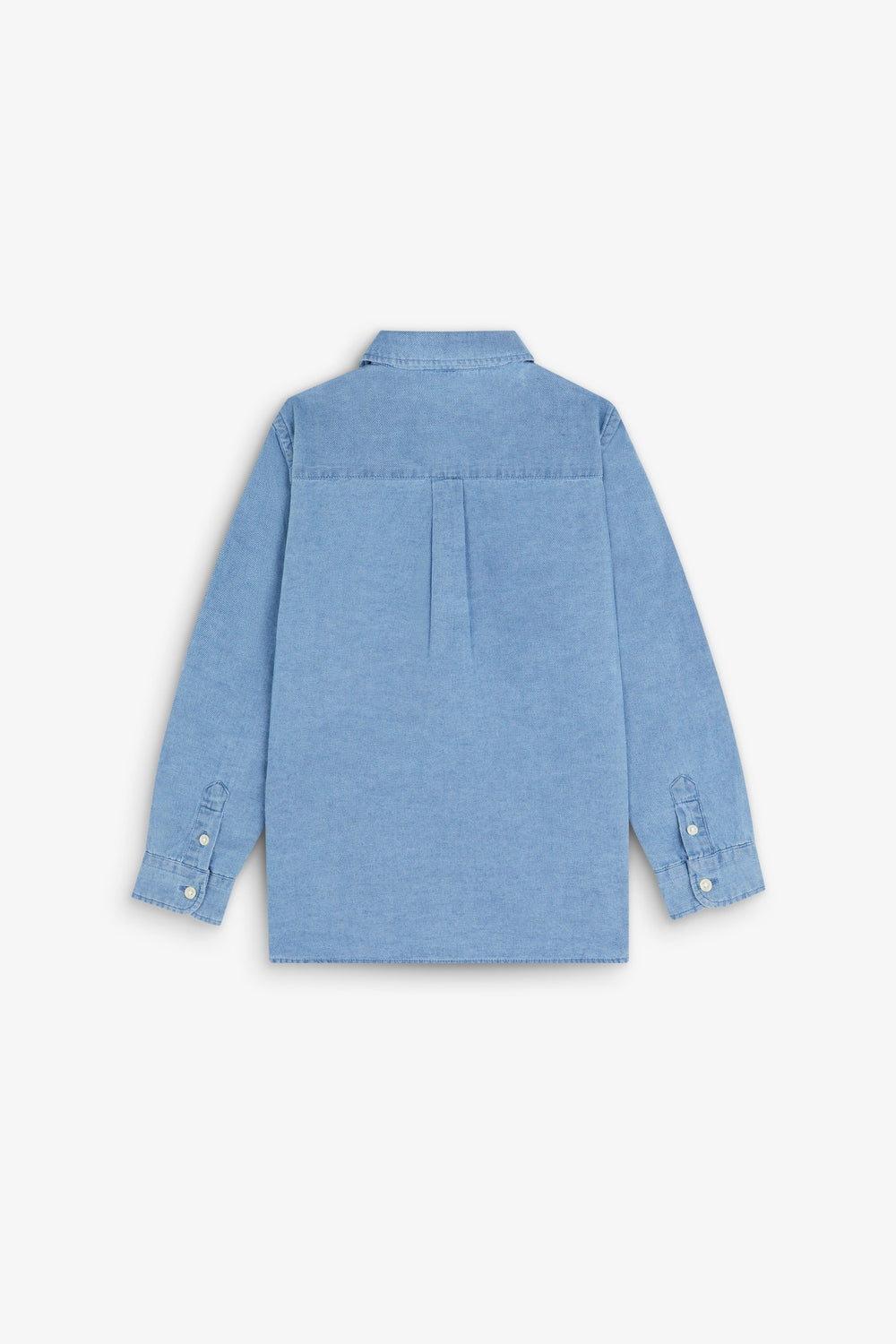 Denim shirt made of 100% organic cotton. Regular fit, polo neck and long sleeves with cuffs. Button fastening and embroidered skull logo on chest.