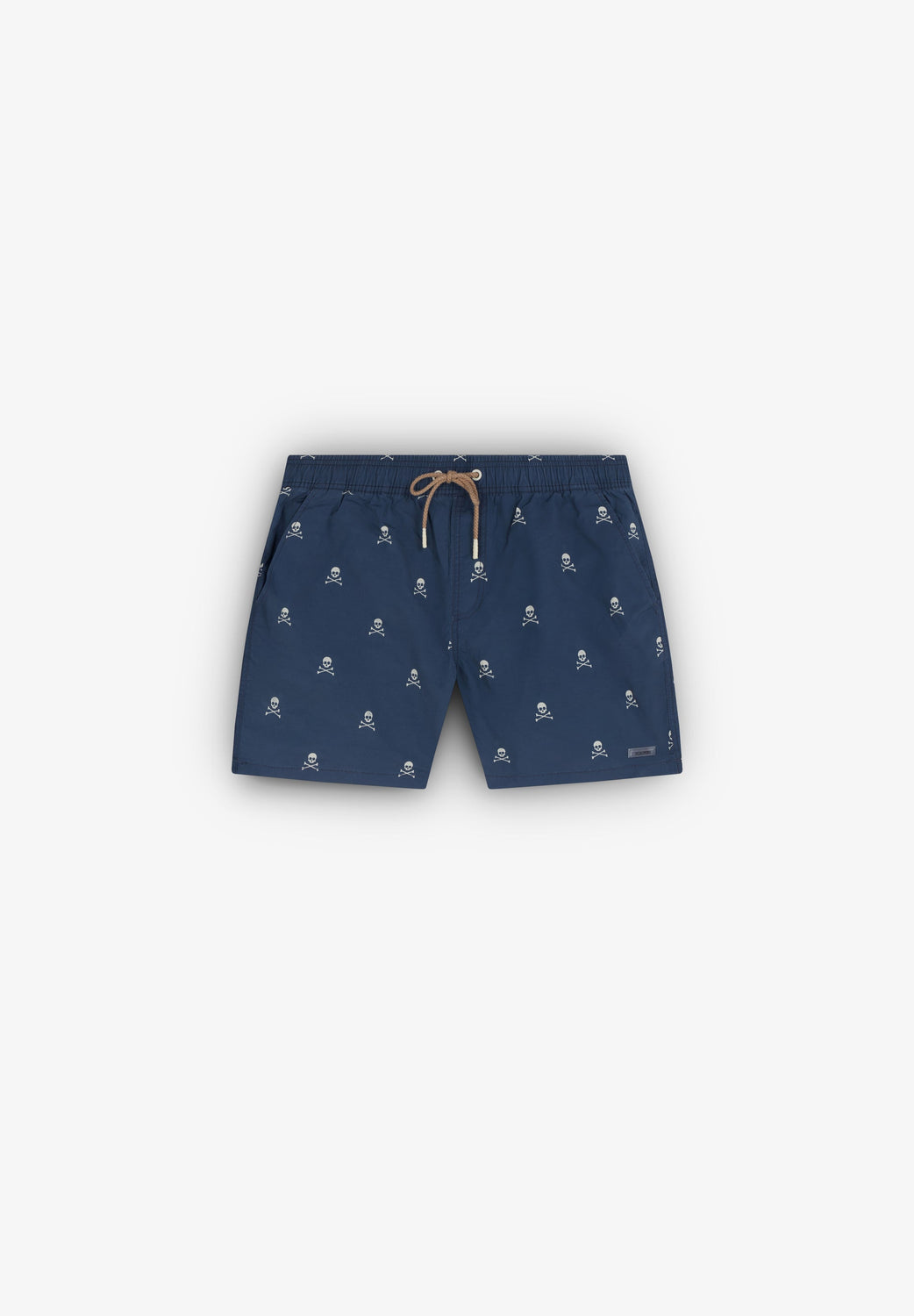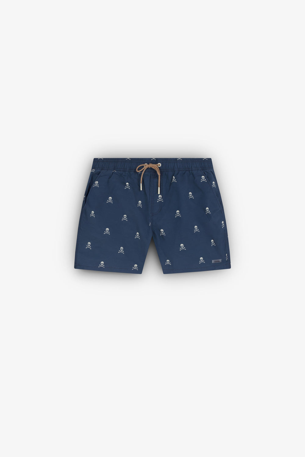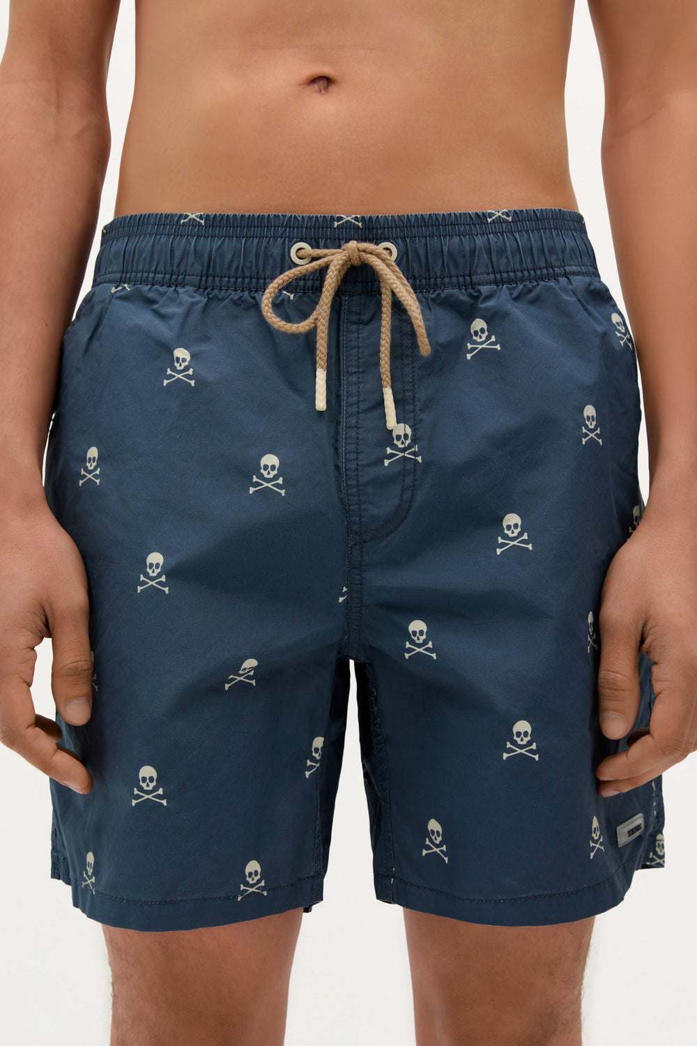 Cotton and nylon swimming trunks. Elasticated adjustable drawstring waistband. Printed monogram design with matte finish. Inner mesh lining. Side and front pockets with velcro fastening. Rubberised logo detail on the front left.