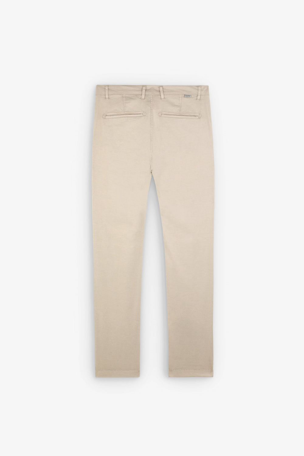 Pantalón chino casual confeccionado en mezcla de algodón ligeramente elástico. Cierre con botón y cremallera y bolsillos laterales y traseros. Trabillas en cintura.