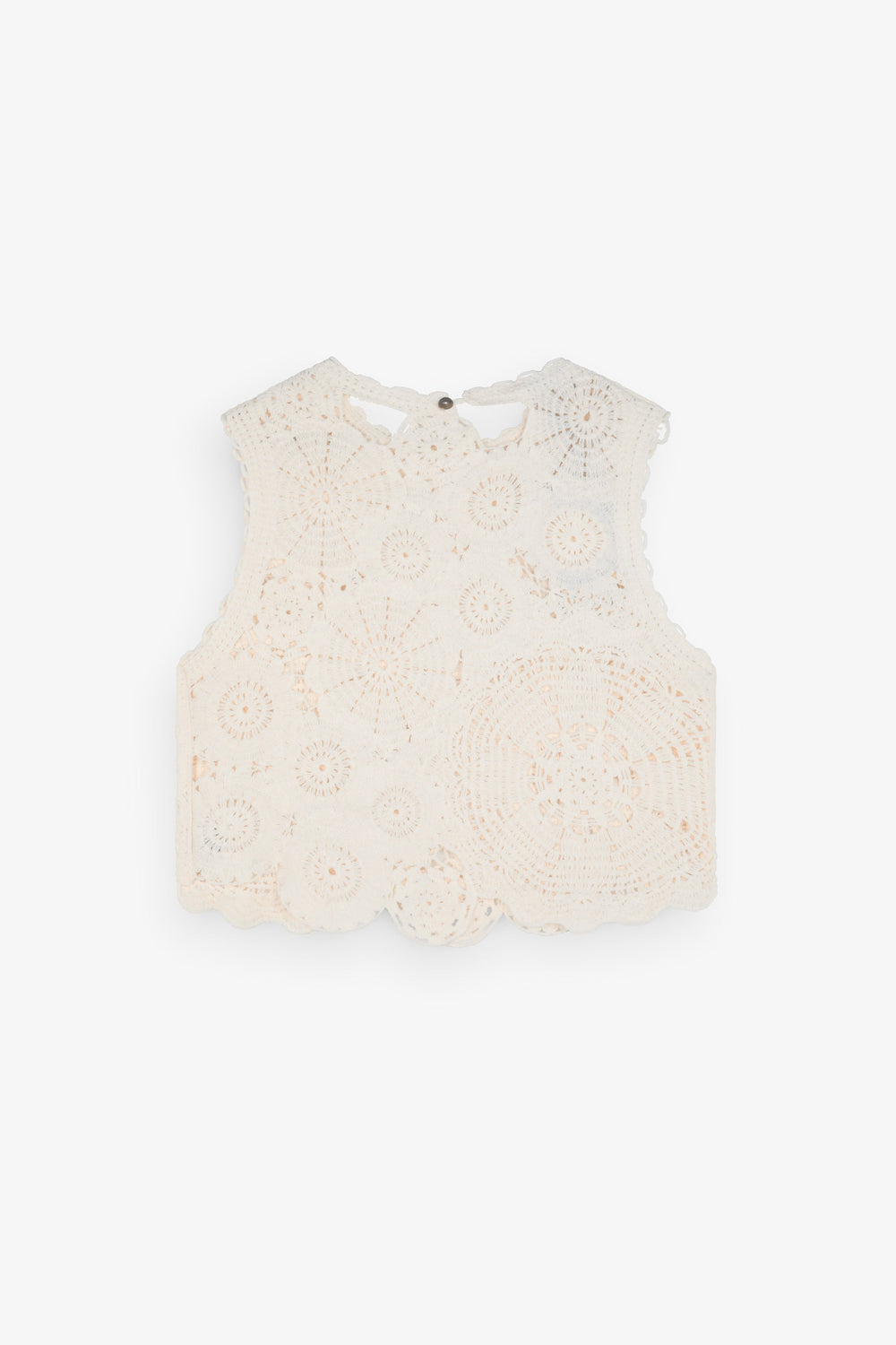 Top with crochet flower embroidery. Sleeveless design with round neck. Teardrop button fastening at the back. Metal logo tag detail on the hem.