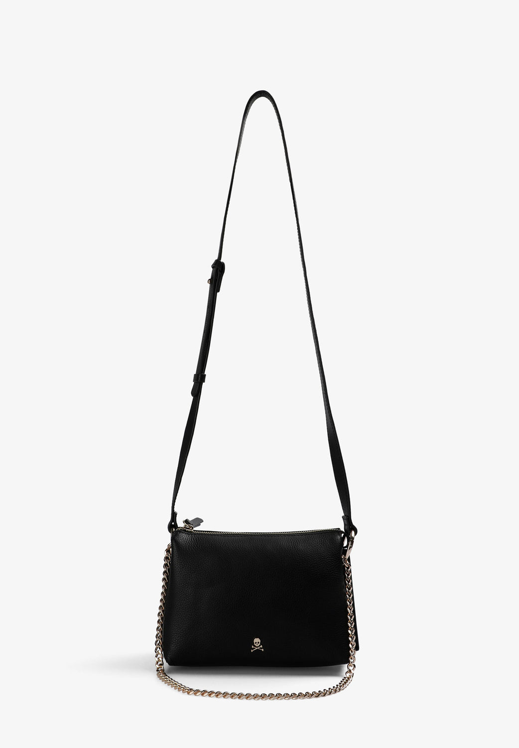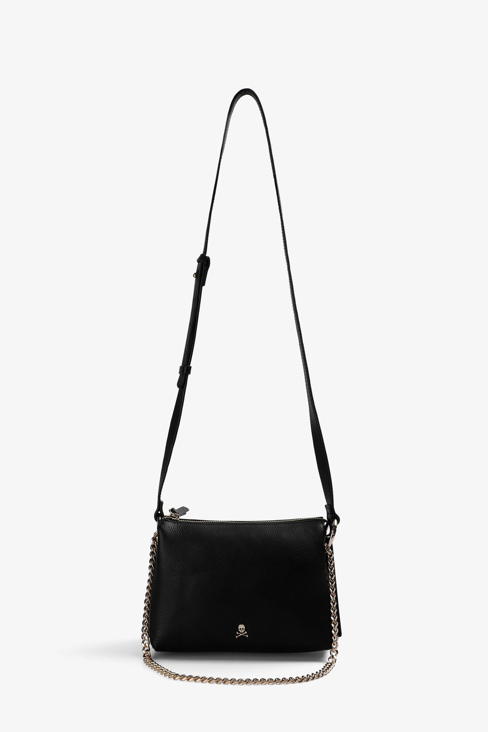 Bag made of 100% leather. Zip fastening, a long adjustable strap and a metallic skull.