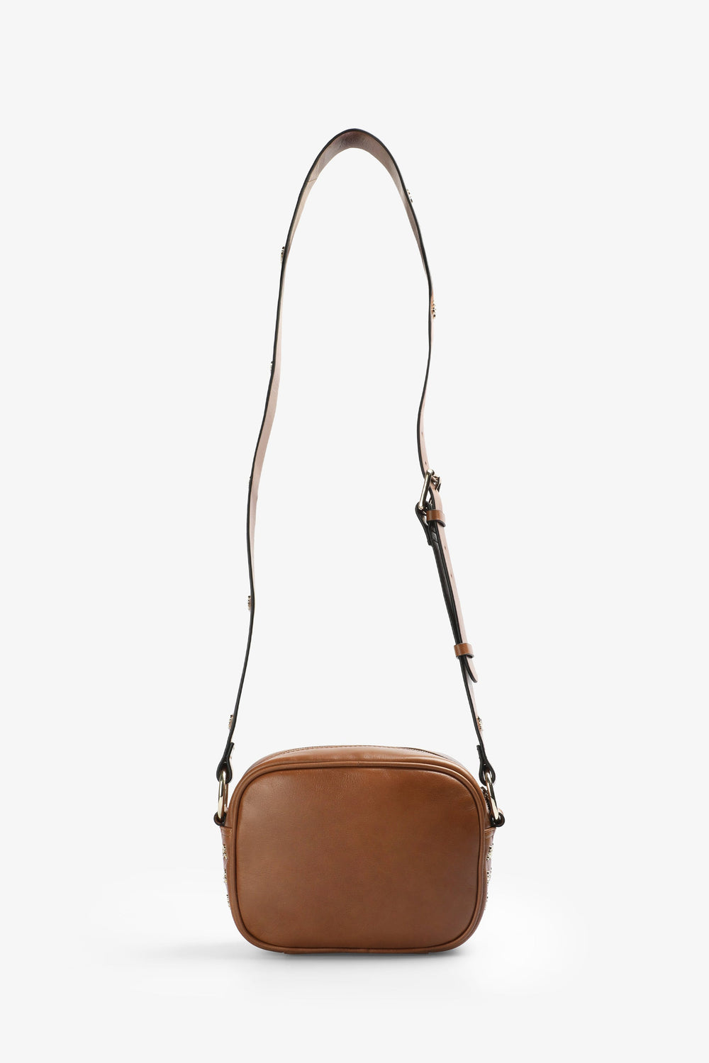 Crossbody bag made of 100% leather. Zip fastening and a long adjustable strap with metallic skulls. Metal logo detail.