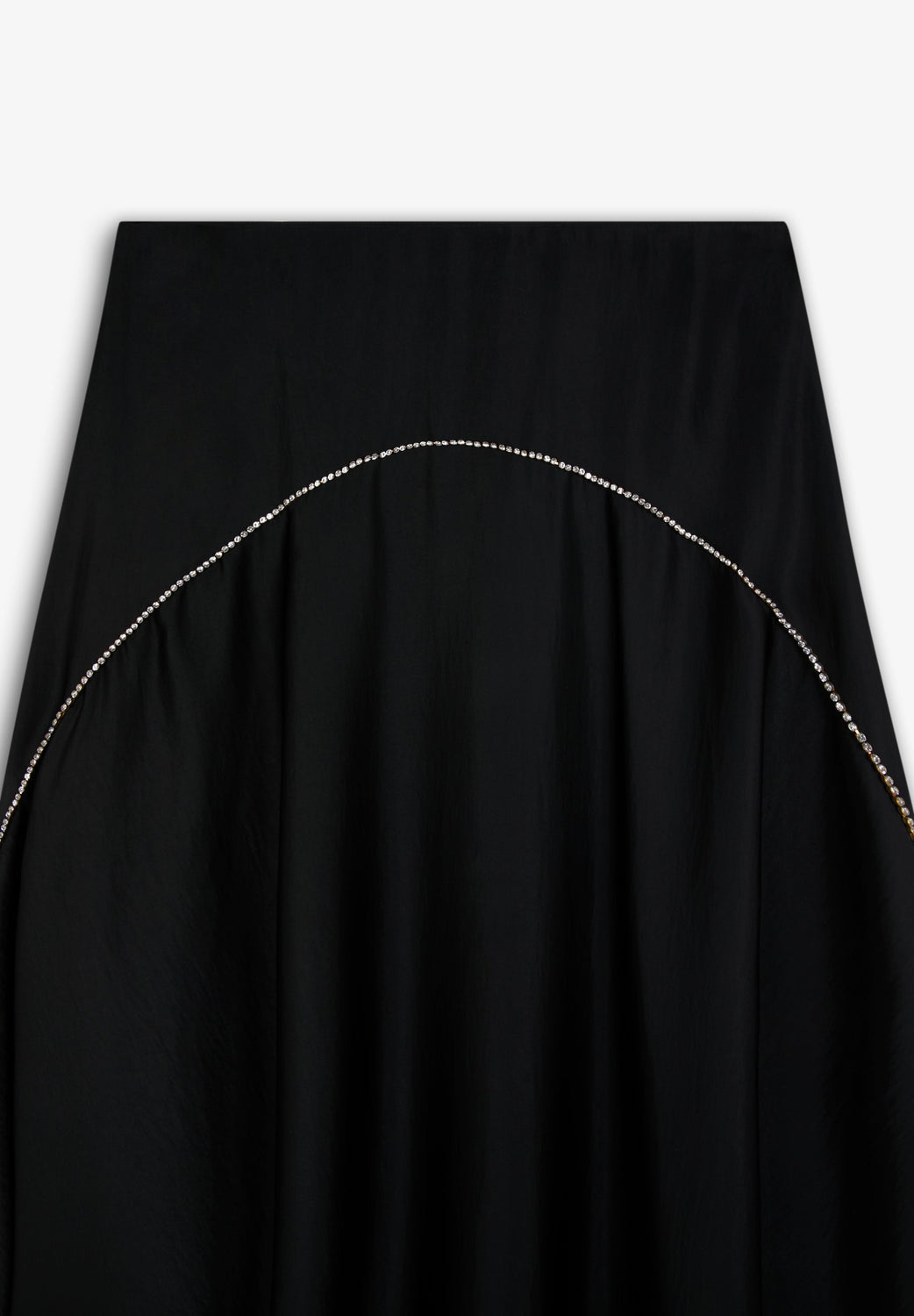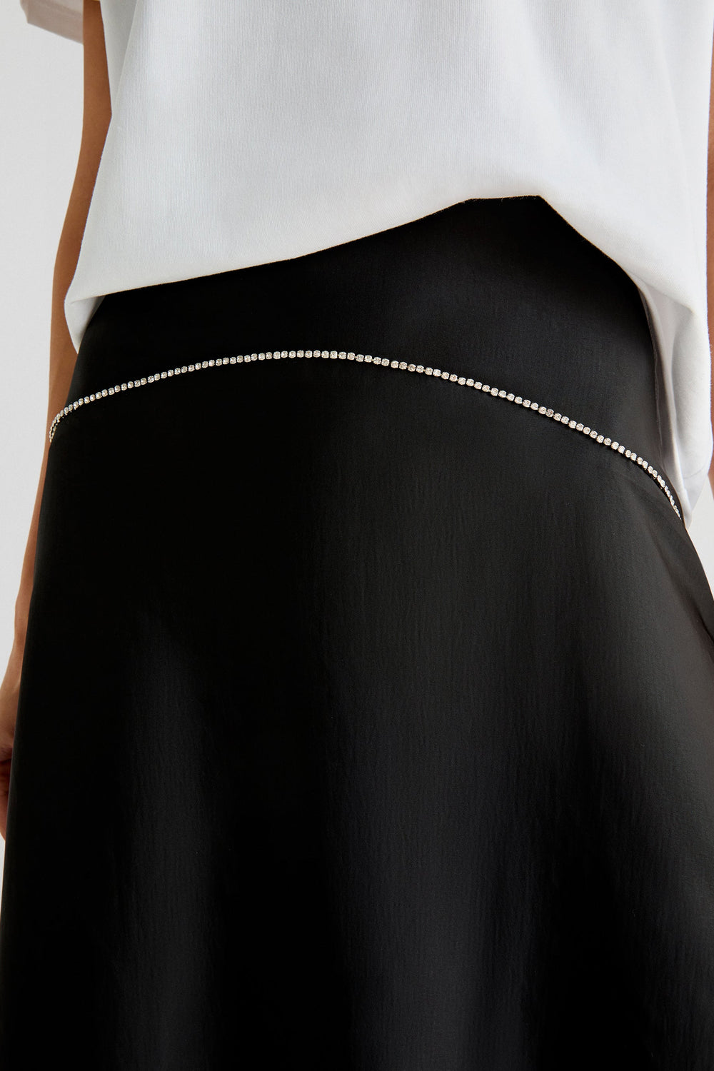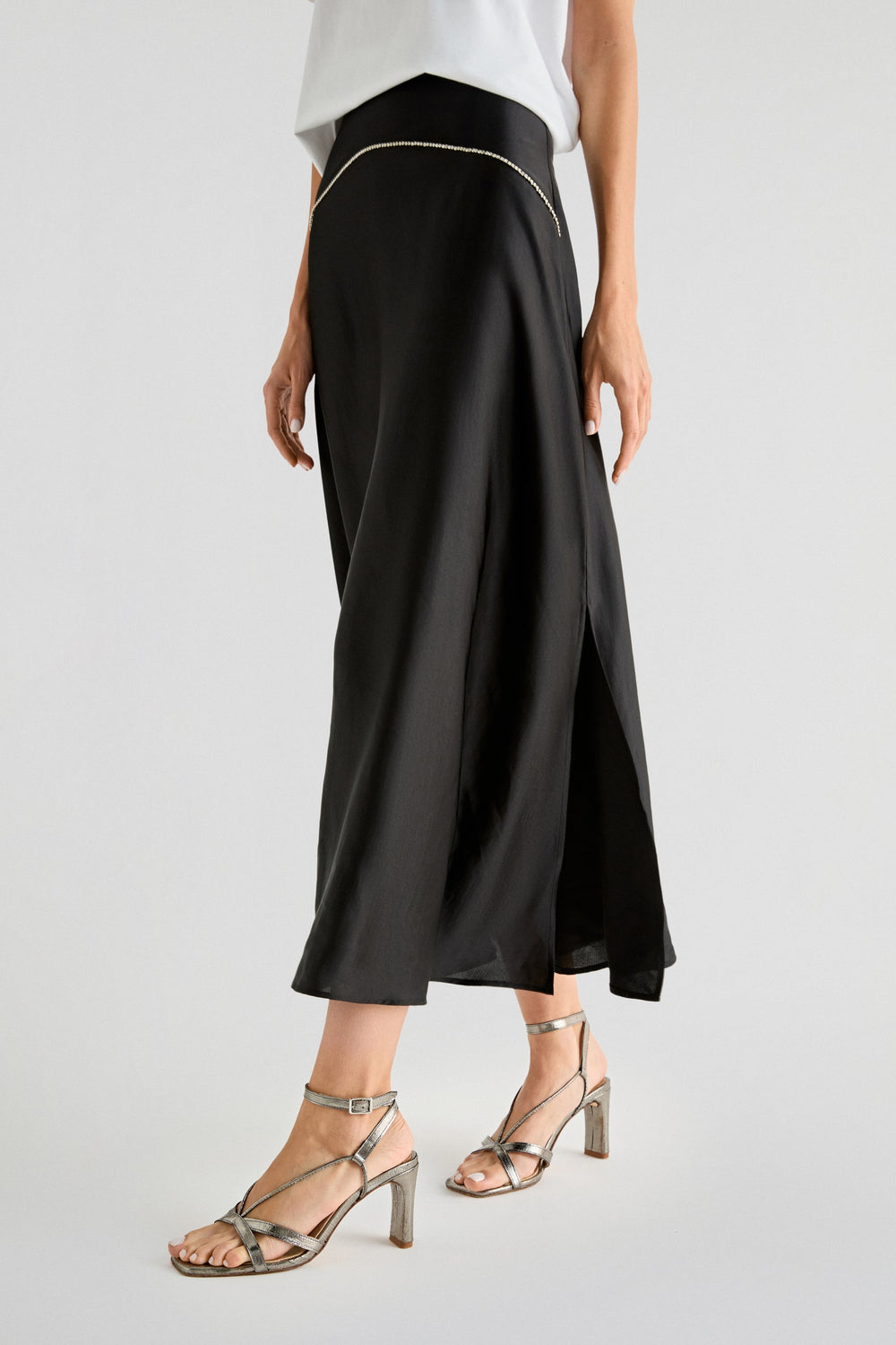 Midi skirt made of satin fabric. Regular fit, side zip fastening and crystal details.