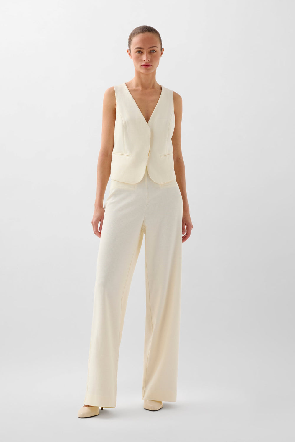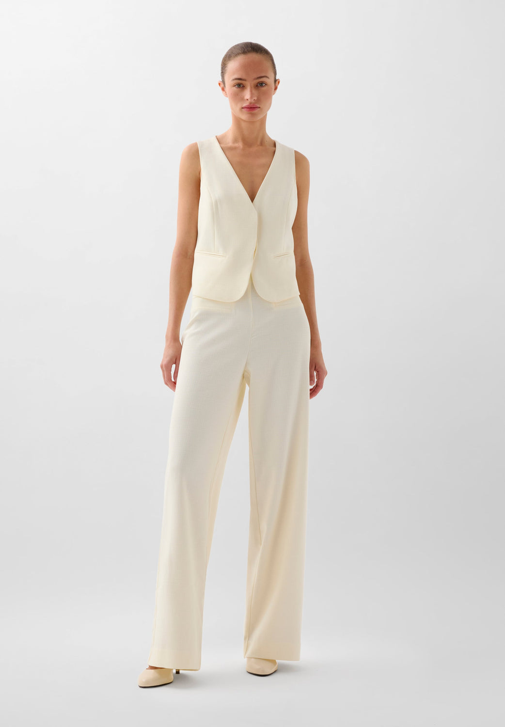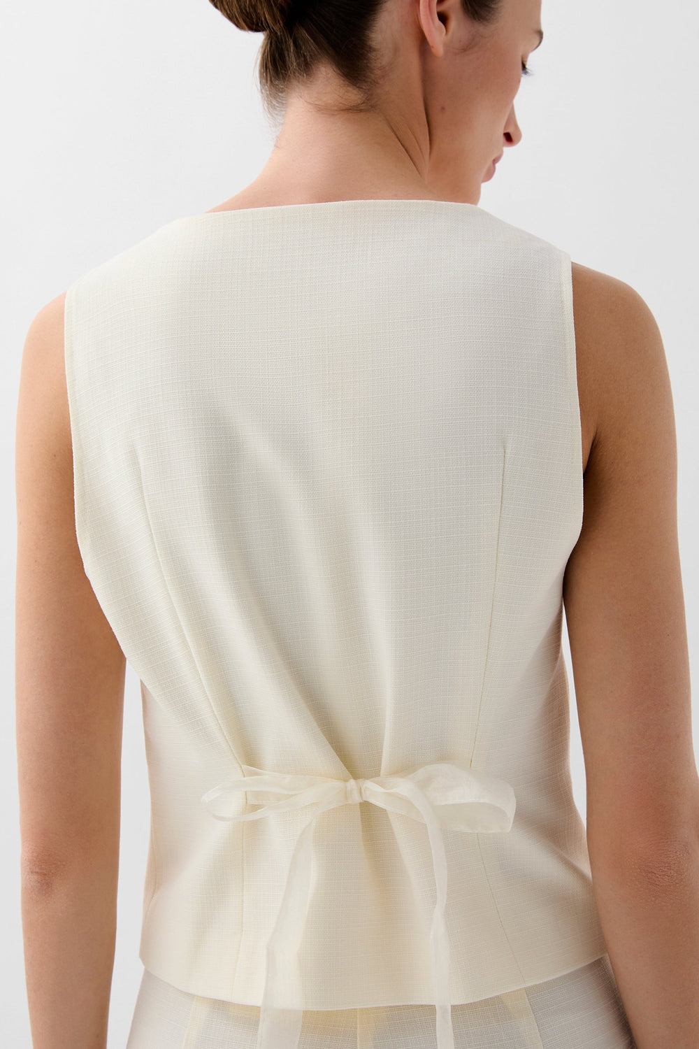 Waistcoat made of a cotton blend. Regular fit, V-neck and button fastening. Front pockets with piping and back tie.