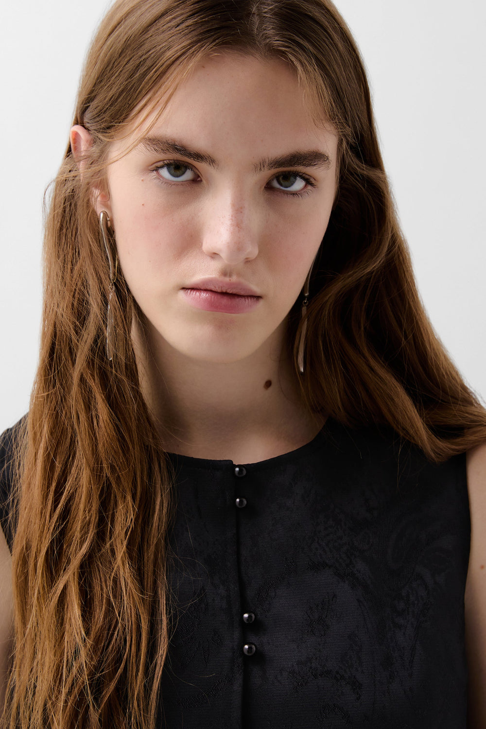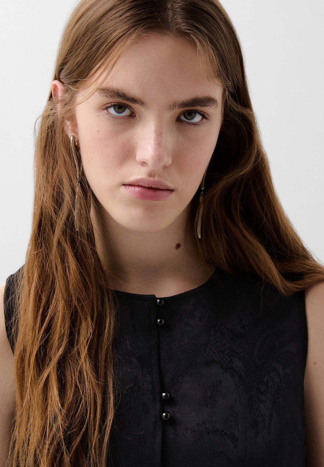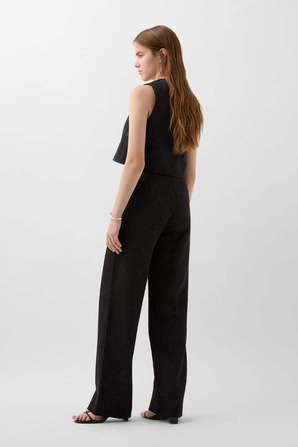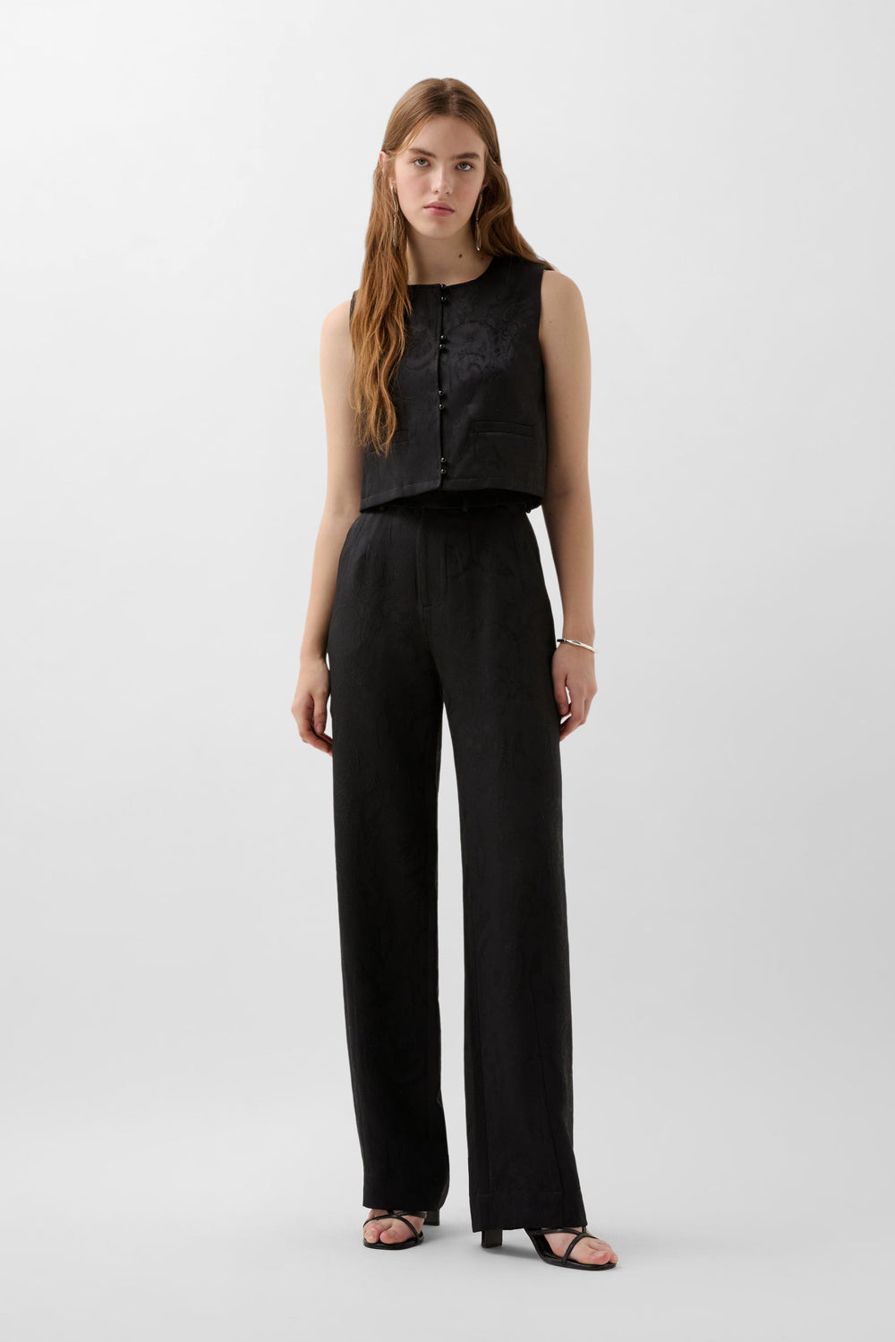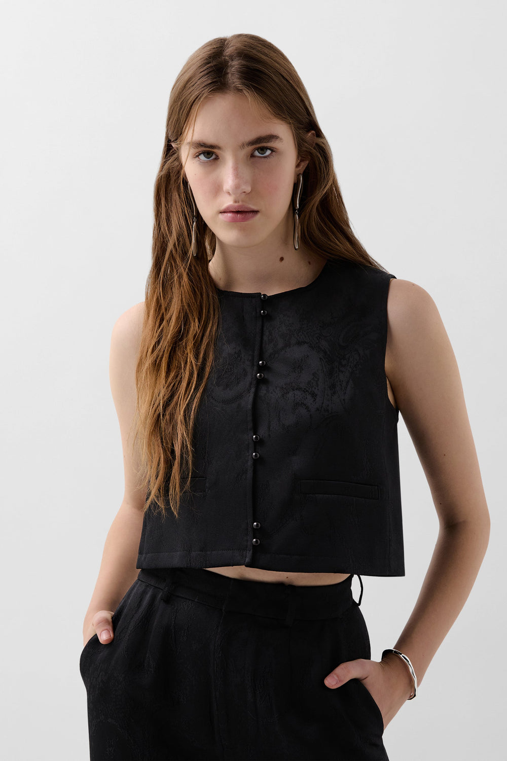 Jacquard waistcoat. Cropped with round neck and sleeveless. Button fastening and concealed front pockets.