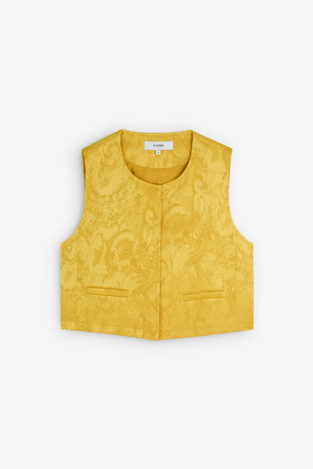 Jacquard waistcoat. Cropped with round neck and sleeveless. Button fastening and concealed front pockets.