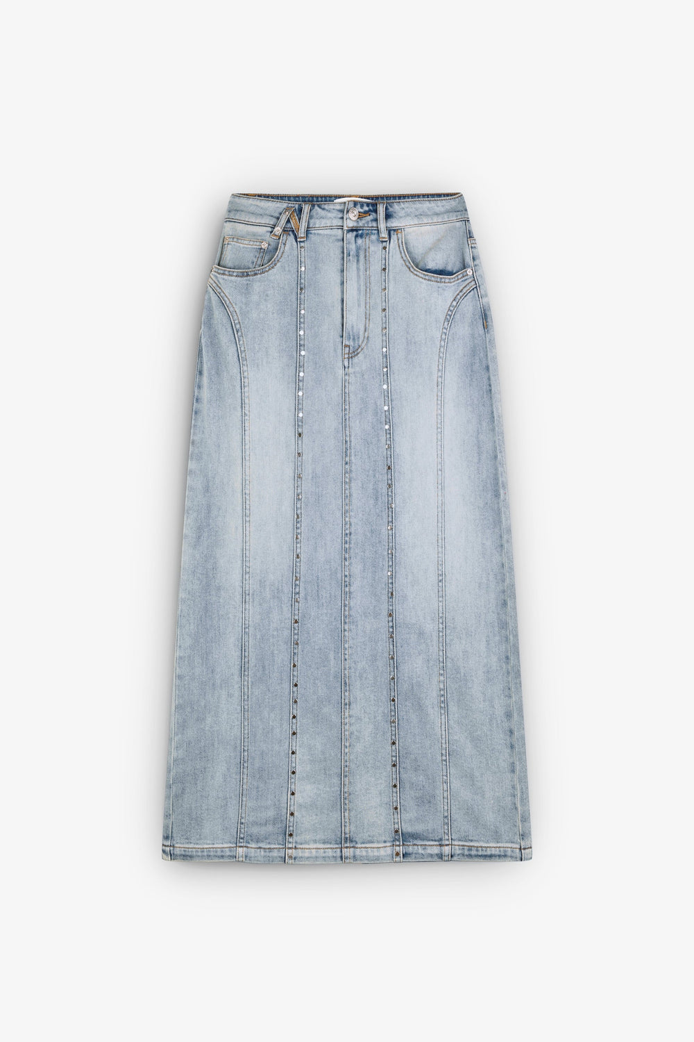 Denim skirt. Regular fit, midi length and zip and button fastening. Belt loops at the waist. Slanted front and back pockets; one contrast and one patch. Studded detailing on seams and pocket.