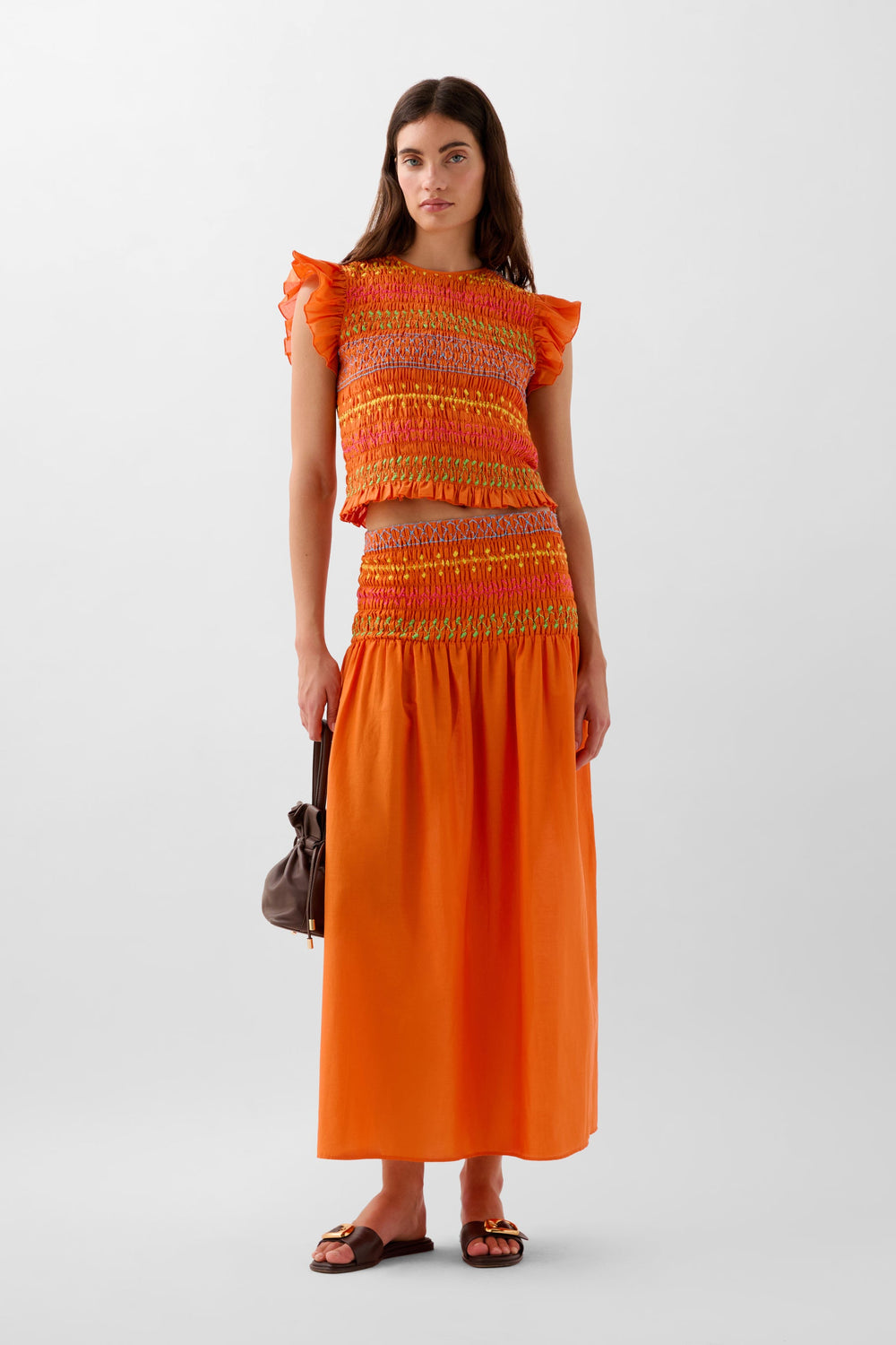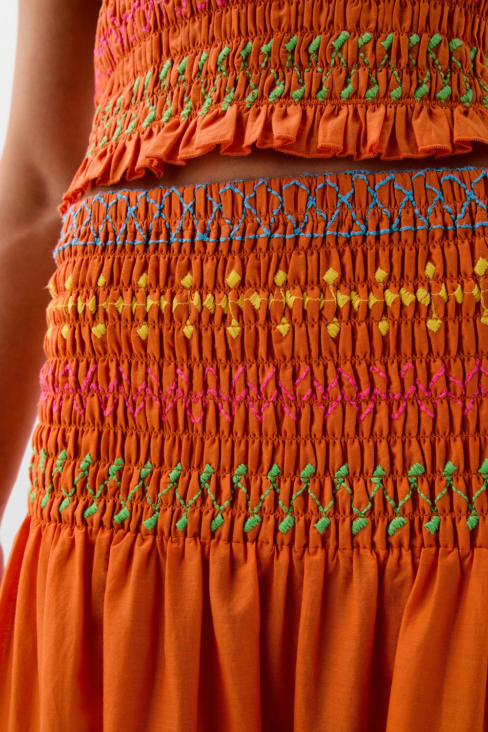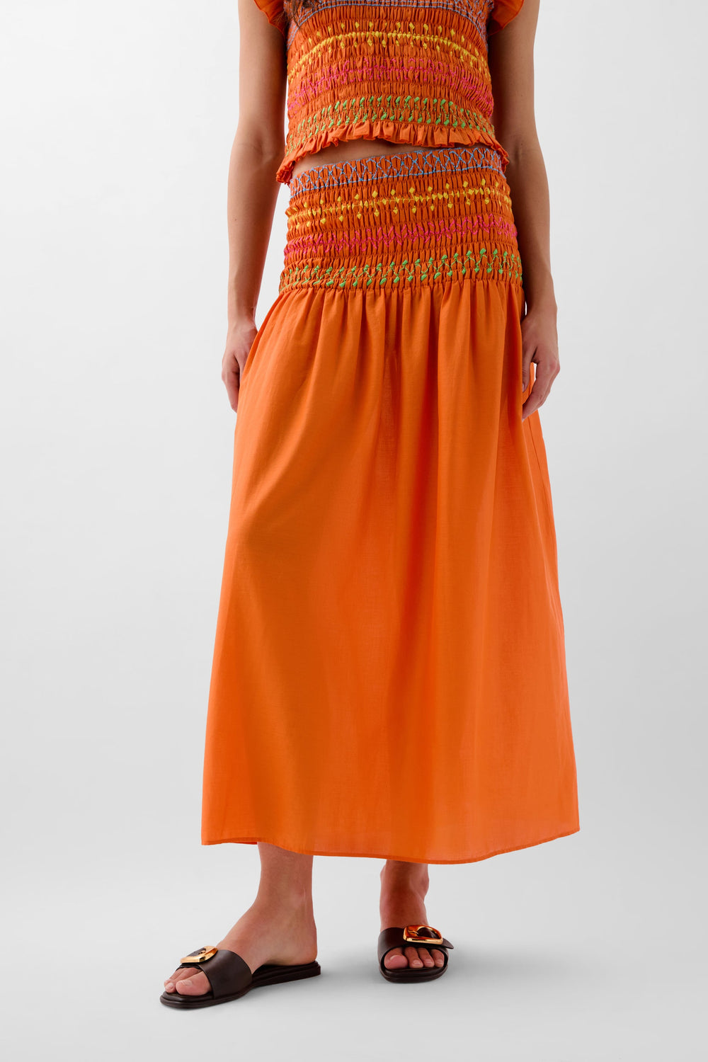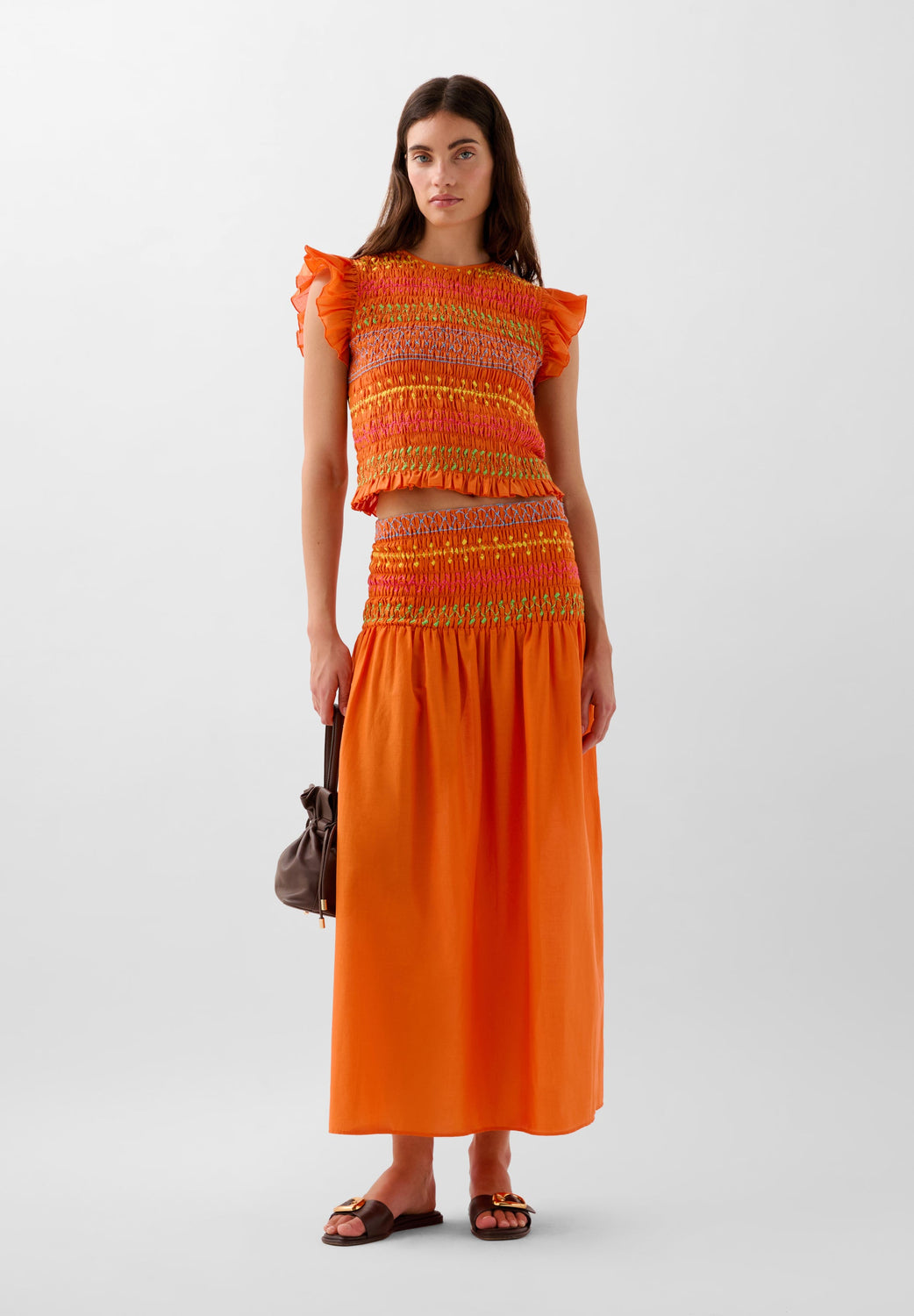 Skirt made of 100% cotton with multicoloured smocking detail on the waist to the hip. Midi cut with a slight flounce.