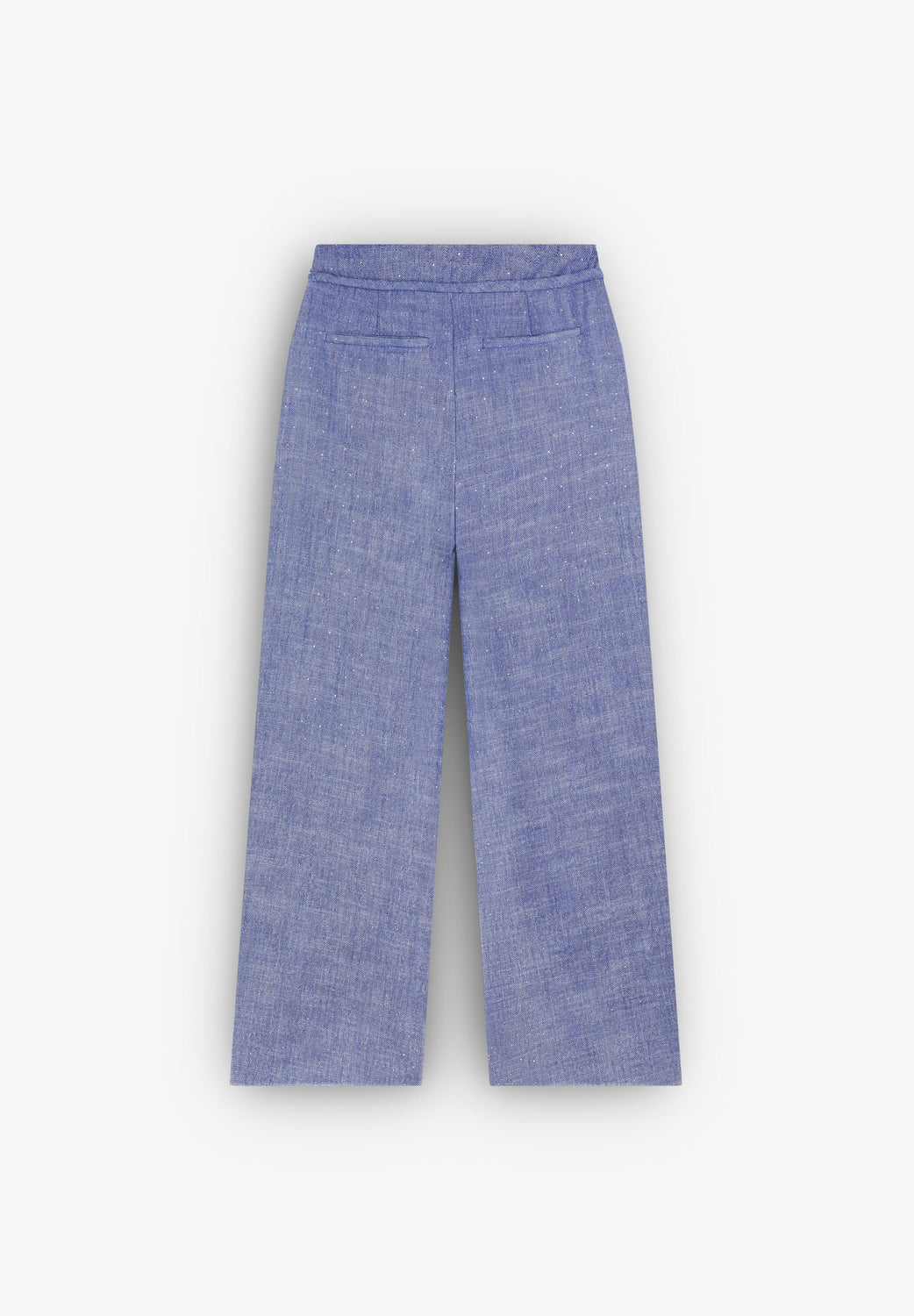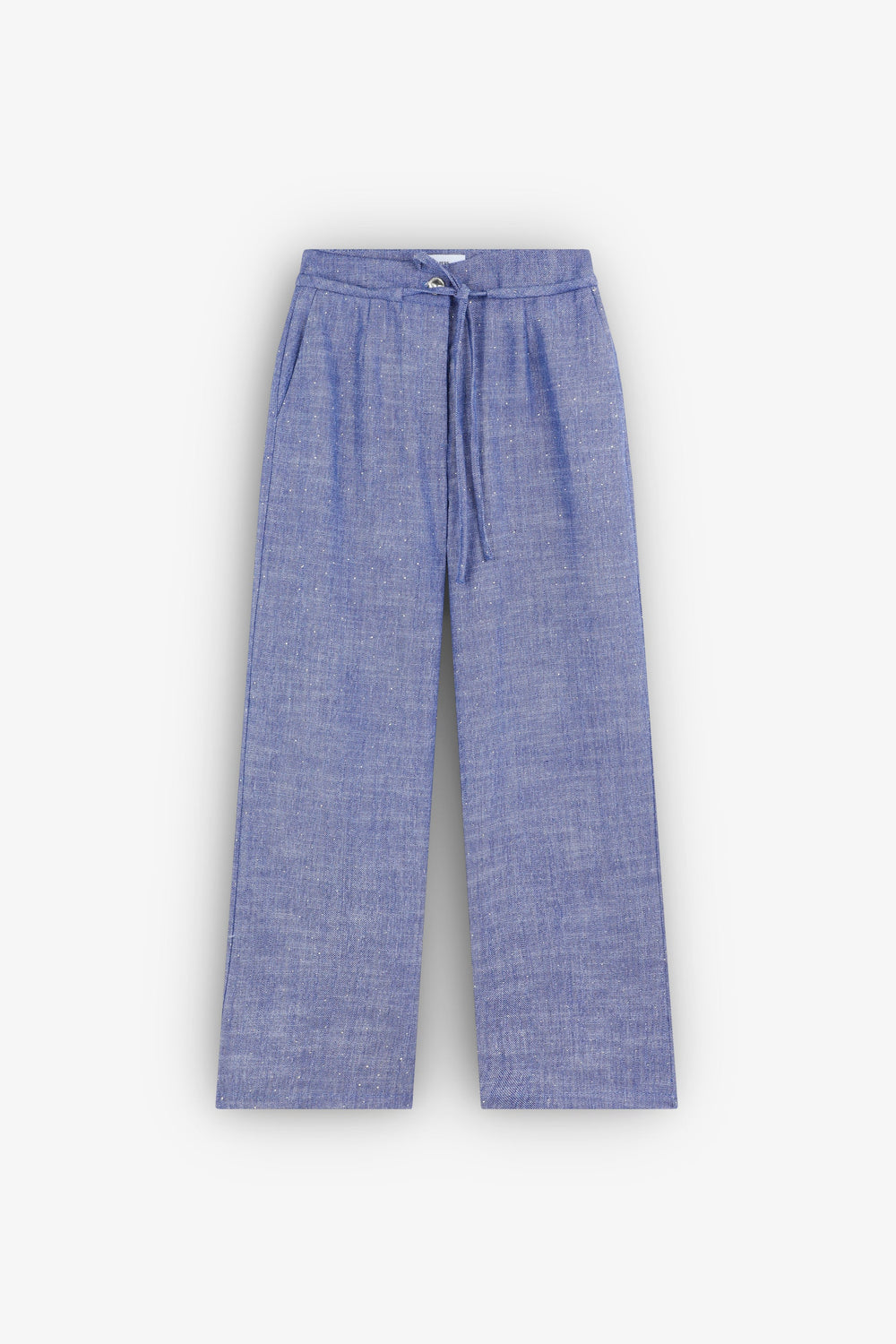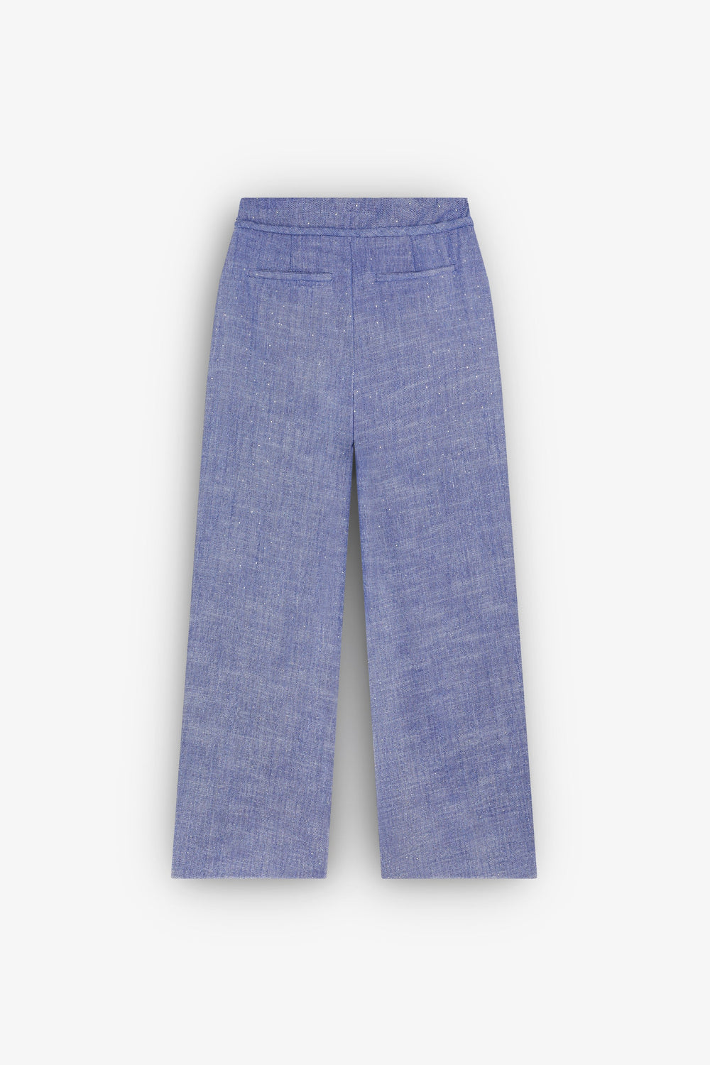 Cotton and linen blend trousers with rhinestone details. Culotte style, regular fit, zip and button fastening with adjustable drawstring detail. Side pleated pockets.