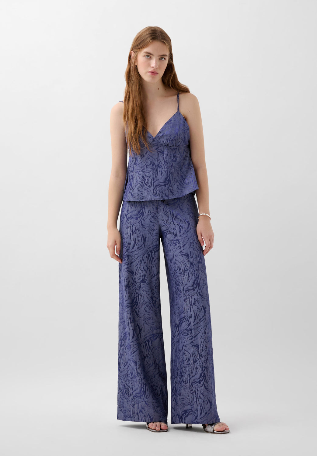 Trousers made of jacquard print fabric. Regular fit, high waist and zip and button fastening.
