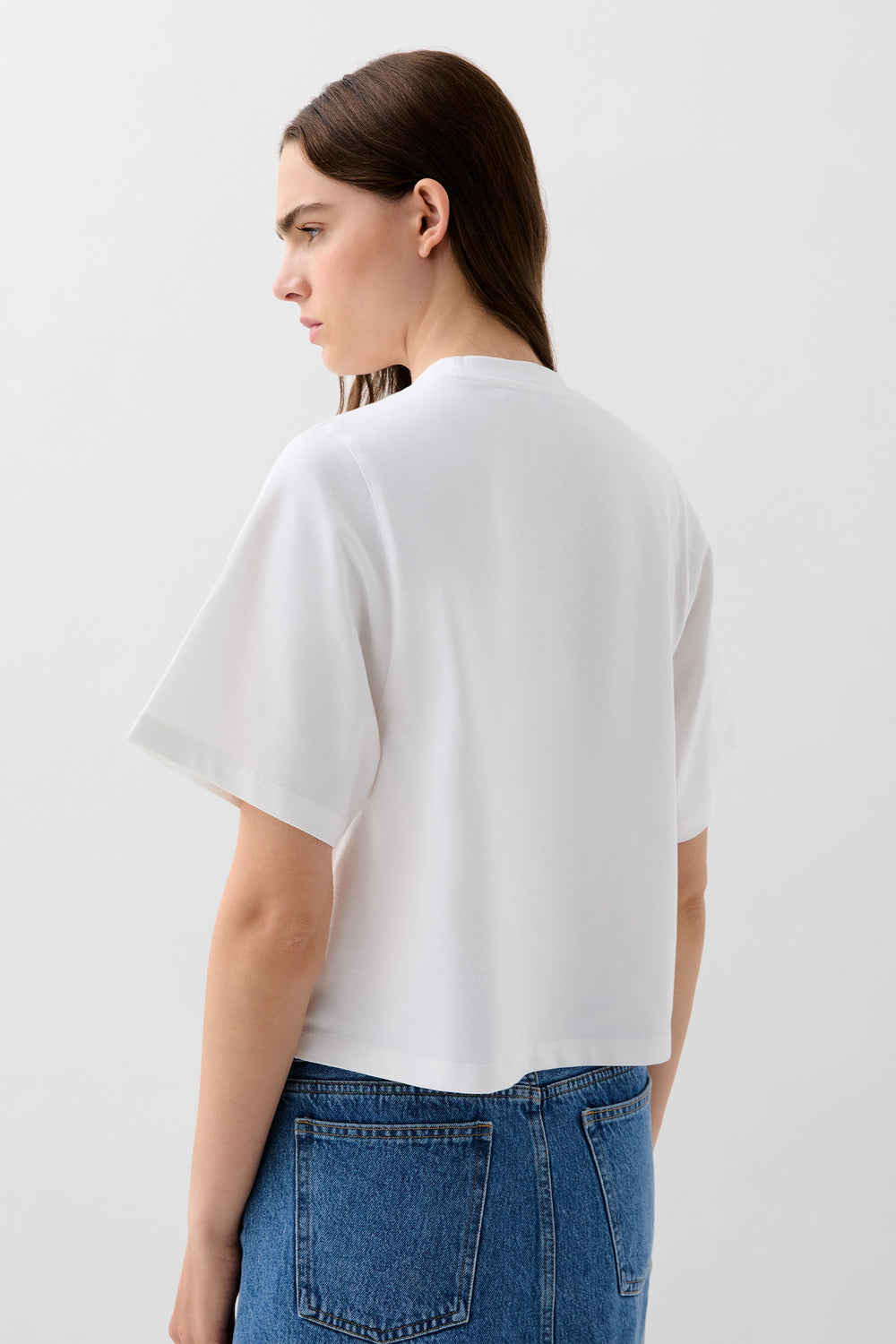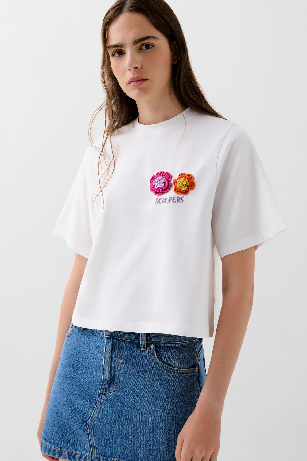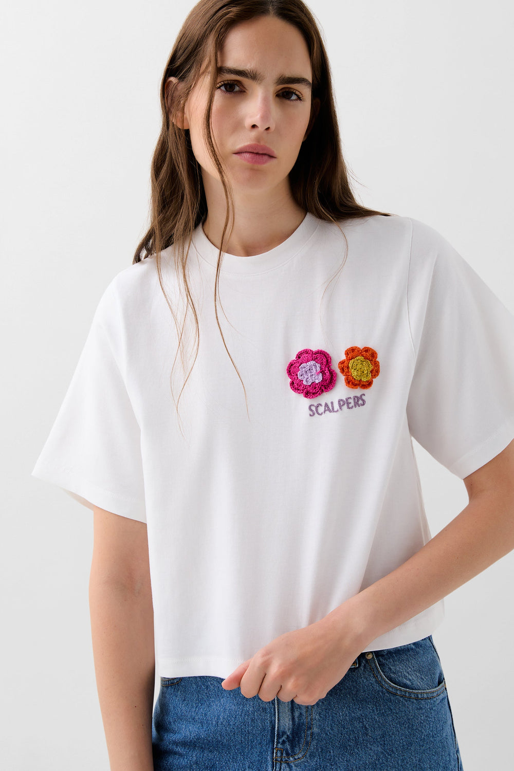 T-shirt made of 100% cotton with crochet detail and embroidered logo on chest. Slightly oversize fit, round neck and short wide sleeves.
