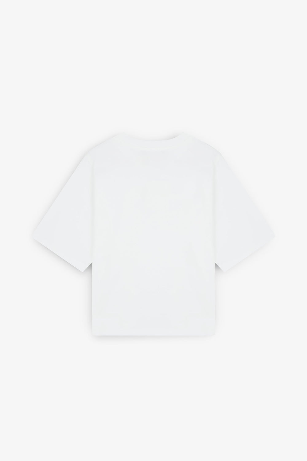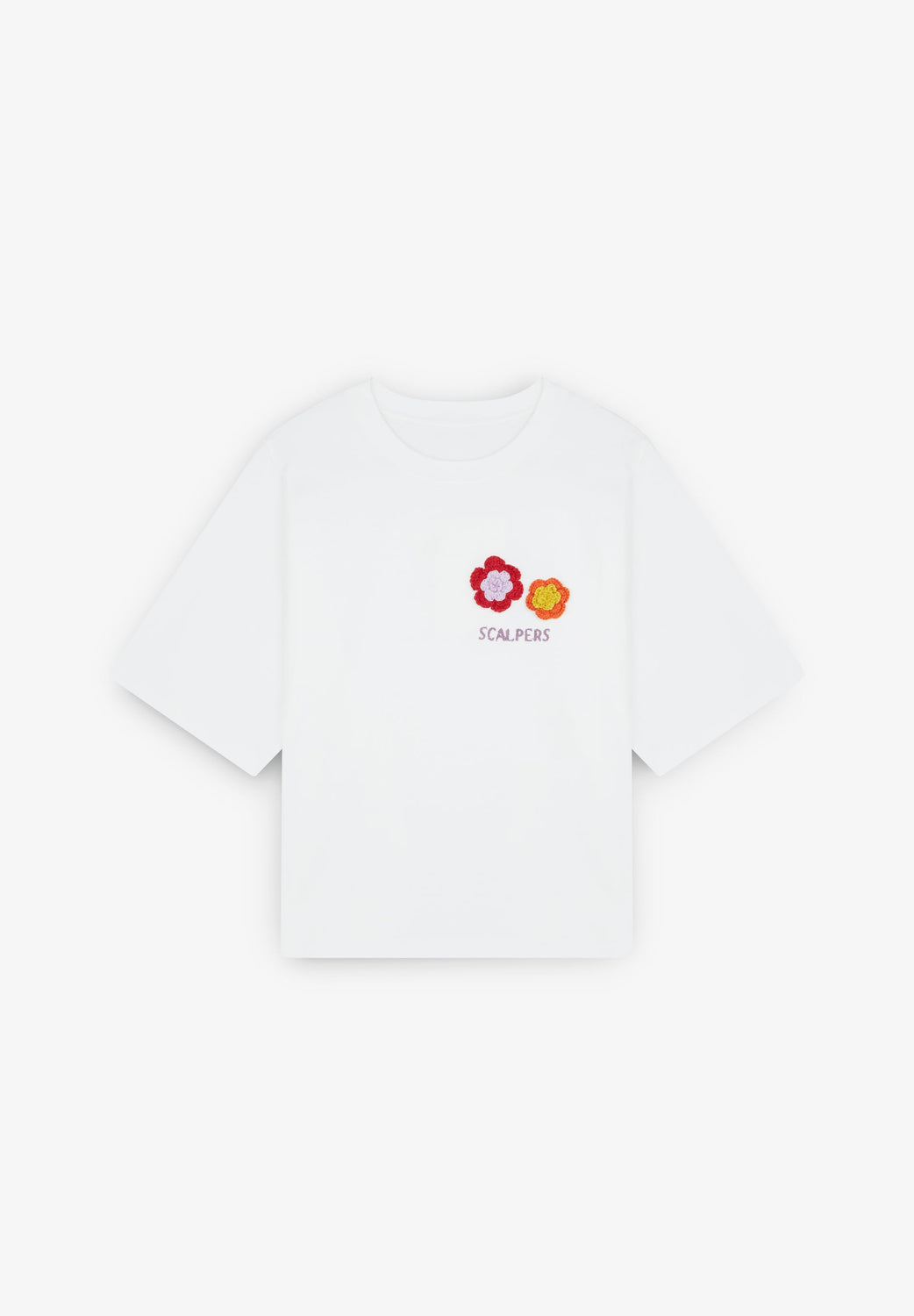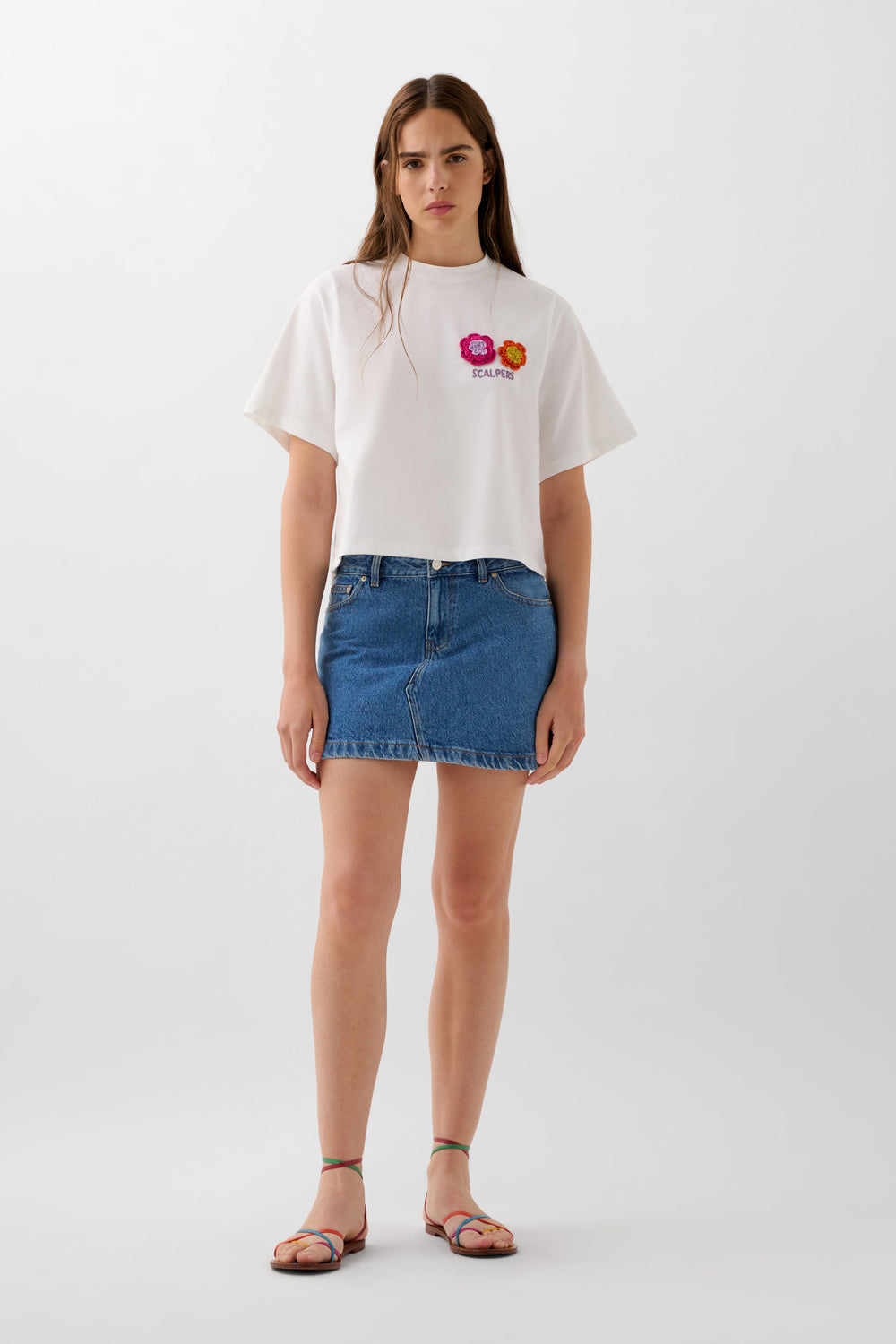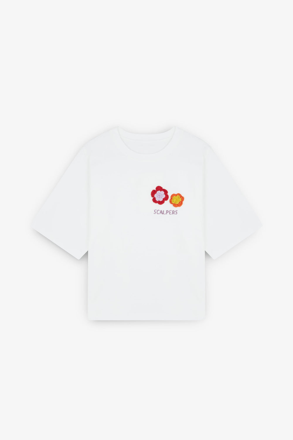 T-shirt made of 100% cotton with crochet detail and embroidered logo on chest. Slightly oversize fit, round neck and short wide sleeves.