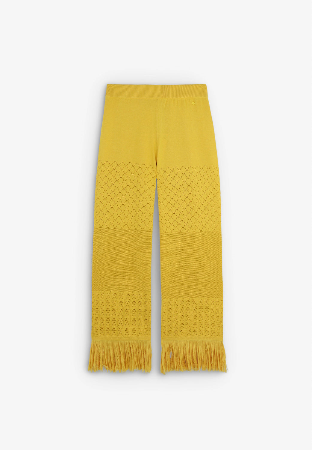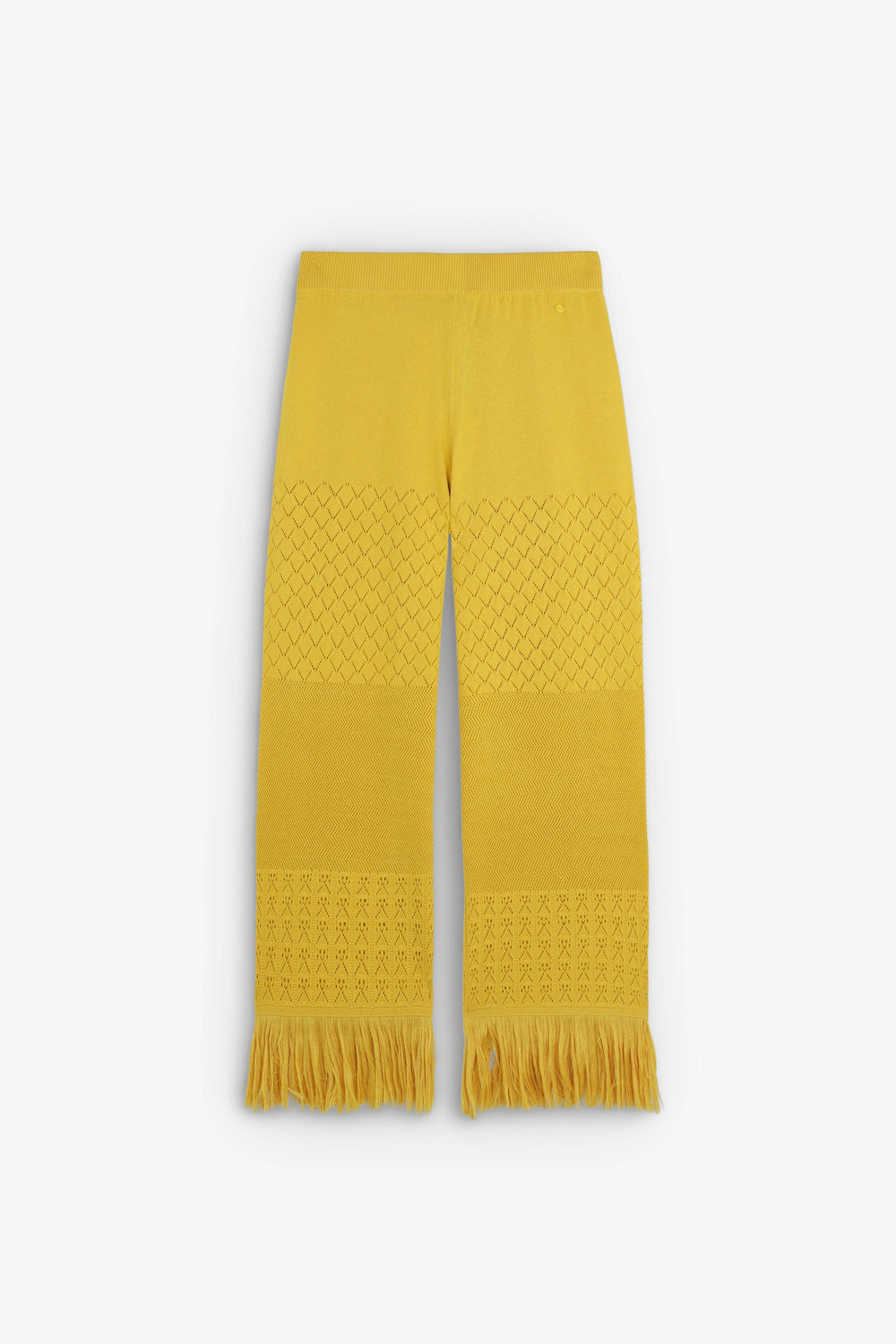 Cotton pointelle knit trousers. Ribbed at the waist. Frayed detail on the hems.