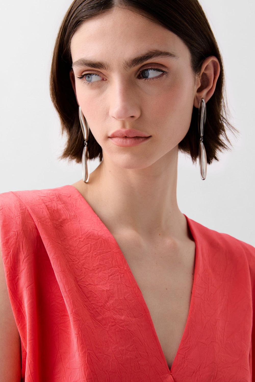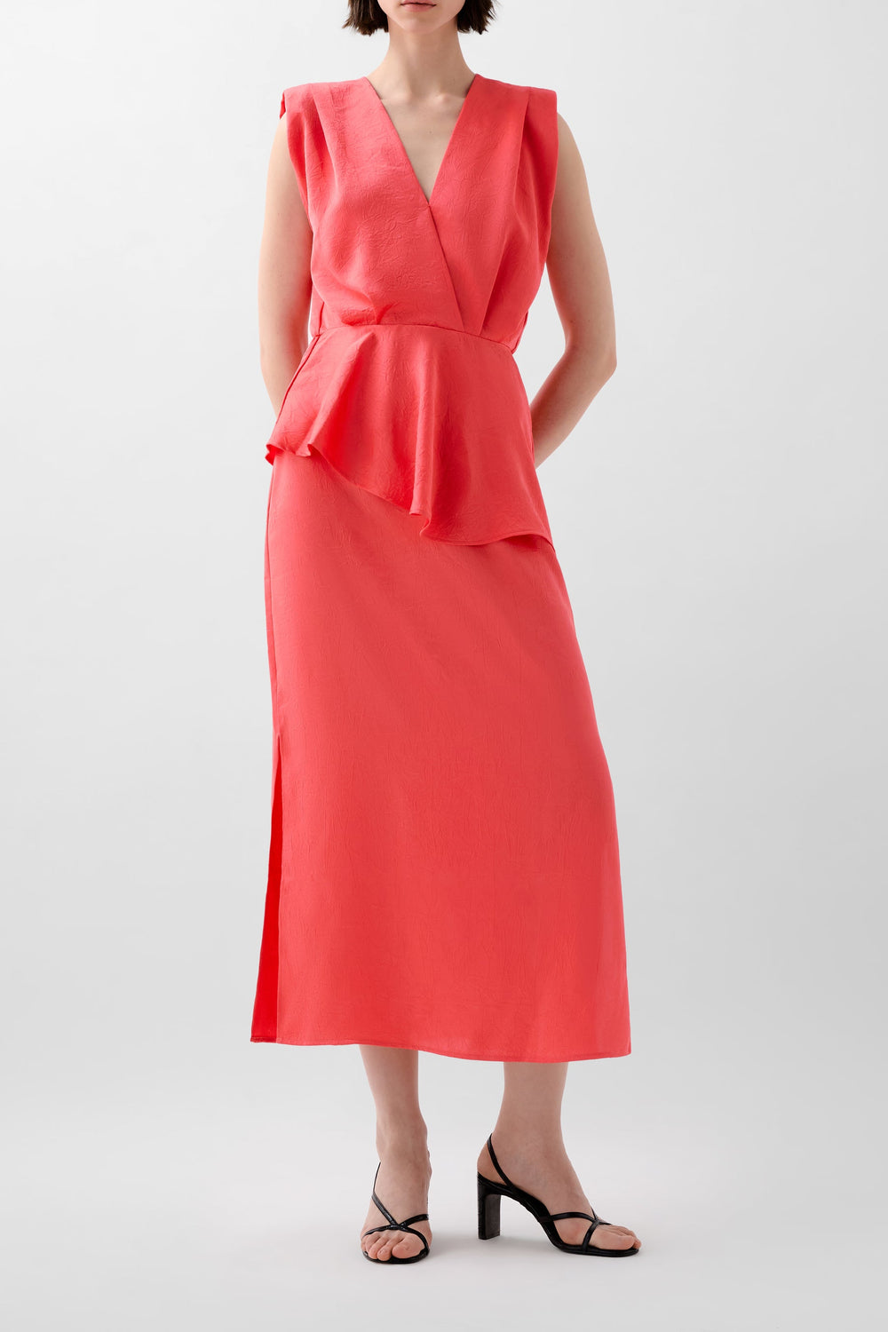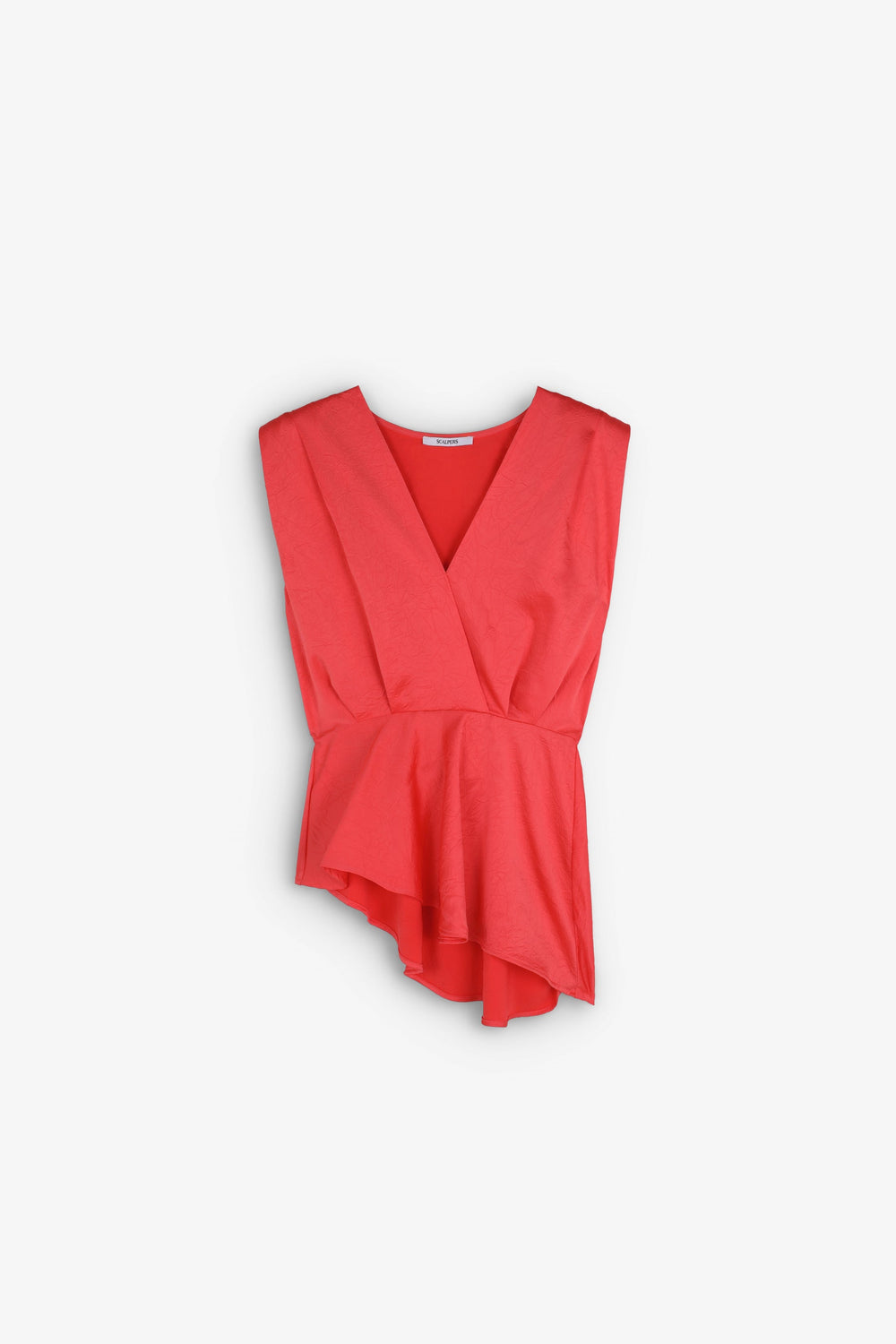Top made of stretchy fabric with texture. Regular fit, V-neck, sleeveless design with slightly padded shoulders. Pleated at the bust, gathered waist and ruffle on the hem.