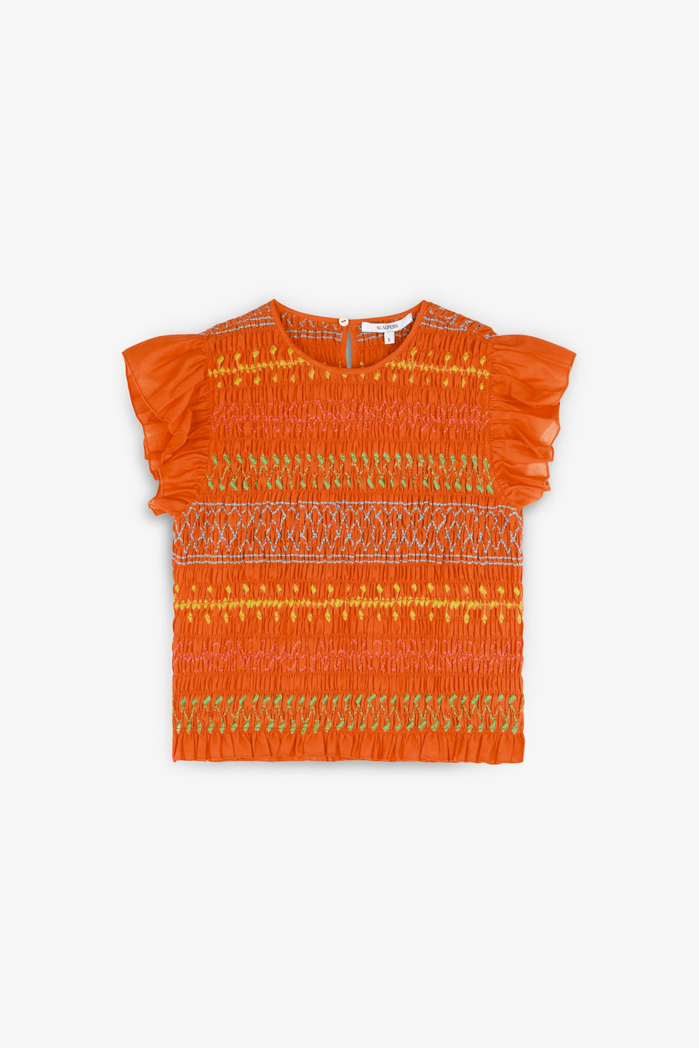 Top made of slightly stretchy cotton blend with smocking body and short sleeves with a slight frill. Slim fit, slightly cropped cut with round neck and button fastening at the back.