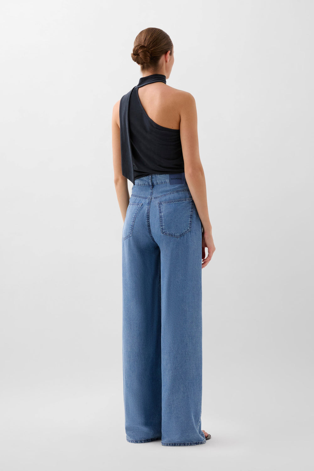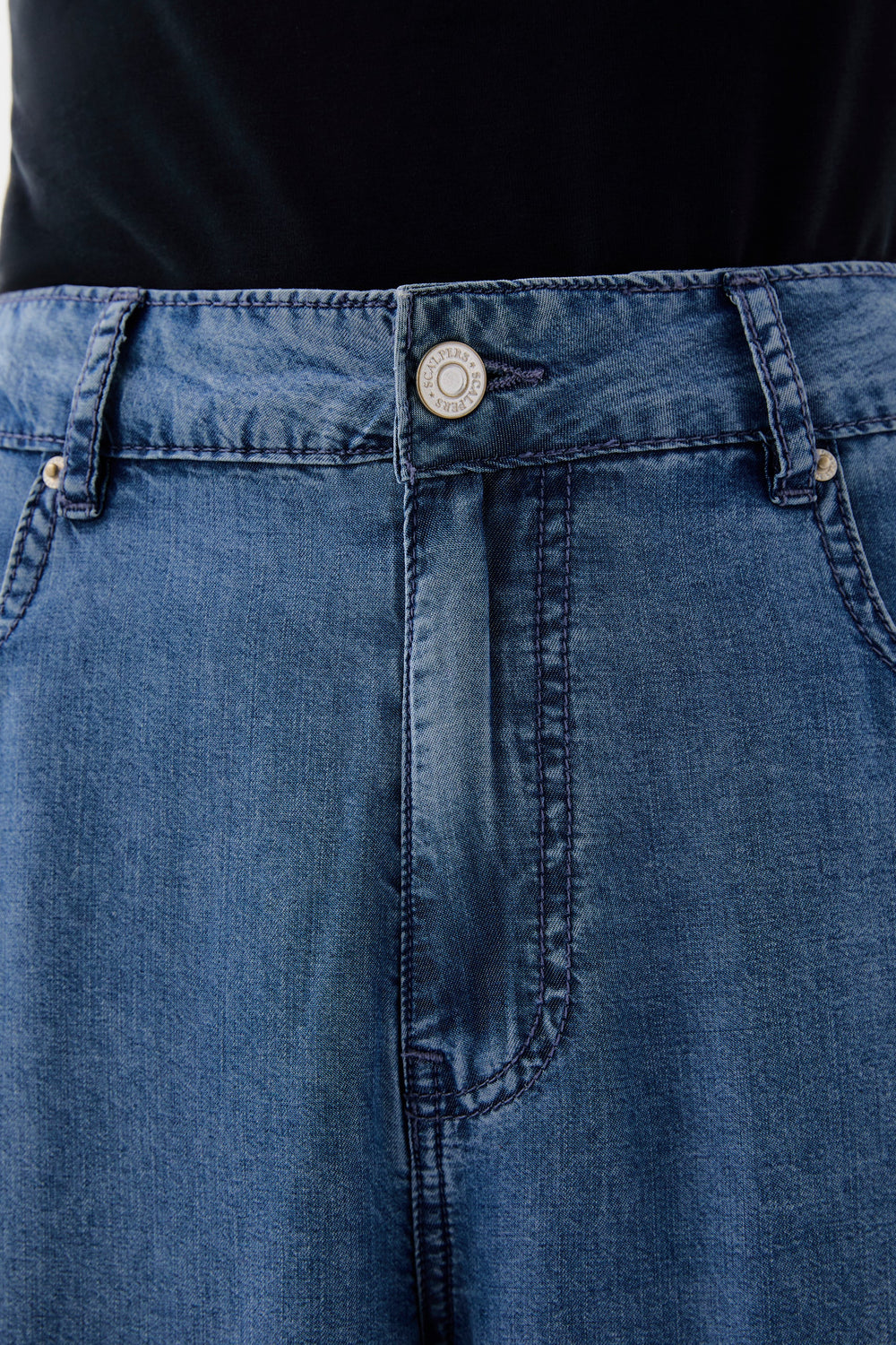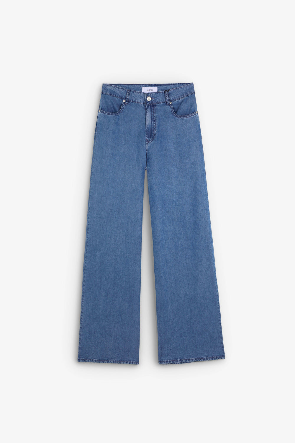 Trousers made of a flowing fabric. Full length, high waist, zip and button fastening with belt loops. Back and front pockets.