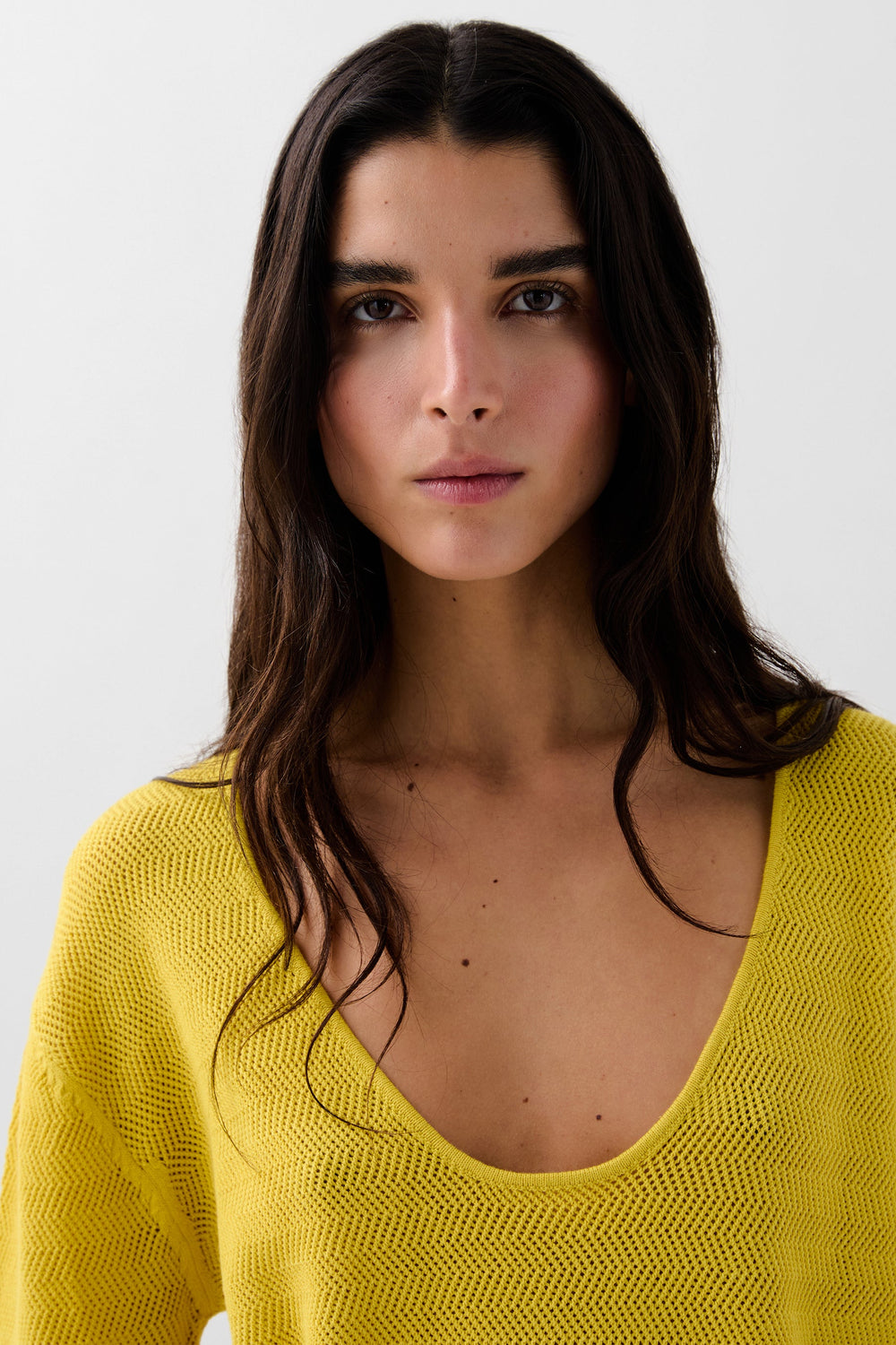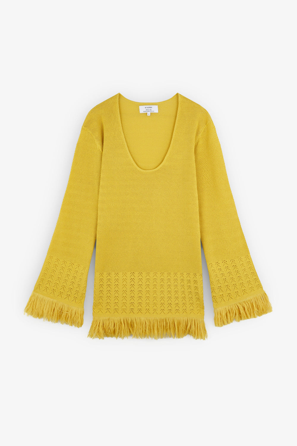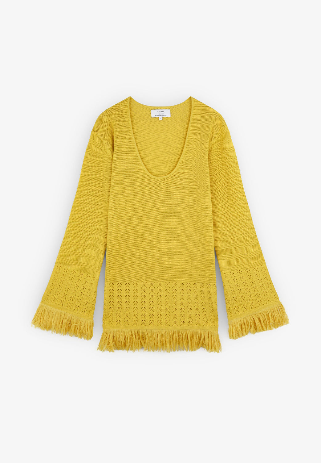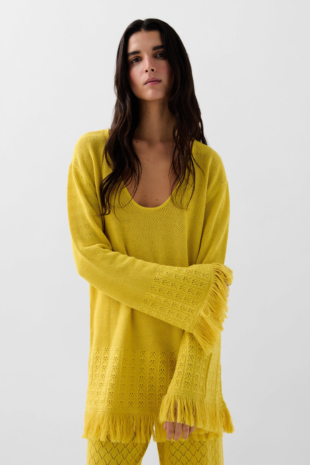 Sweater made of slightly stretchy knit. Regular fit, round neck and long sleeves with fringed hem.