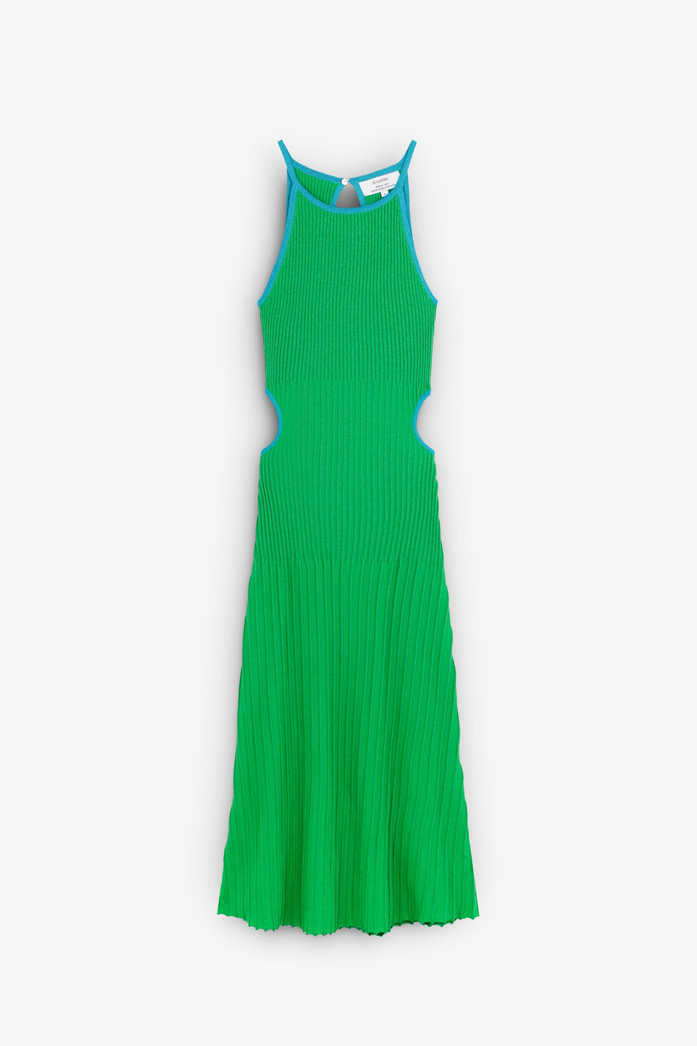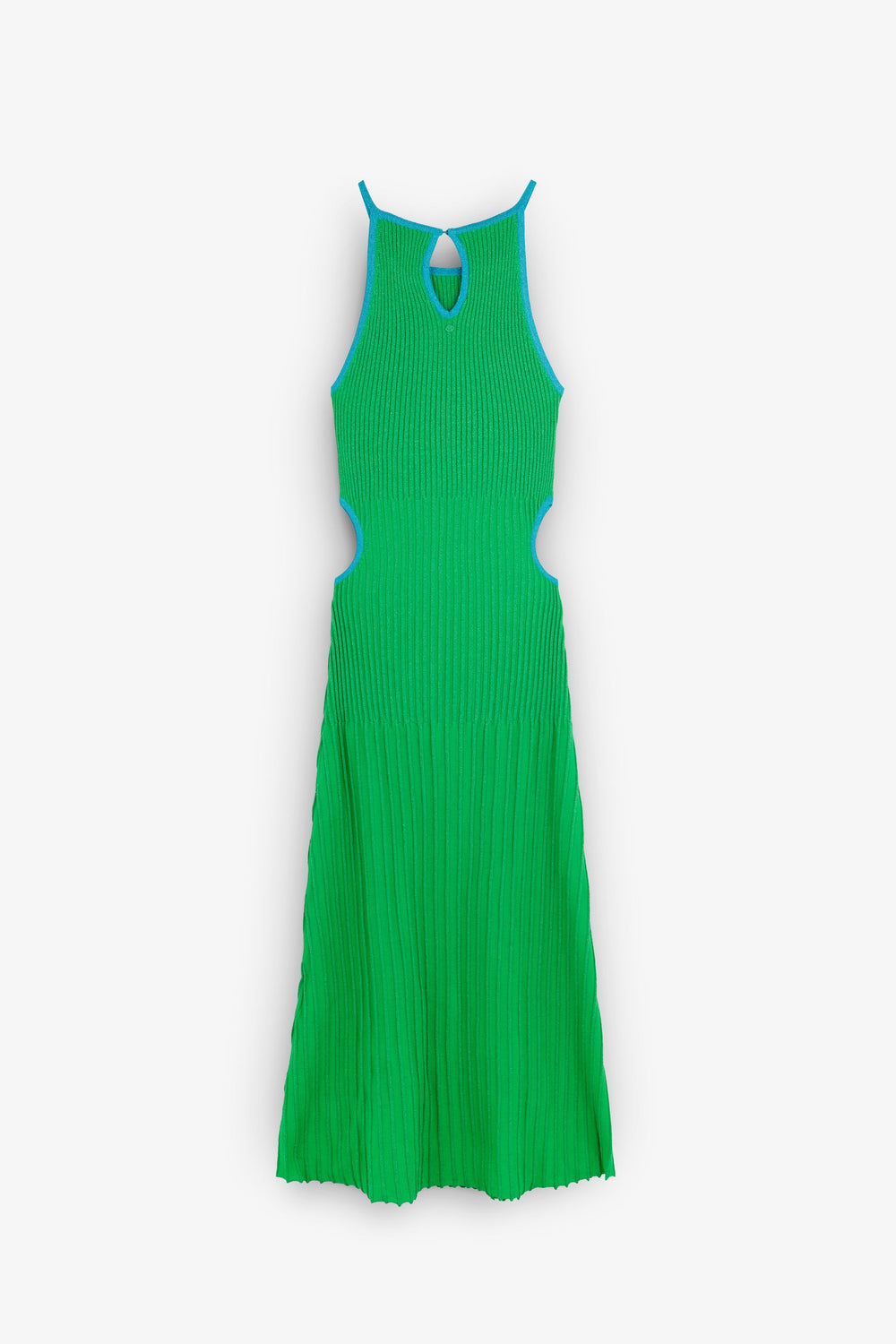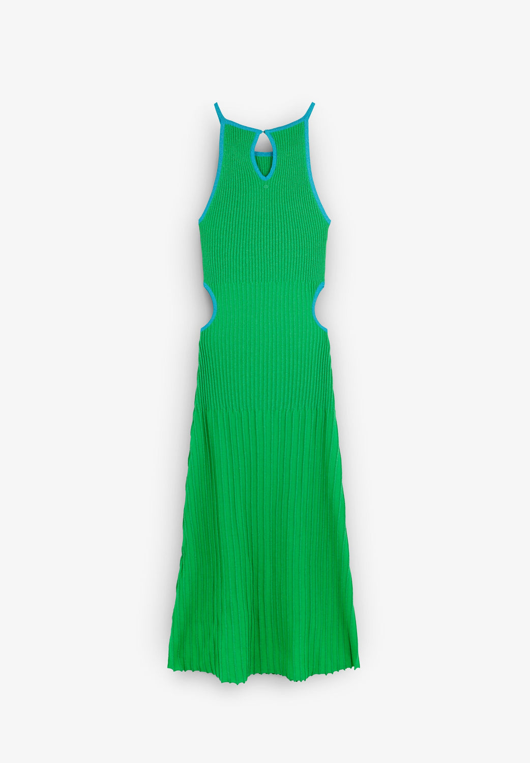 Slightly stretchy knit dress with metallic thread. Slim fit, round neckline and side slits. Contrast piping.