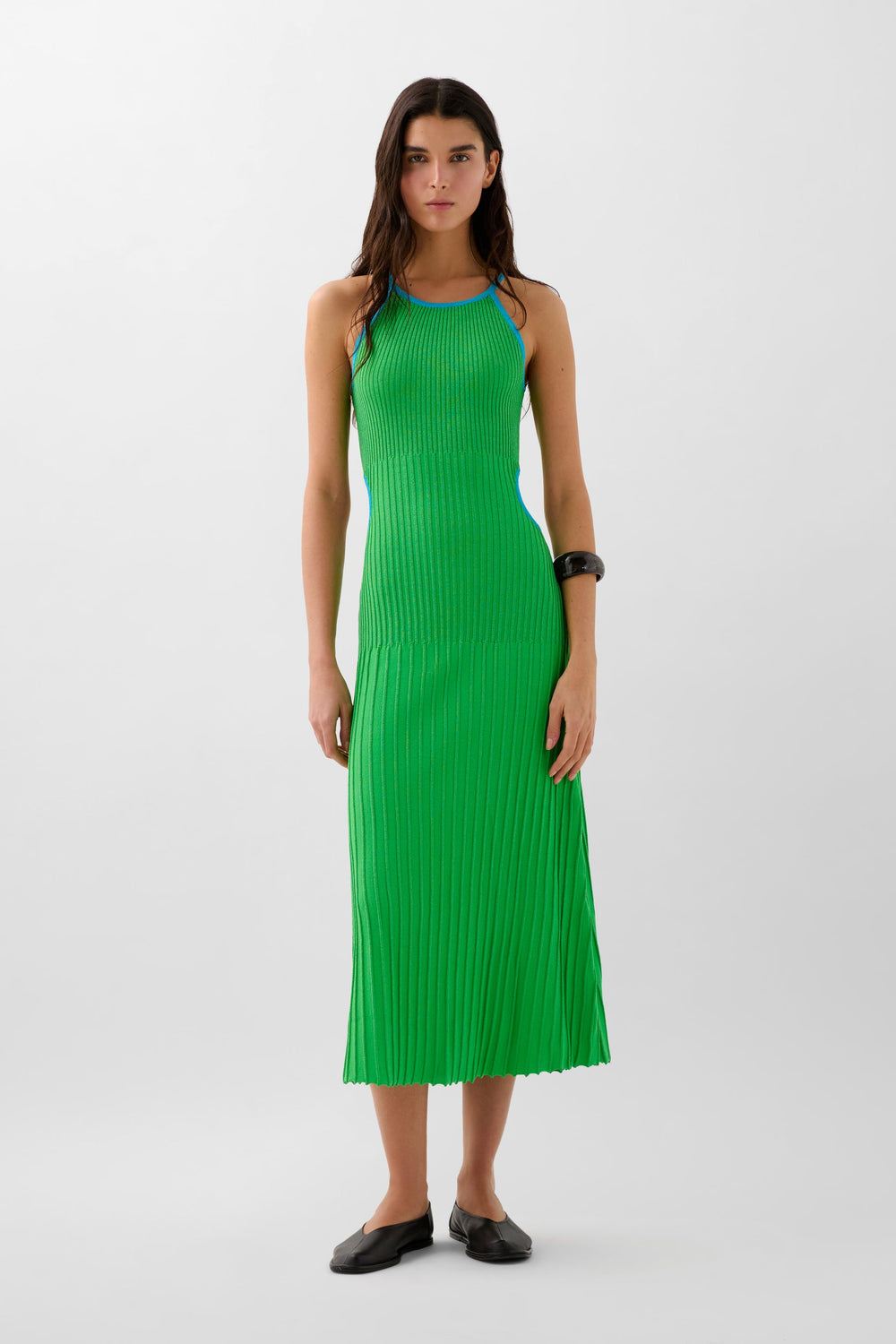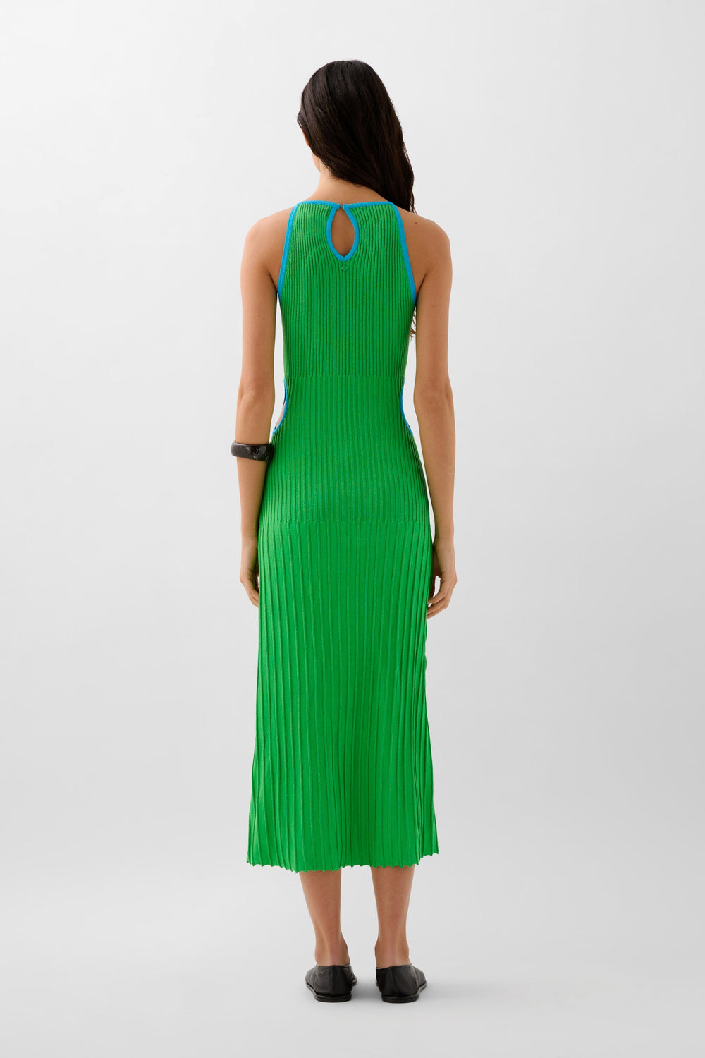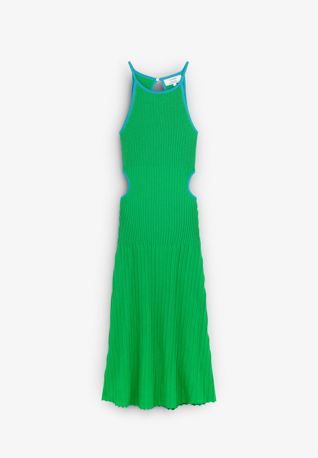 Slightly stretchy knit dress with metallic thread. Slim fit, round neckline and side slits. Contrast piping.