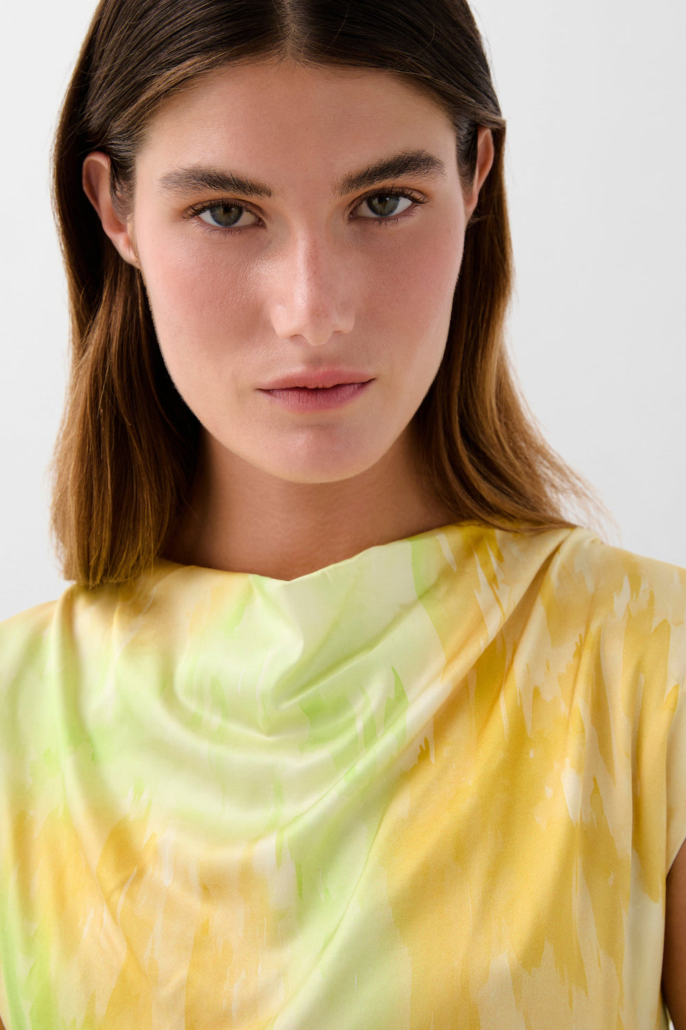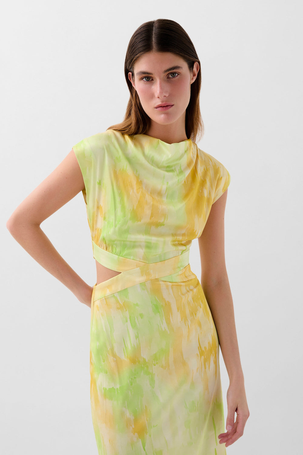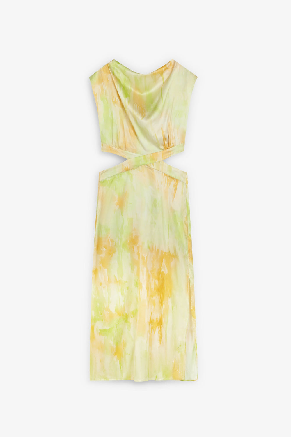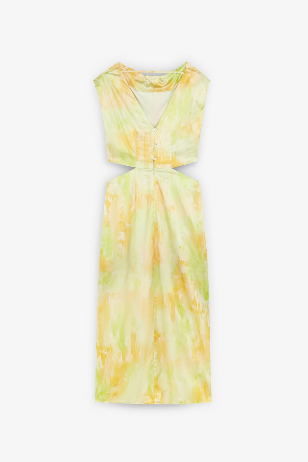 Dress made of flowing fabric with tie-dye print. Regular fit, sleeveless design with draped neckline and crossover detail with cutouts at the waist. Button fastening at the back.