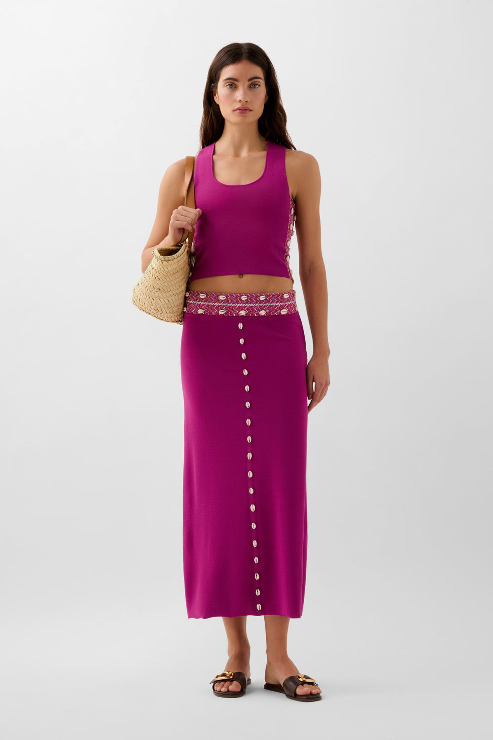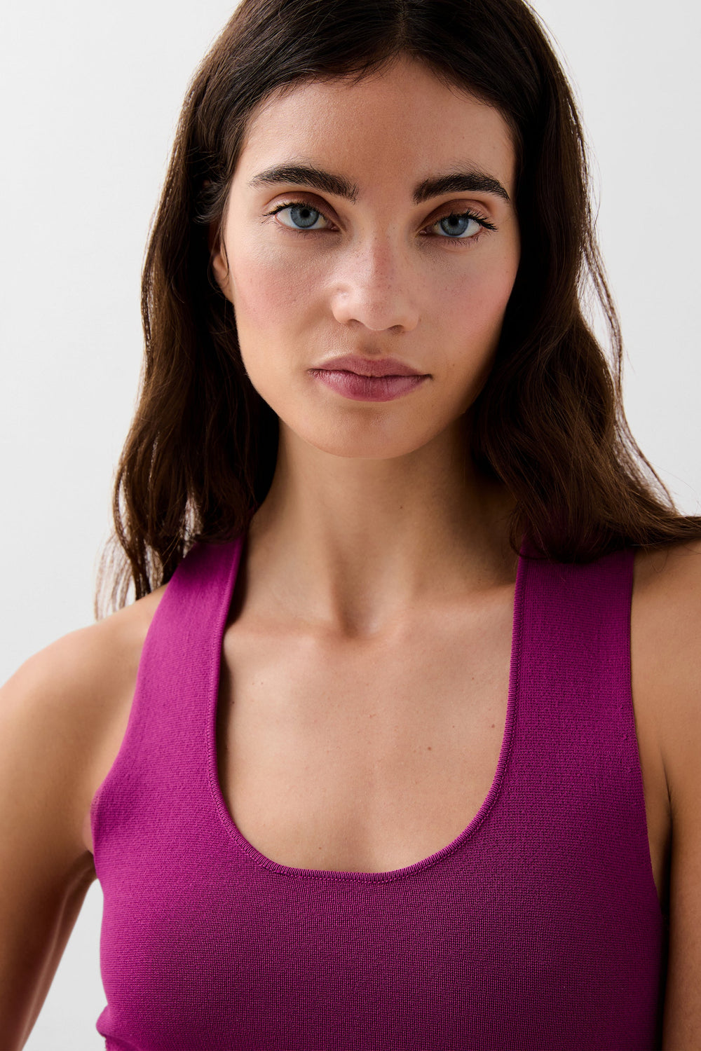 Top made of slightly stretchy knit fabric. Slim fit, round neck and sleeveless with wide printed crossed straps. Shell details on the sides.