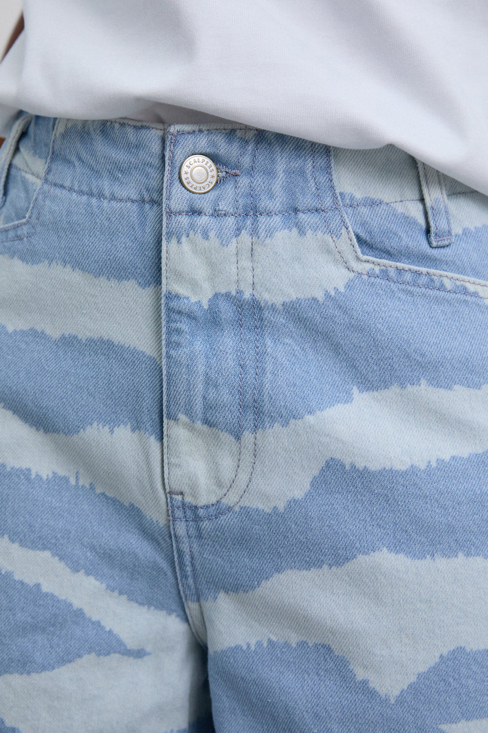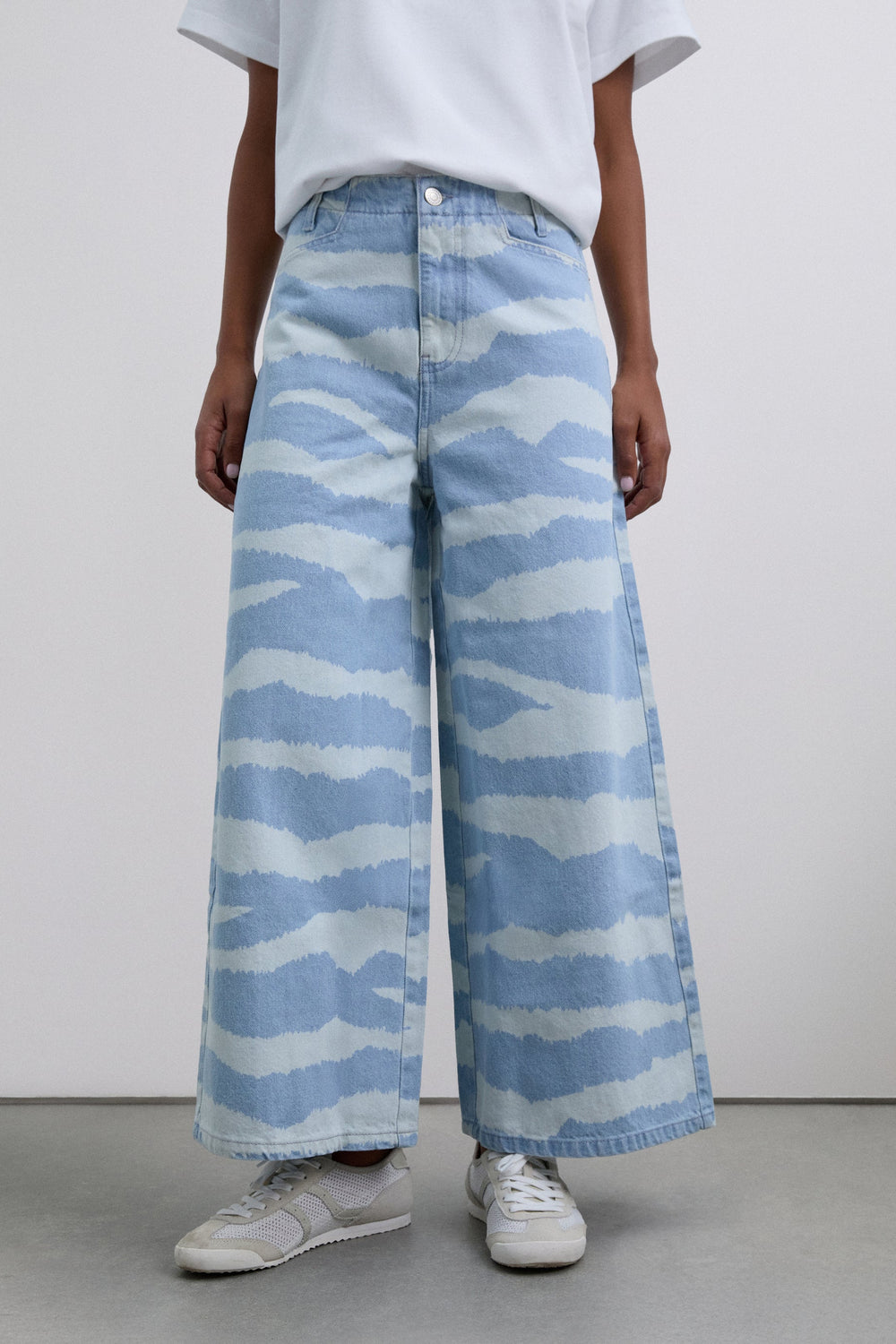 Jeans made of 100% organic BCI cotton. Culottes fit. Two front pockets and two back pockets. Zip and button fastening Animal print motif.