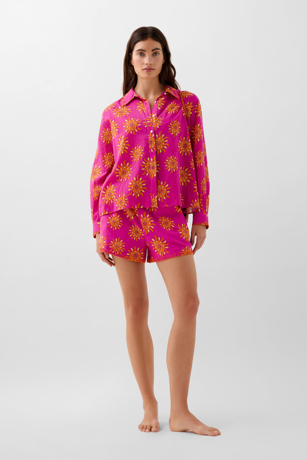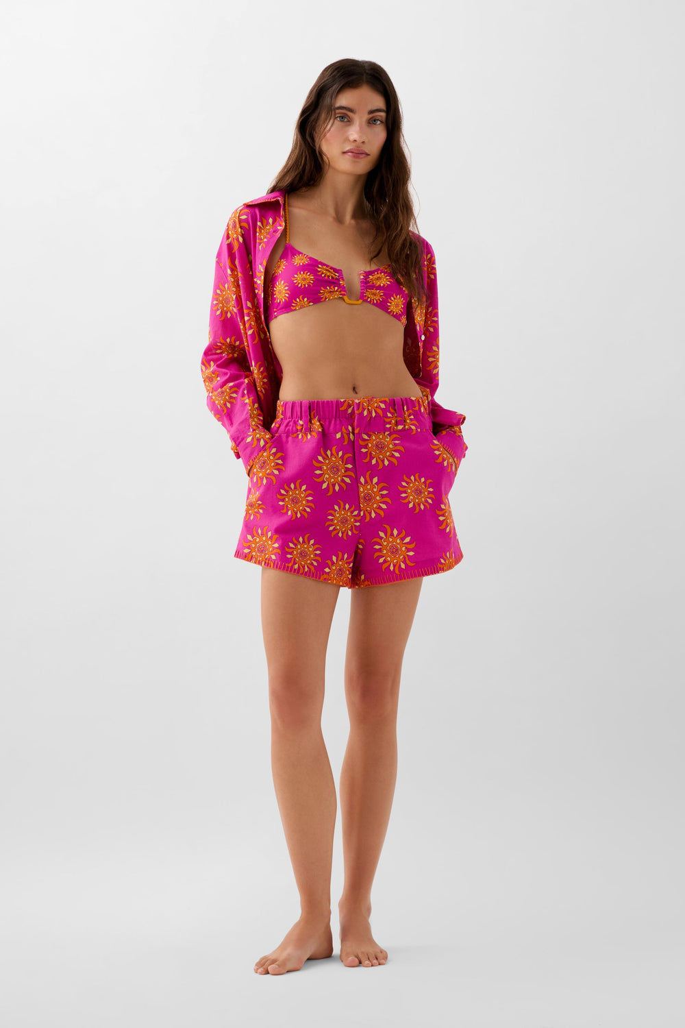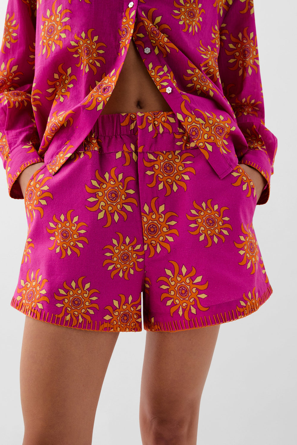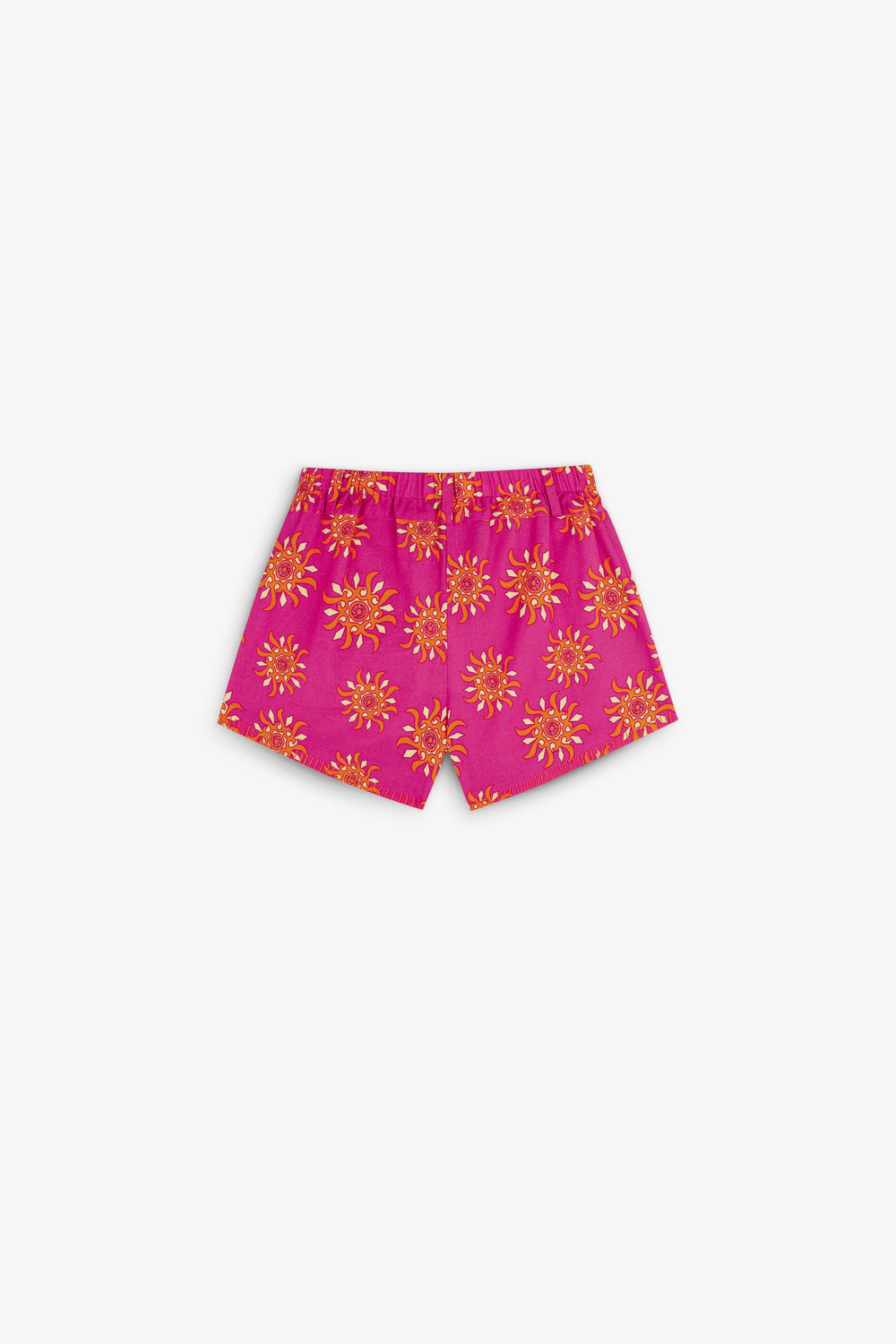 Shorts made from a cotton and linen blend with a sun print. Elasticated waistband with concealed zip and hook fastening. Front slant pockets.