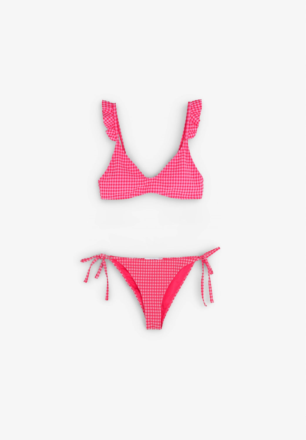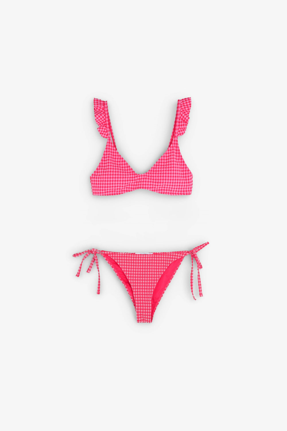 Gingham bikini. Made of technical fabric. Top with hook fastener and straps with ruffles. Classic bikini bottoms with side bow fastening.