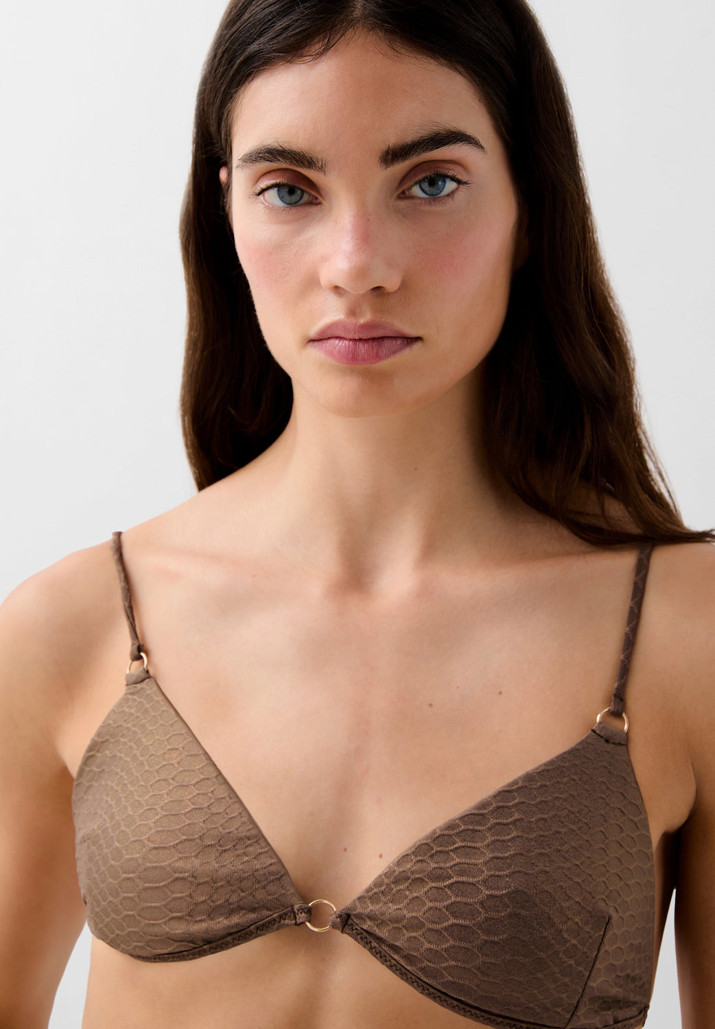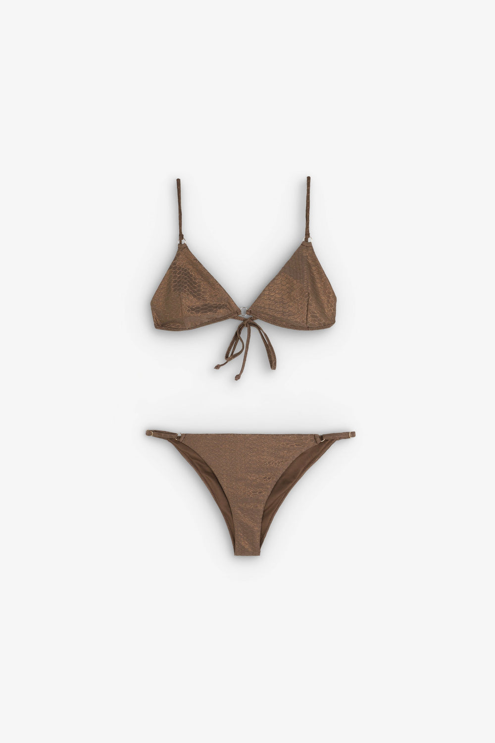 Bikini made of slightly stretchy technical fabric. Animal print, slightly metallic. Top with adjustable straps and tie back. Classic briefs.