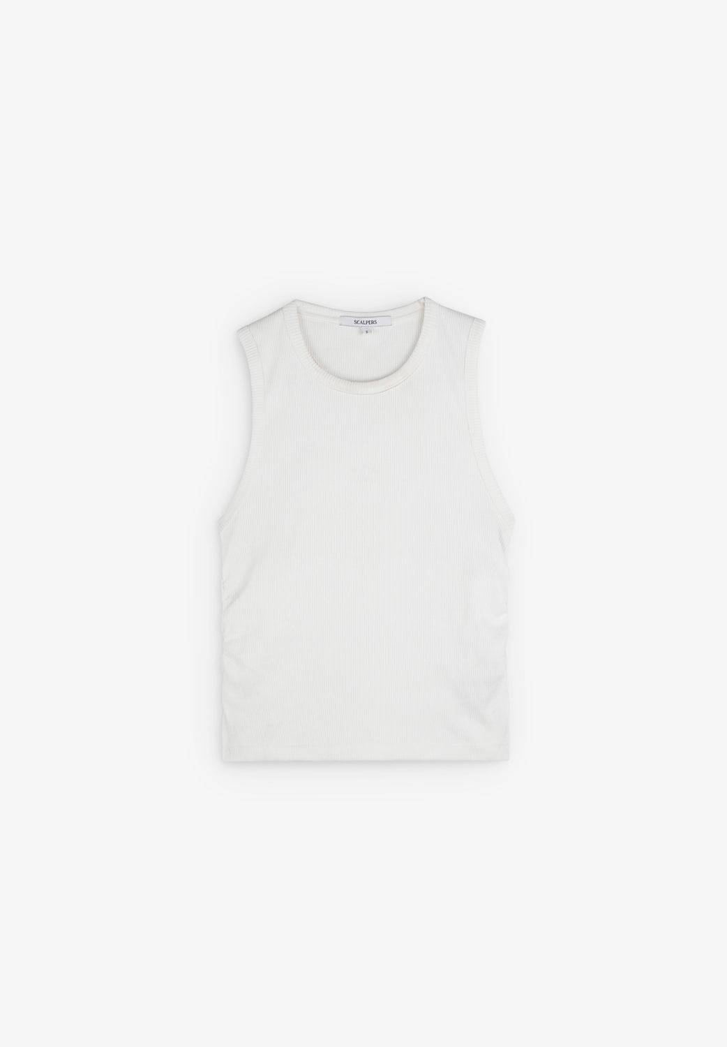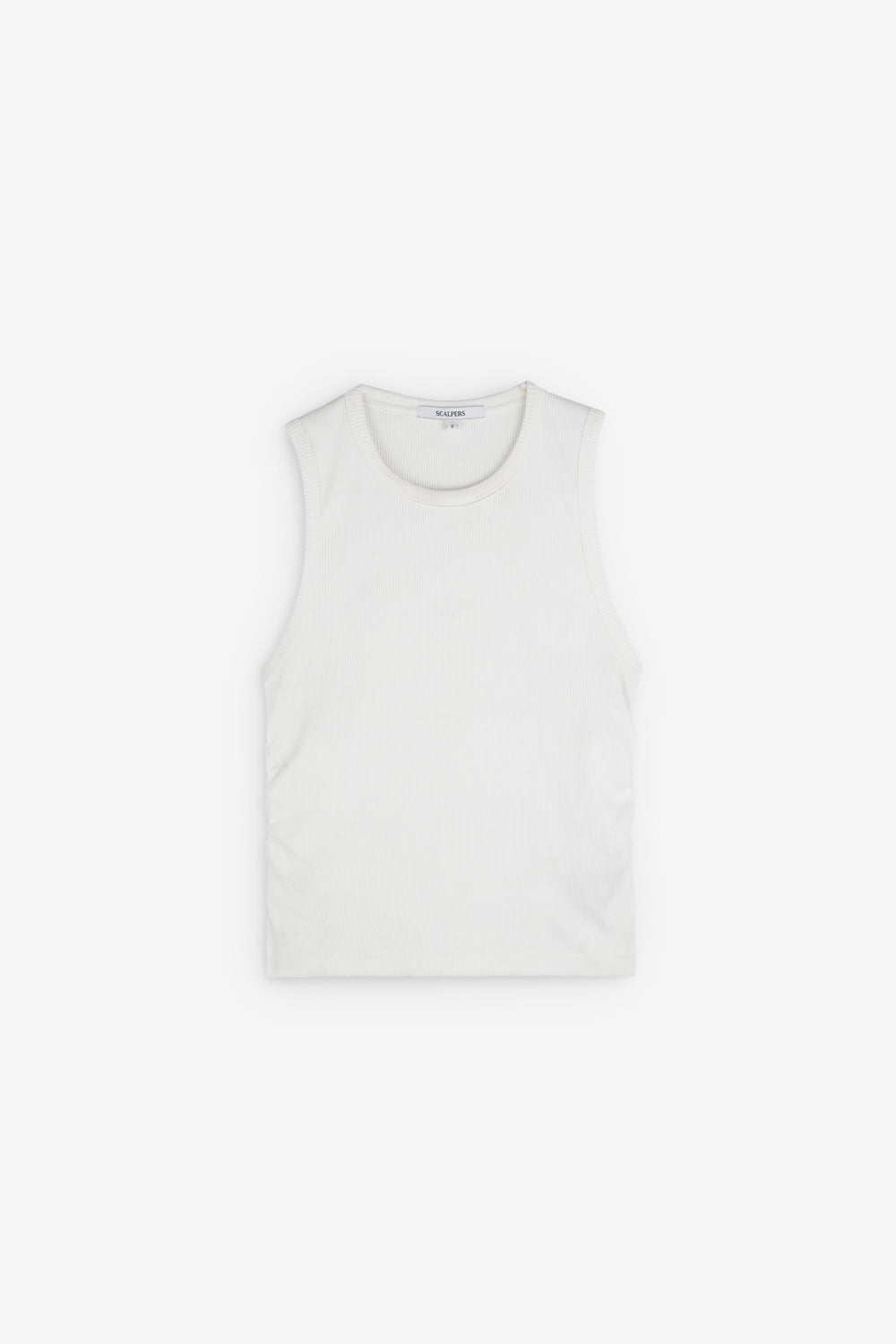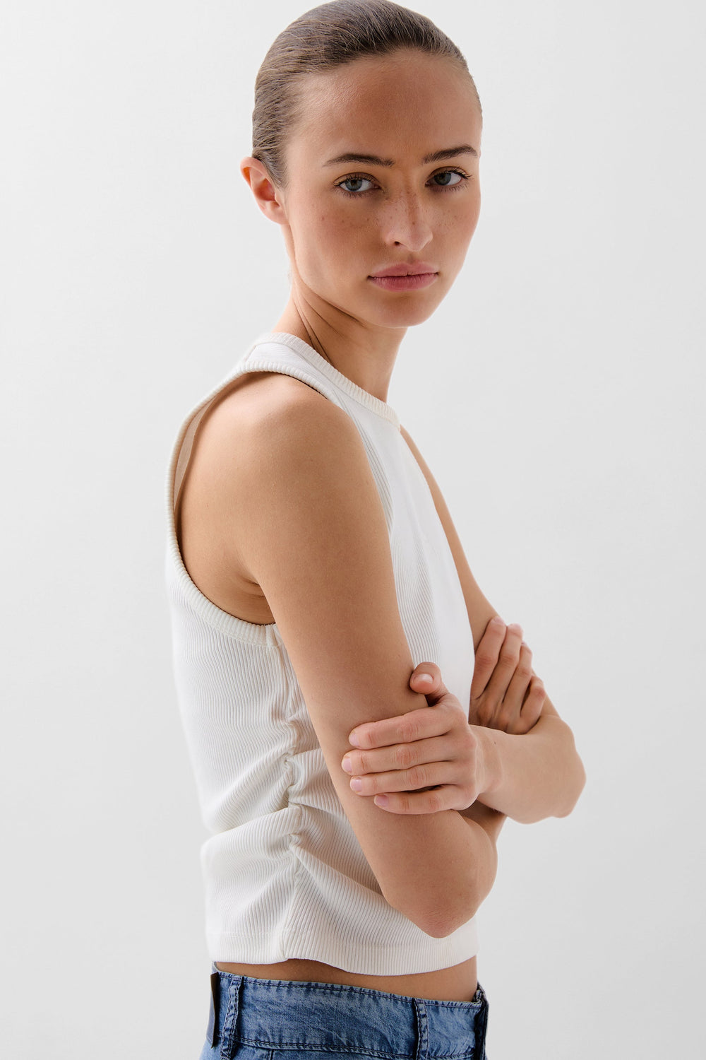 Tank top made of ribbed fabric in a 90% BCI cotton blend with elastane. Slim fit, round neck and sleeveless. Gathered side details.