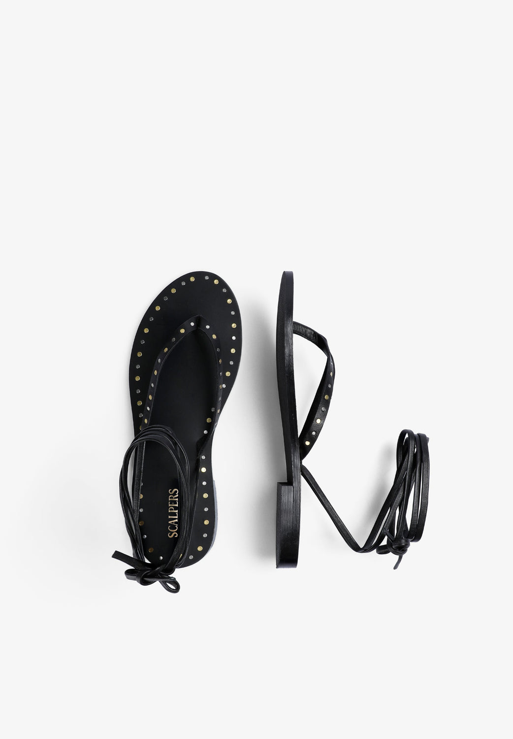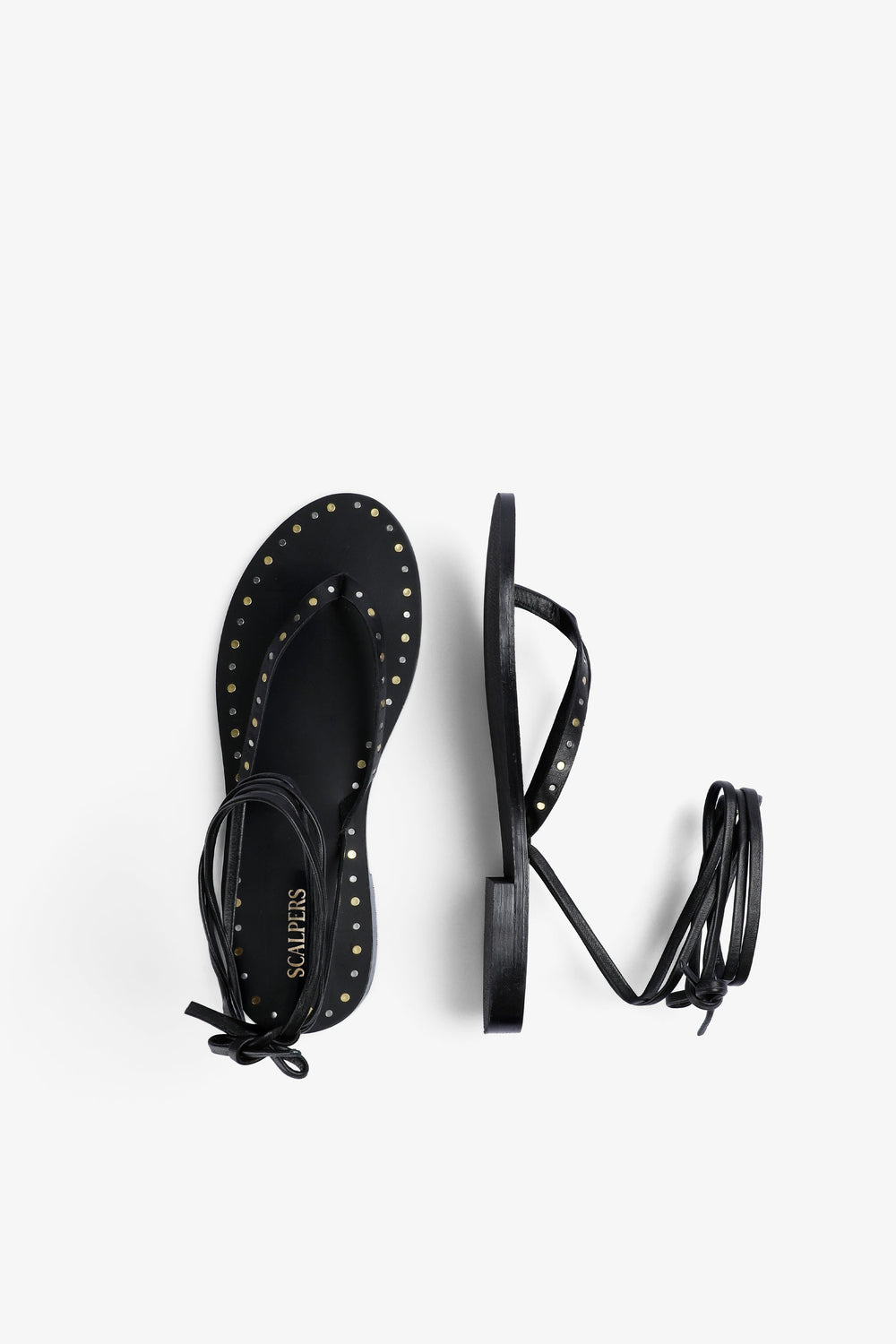 Heeled sandals made of 100% leather. Tie closure. Metallic details on edges.