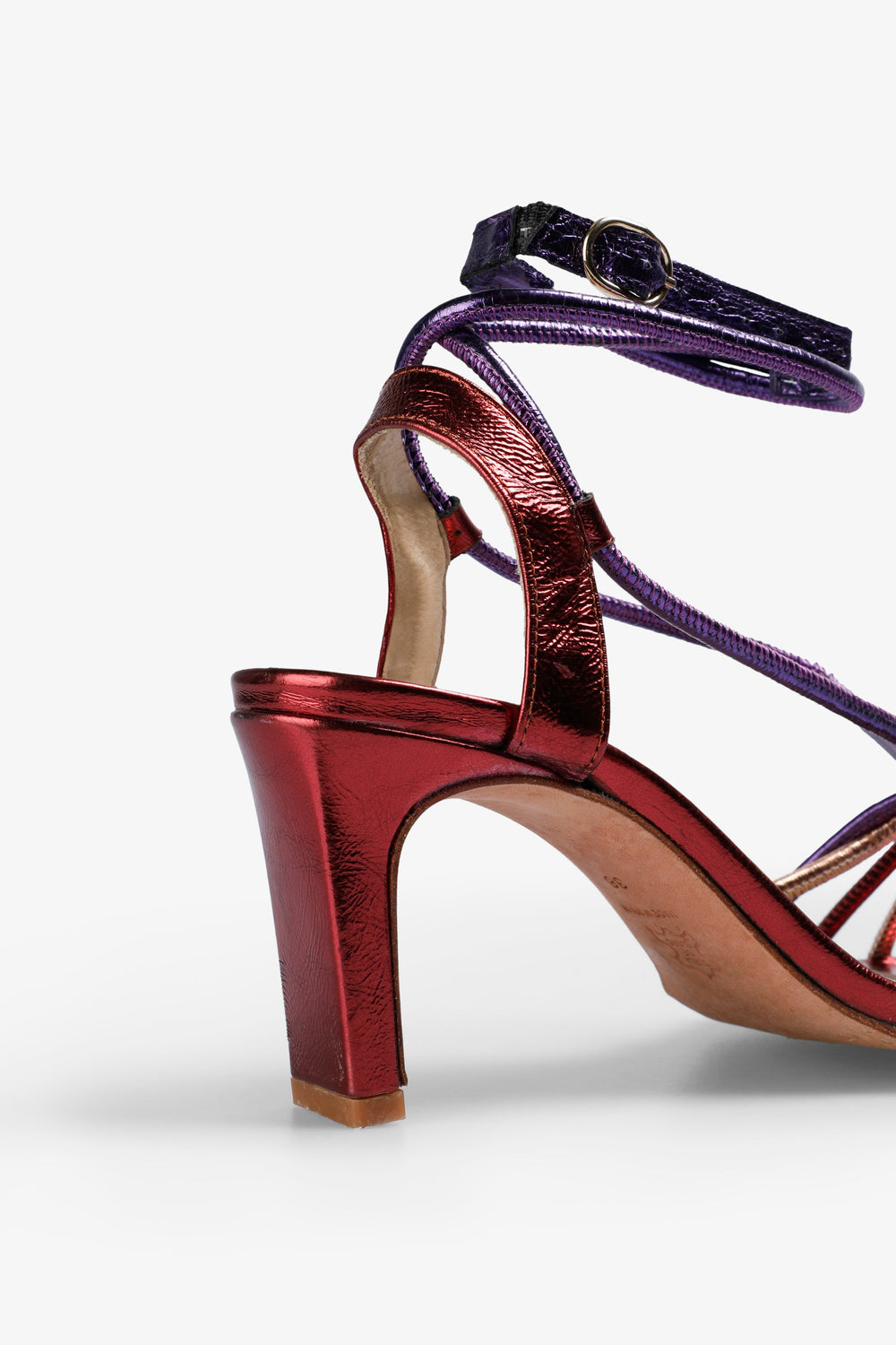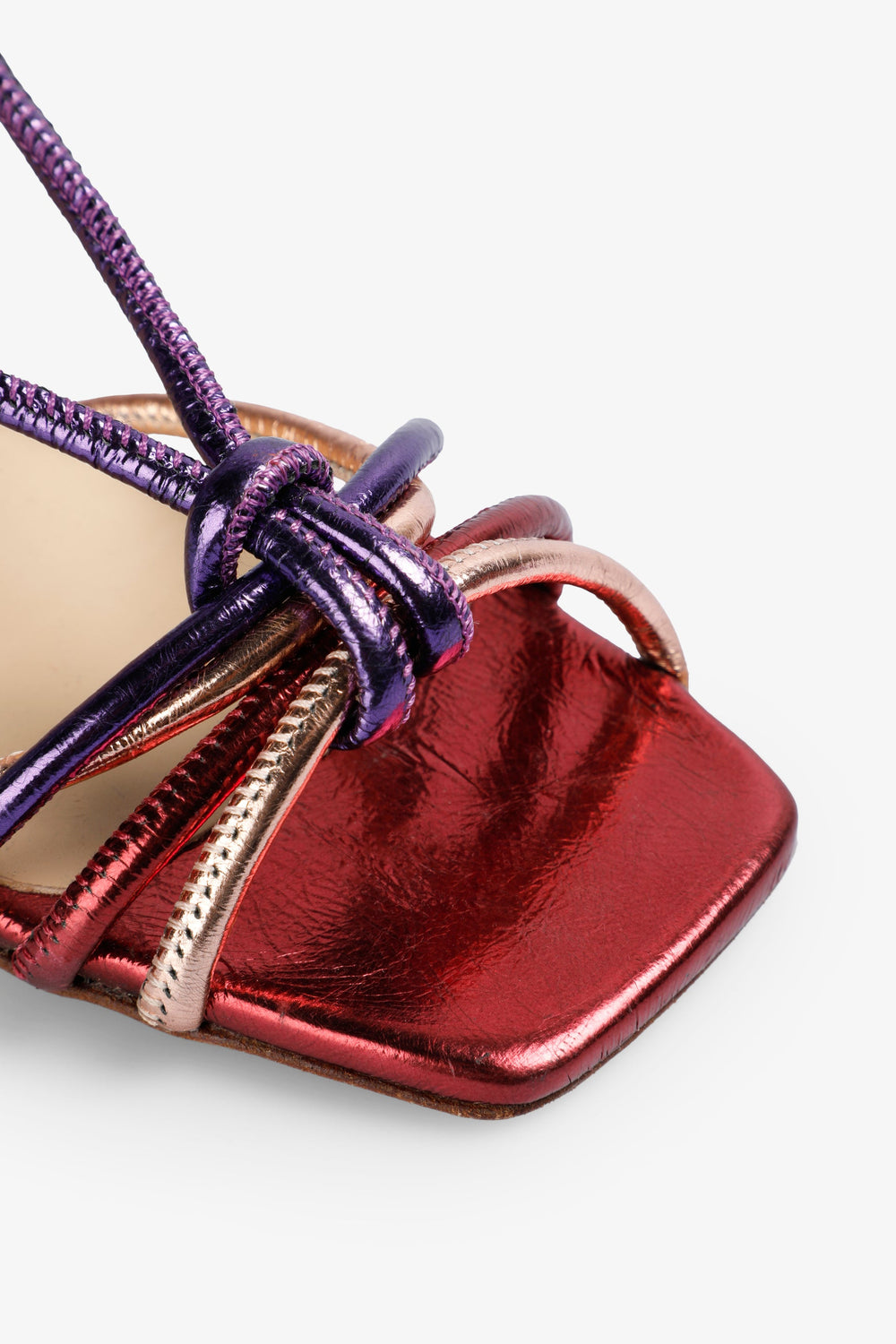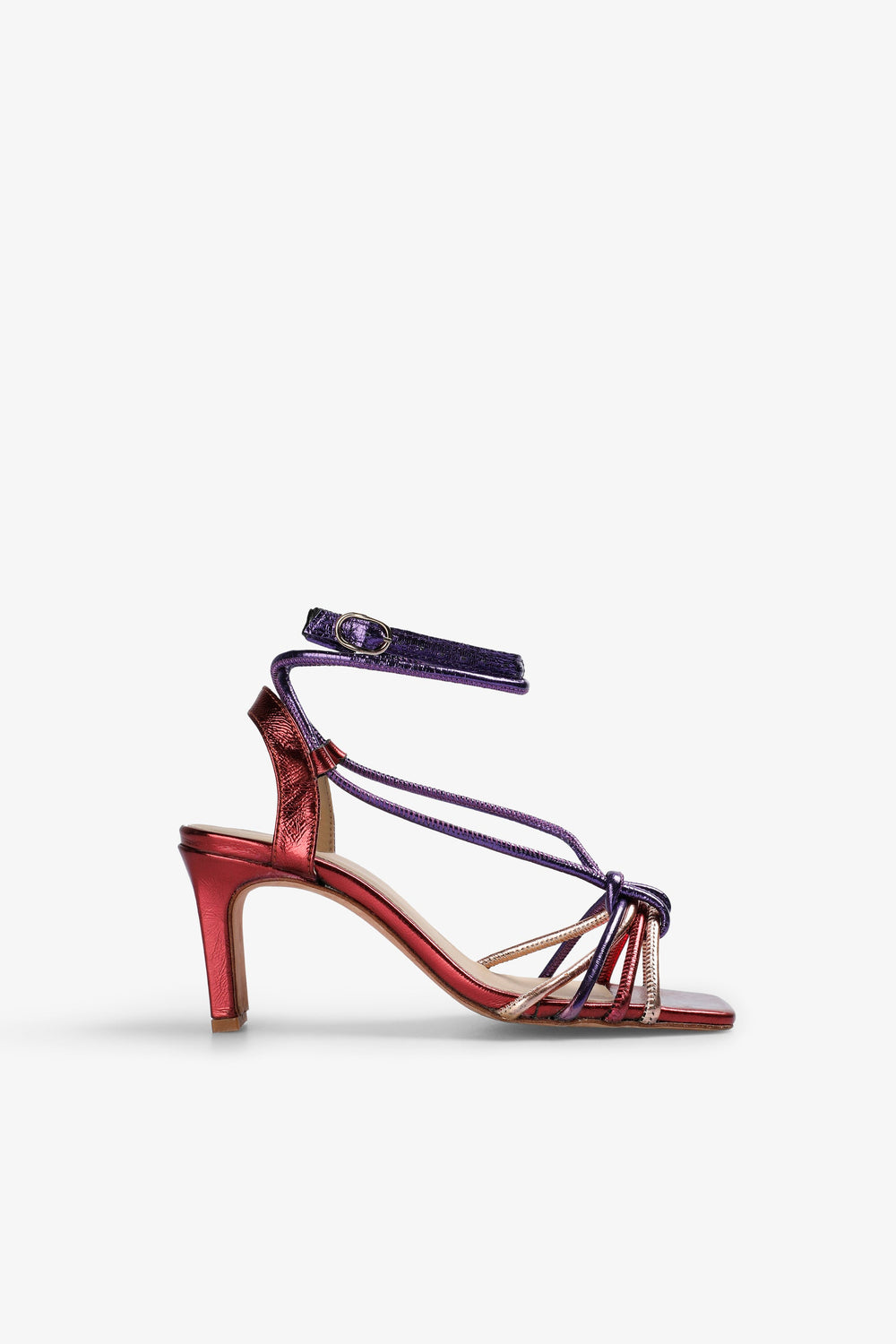 Heeled sandals made of 100% leather. Straps and front knot, tied at the ankle with a buckle.