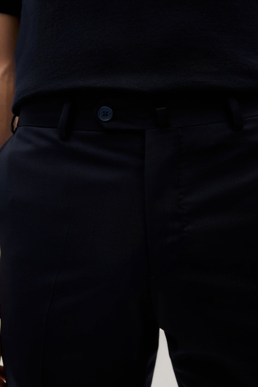 Trousers made of 100% Italian wool. Fastens with concealed zip, hook-and-eye fastening and buttoned placket. Two side pockets. Buttoned buttonhole pockets at the back. Made in Portugal.