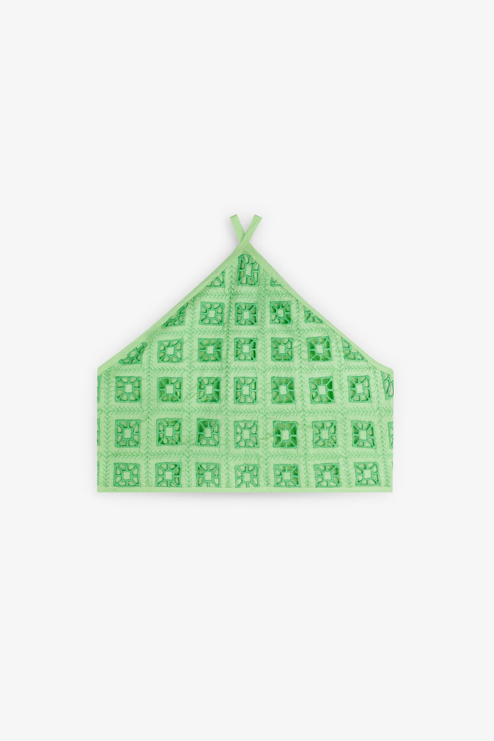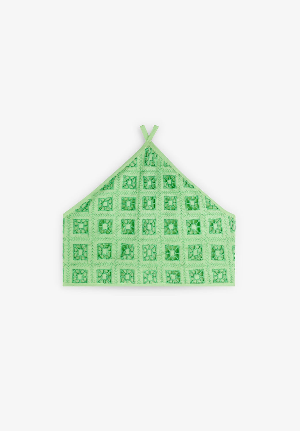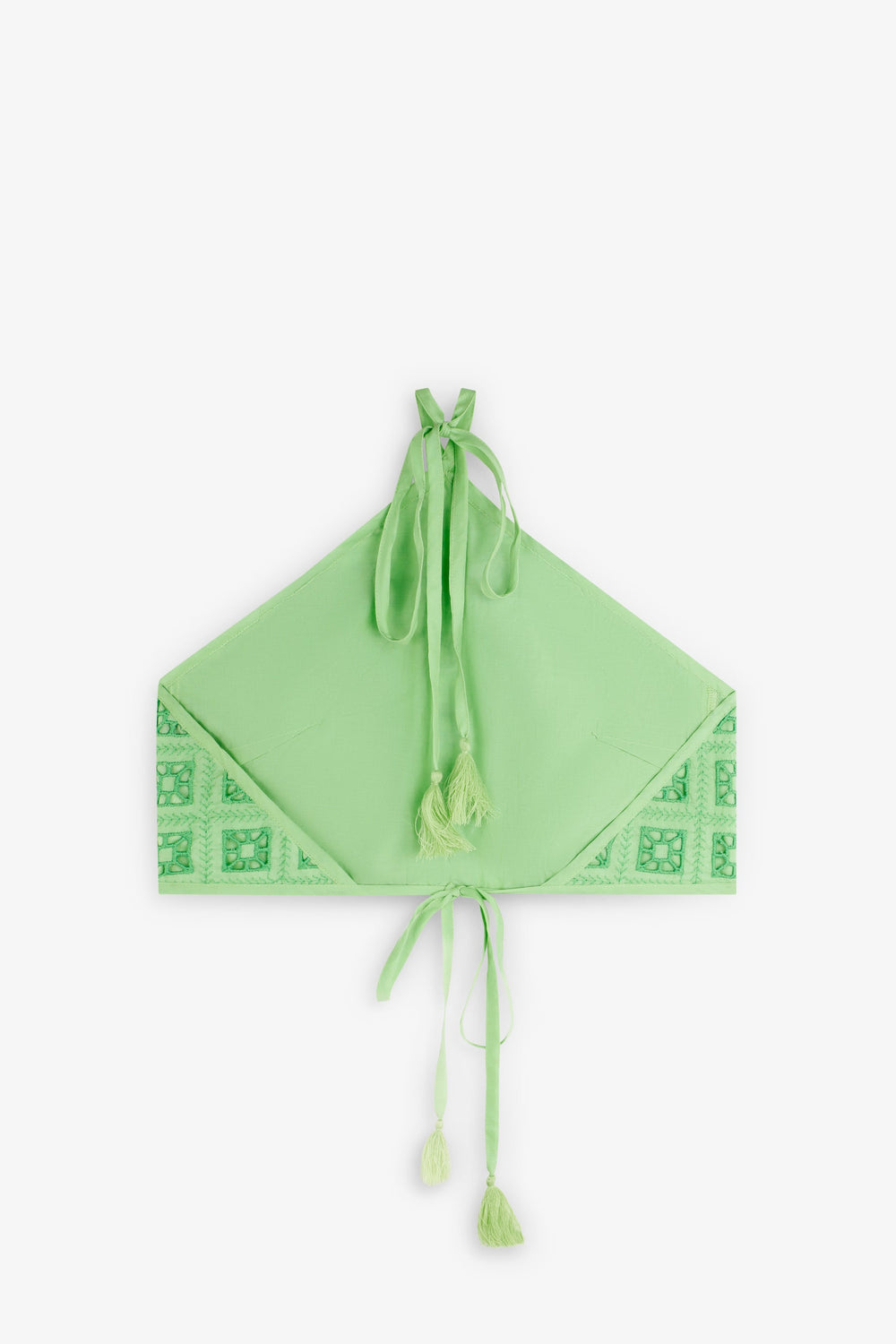 100% cotton top with embroidered details. Cropped cut, halter neck with lacing at neck and back. Open back.