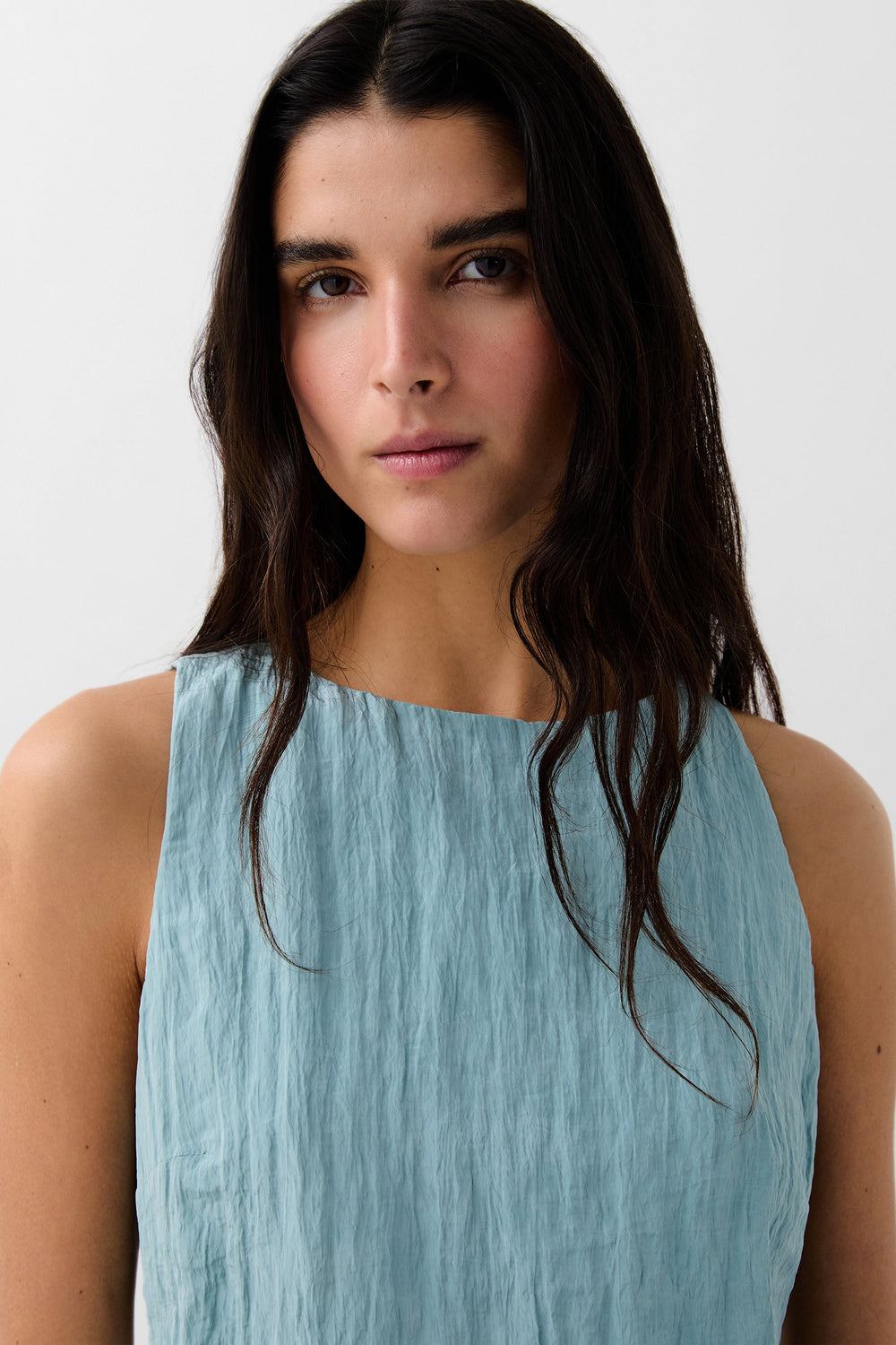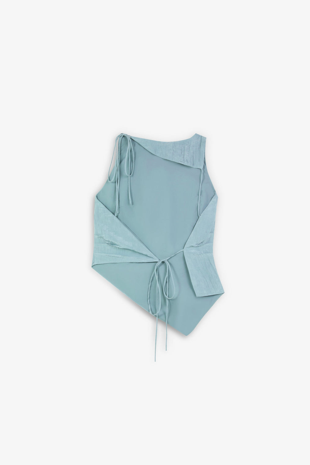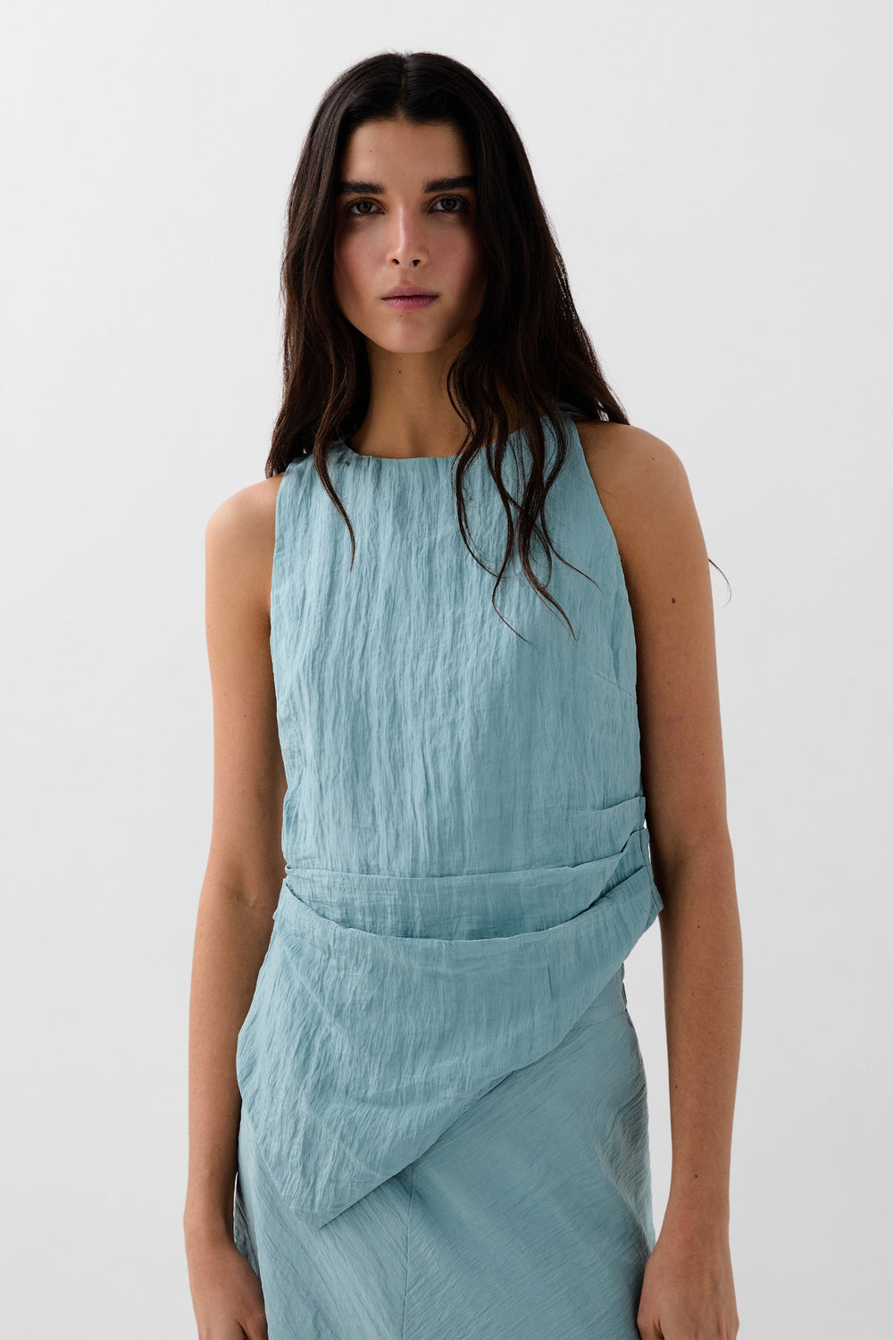 Sleeveless top with round neck and open back. Fitted waist. Asymmetrical hem. Adjustable back fastening with ties at shoulder and waist.