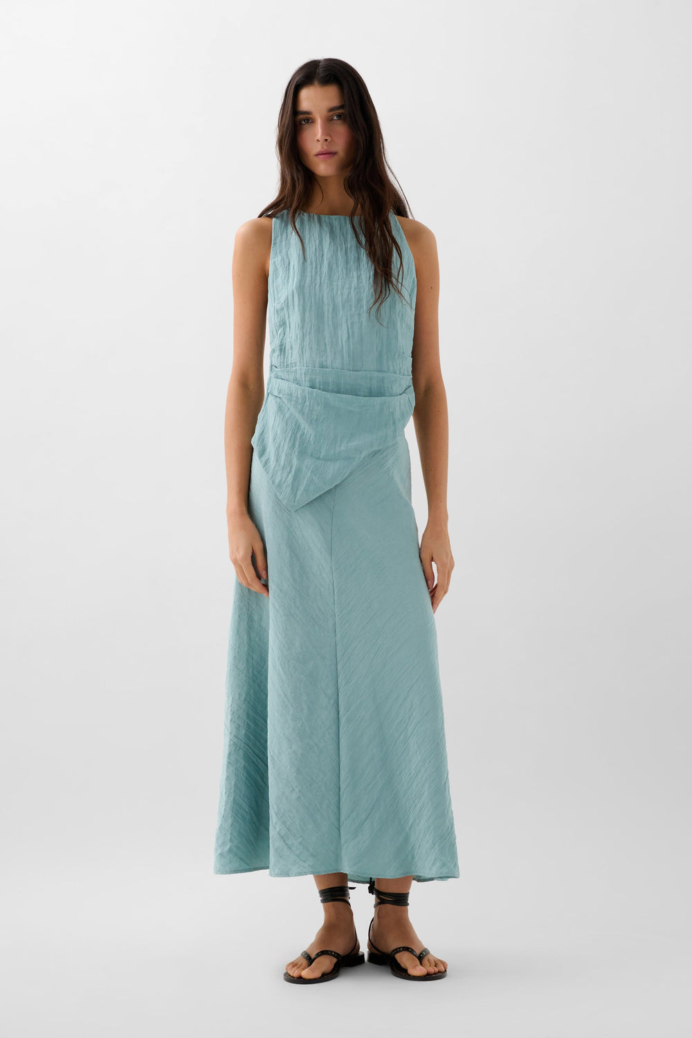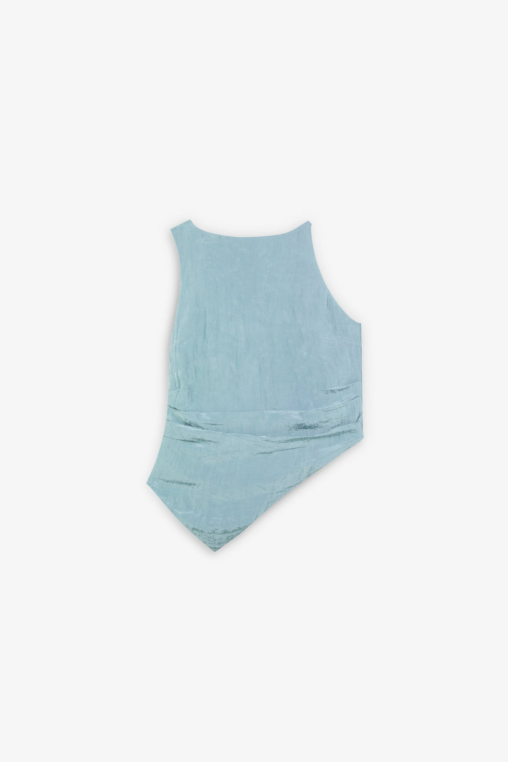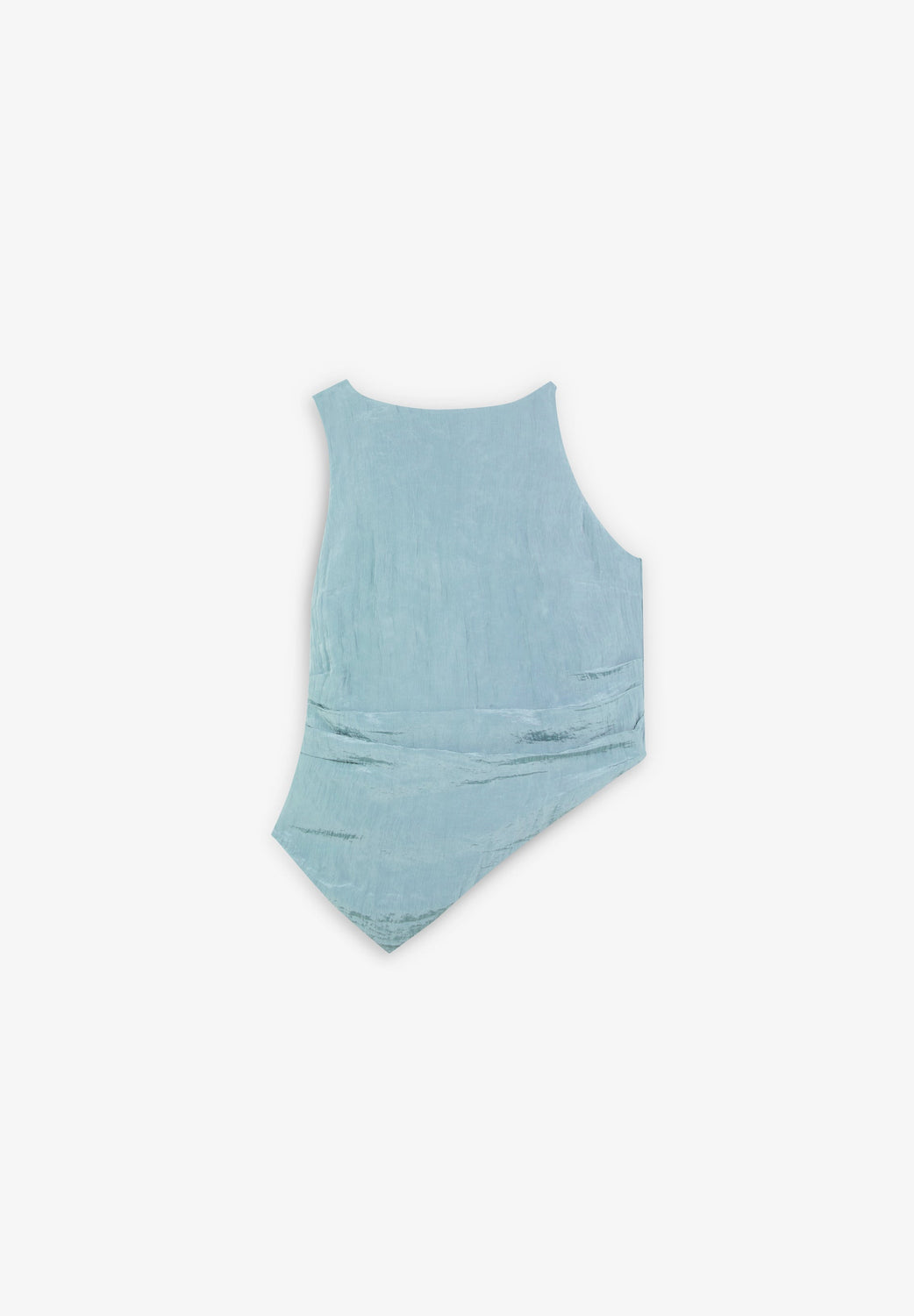 Sleeveless top with round neck and open back. Fitted waist. Asymmetrical hem. Adjustable back fastening with ties at shoulder and waist.
