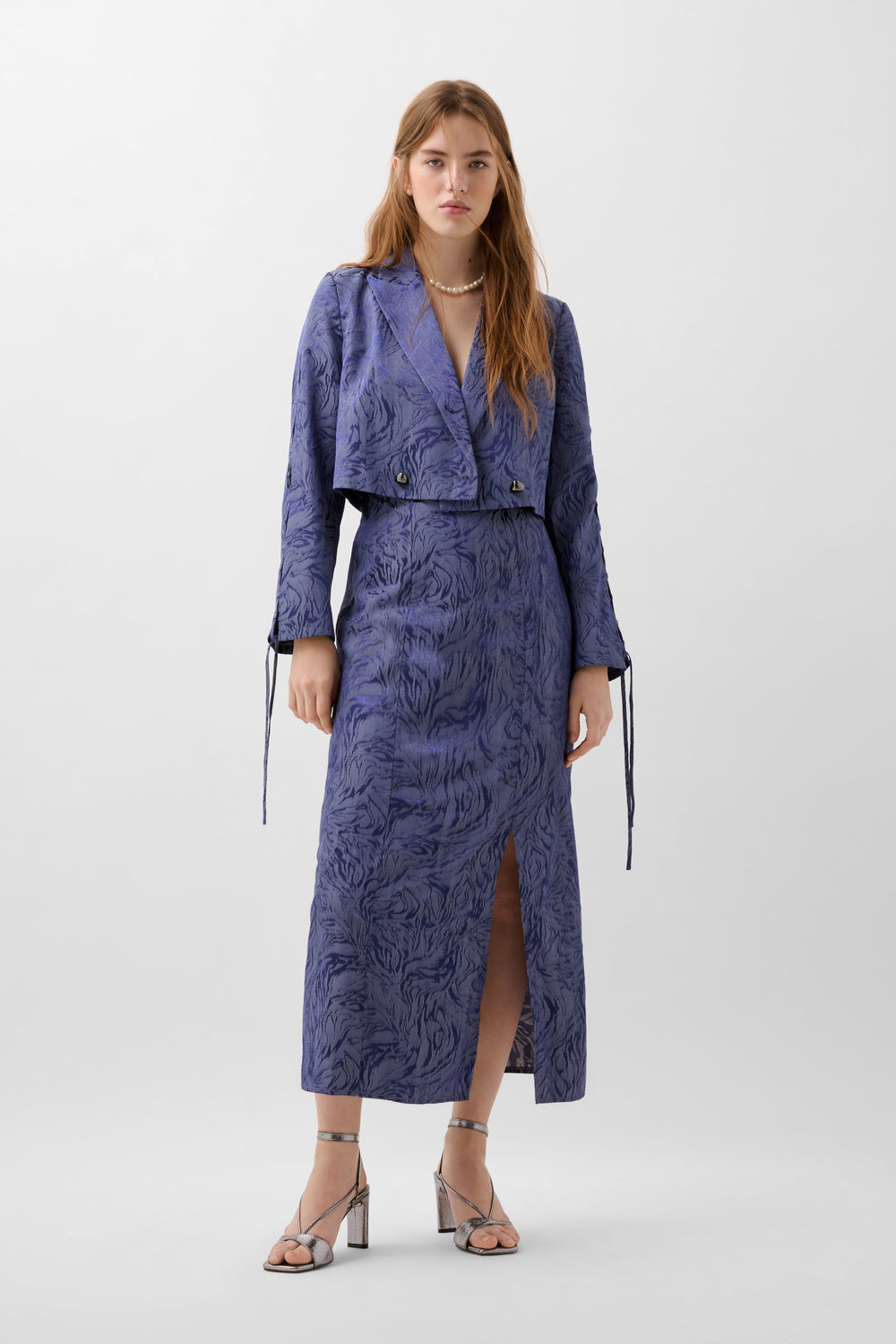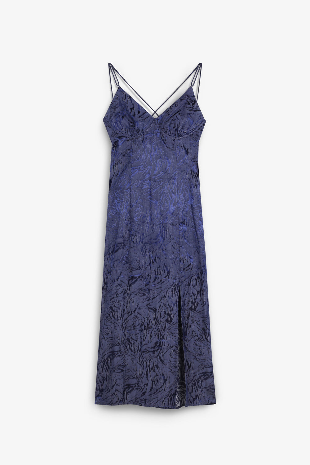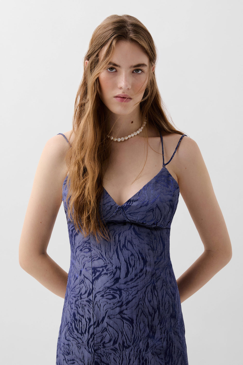 Dress made of jacquard fabric. Slim fit, V-neckline and zip fastening. Thin straps that end in a bow. Front side slit.
