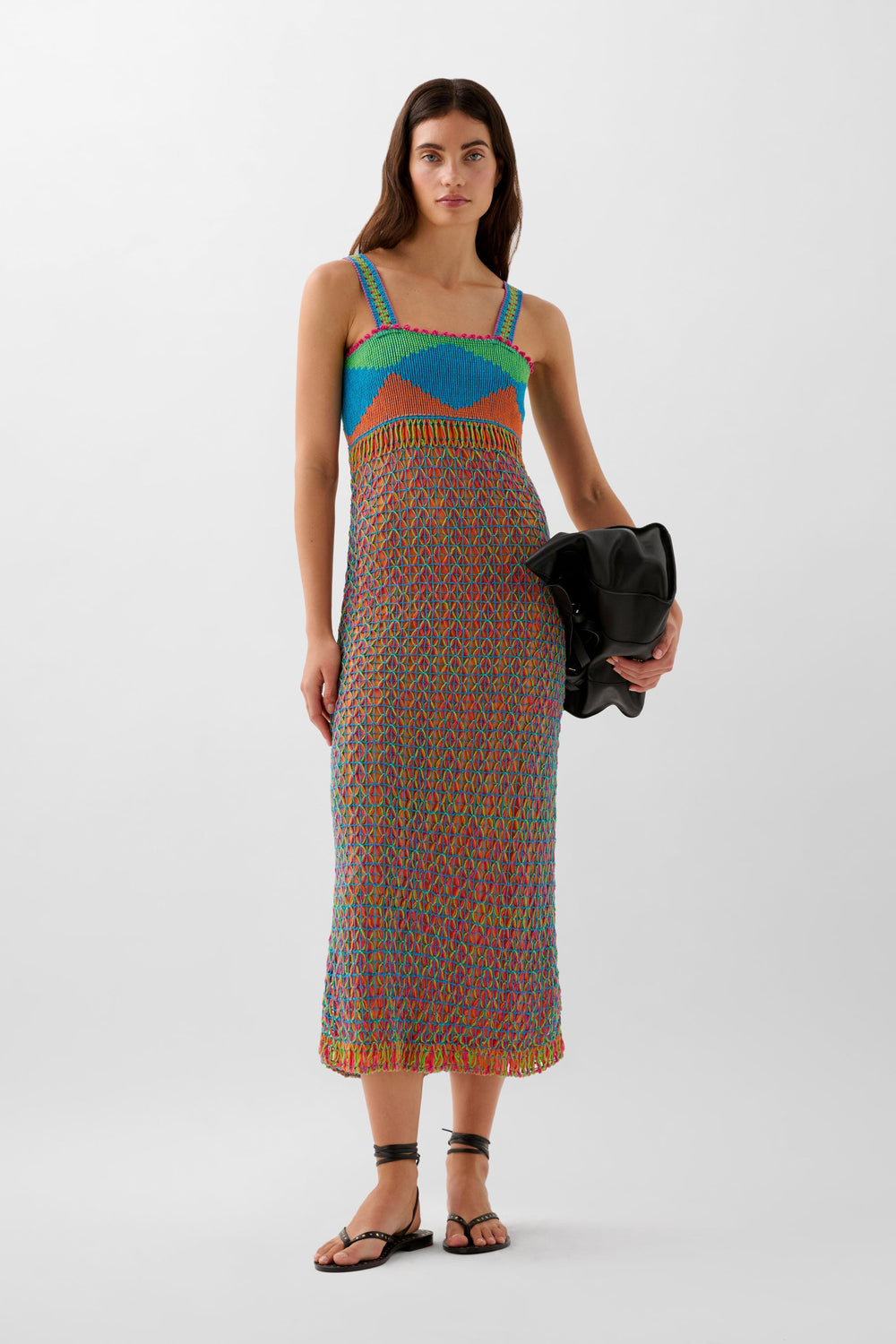 Slightly stretchy crochet dress with multi-coloured print. Slim fit, midi and spaghetti straps. Lined.